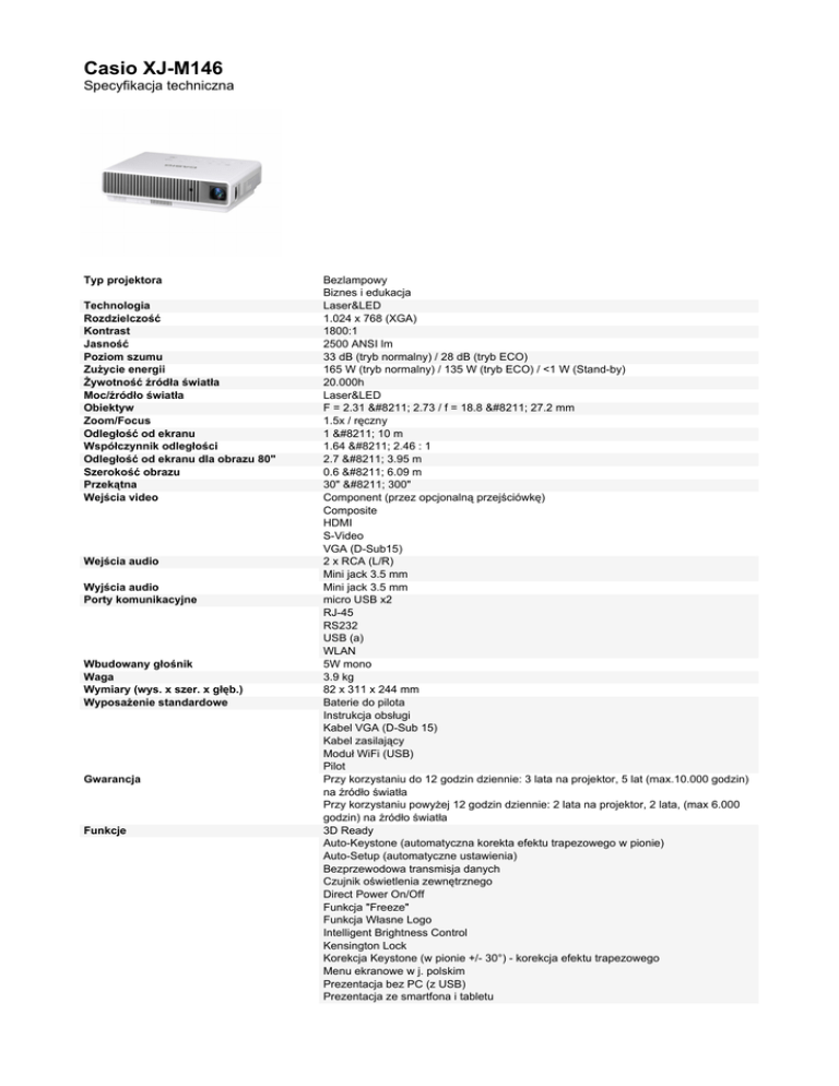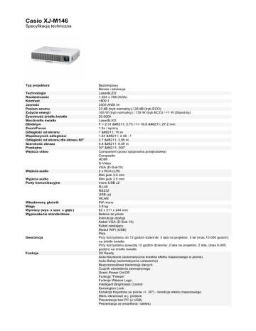 Casio XJ-M146 Specyfikacja techniczna Typ projektora Technologia Rozdzielczość Kontrast Jasność Poziom szumu Zużycie energii Żywotność źródła światła Moc/źródło światła Obiektyw Zoom/Focus Odległość od ekranu Współczynnik odległości Odległość od ekranu dla obrazu 80" Szerokość obrazu Przekątna Wejścia video Wejścia audio Wyjścia audio Porty komunikacyjne Wbudowany głośnik Waga Wymiary (wys. x szer. x głęb.) Wyposażenie standardowe Gwarancja Funkcje Bezlampowy Biznes i edukacja Laser&LED 1.024 x 768 (XGA) 1800:1 2500 ANSI lm 33 dB (tryb normalny) / 28 dB (tryb ECO) 165 W (tryb normalny) / 135 W (tryb ECO) / <1 W (Stand-by) 20.000h Laser&LED F = 2.31 – 2.73 / f = 18.8 – 27.2 mm 1.5x / ręczny 1 – 10 m 1.64 – 2.46 : 1 2.7 – 3.95 m 0.6 – 6.09 m 30" – 300" Component (przez opcjonalną przejściówkę) Composite HDMI S-Video VGA (D-Sub15) 2 x RCA (L/R) Mini jack 3.5 mm Mini jack 3.5 mm micro USB x2 RJ-45 RS232 USB (a) WLAN 5W mono 3.9 kg 82 x 311 x 244 mm Baterie do pilota Instrukcja obsługi Kabel VGA (D-Sub 15) Kabel zasilający Moduł WiFi (USB) Pilot Przy korzystaniu do 12 godzin dziennie: 3 lata na projektor, 5 lat (max.10.000 godzin) na źródło światła Przy korzystaniu powyżej 12 godzin dziennie: 2 lata na projektor, 2 lata, (max 6.000 godzin) na źródło światła 3D Ready Auto-Keystone (automatyczna korekta efektu trapezowego w pionie) Auto-Setup (automatyczne ustawienia) Bezprzewodowa transmisja danych Czujnik oświetlenia zewnętrznego Direct Power On/Off Funkcja "Freeze" Funkcja Własne Logo Intelligent Brightness Control Kensington Lock Korekcja Keystone (w pionie +/- 30°) - korekcja efektu trapezowego Menu ekranowe w j. polskim Prezentacja bez PC (z USB) Prezentacja ze smartfona i tabletu Sterowanie i zarządzanie przez sieć Szybkie włączanie i wyłączanie Timer prezentacji Transmisja obrazu przez LAN Transmisja obrazu przez USB Transmisja obrazu przez WiFi Tryb tablicy kolorowej USB Display Wbudowana pamięc 2Gb