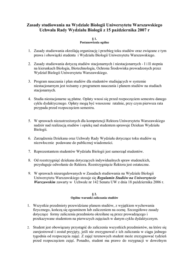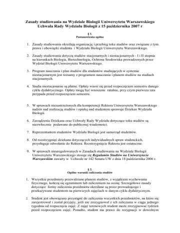 Zasady studiowania na Wydziale Biologii Uniwersytetu Warszawskiego Uchwała Rady Wydziału Biologii z 15 października 2007 r § 1. Postanowienia ogólne 1. Zasady studiowania określają organizację i przebieg toku studiów oraz związane z tym prawa i obowiązki studenta i Wydziału Biologii Uniwersytetu Warszawskiego. 2. Zasady studiowania dotyczą studiów stacjonarnych i niestacjonarnych - I i II stopnia na kierunkach Biologia, Biotechnologia, Ochrona Środowiska prowadzonych przez Wydział Biologii Uniwersytetu Warszawskiego. 3. Program nauczania i plan studiów dla studentów studiujących w systemie niestacjonarnym jest tożsamy z programem nauczania i planem studiów na studiach stacjonarnych. 4. Studia niestacjonarne są płatne. Opłaty wnosi się przed rozpoczęciem semestru danego cyklu dydaktycznego. Opłaty mogą być wnoszone ratalnie, przy czym pierwsza rata przypada przed rozpoczęciem semestru. 5. W sprawach niezastrzeżonych dla kompetencji Rektora Uniwersytetu Warszawskiego nadzór nad realizacją studiów i opiekę nad studentem sprawuje Dziekan Wydziału Biologii. 6. Zarządzenia Dziekana oraz Uchwały Rady Wydziału dotyczące toku studiów są niezwłocznie podawane do publicznej wiadomości. 7. Reprezentantem studentów Wydziału Biologii jest samorząd studentów. 8. Od rozstrzygnięć dziekana dotyczących indywidualnych spraw studenckich, przysługuje odwołanie do Rektora. Rozstrzygnięcie Rektora jest ostateczne. 9. W sprawach nieuregulowanych w Zasadach studiowania na Wydziale Biologii Uniwersytetu Warszawskiego stosuje się Regulamin Studiów na Uniwersytecie Warszawskim zawarty w Uchwale nr 142 Senatu UW z dnia 18 października 2006 r. § 2. Ogólne warunki zaliczania studiów 1. Wszystkie przedmioty przewidziane planem studiów, z wyjątkiem wychowania fizycznego, kończą się egzaminem lub zaliczeniem na ocenę. Szczegółowe zasady dotyczące formy zaliczenia przedmiotu określane są przez prowadzącego i przekazywane studentom na pierwszych zajęciach w danym cyklu dydaktycznym. 2. Student jest obowiązany przystąpić do zaliczenia wszystkich przedmiotów, na które się zarejestrował i został przyjęty, jeśli nie zrezygnował z ich zaliczania w ciągu jednego tygodnia od rozpoczęcia zajęć. Z zajęć terenowych student może zrezygnować tydzień przed rozpoczęciem zajęć. Ponadto, student ma prawo do rezygnacji w dowolnym czasie trwania zajęć, z uczestnictwa w jednym przedmiocie, na który się zarejestrował w trakcie trwania studiów I stopnia oraz w jednym w trakcie studiów II stopnia. O rezygnacji z zajęć student zobowiązany jest pisemnie powiadomić prodziekana ds. studenckich. 3. Zaliczenie cyklu dydaktycznego następuje po zaliczeniu przez studenta obowiązujących w planie studiów przedmiotów i uzyskaniu minimum 60 punktów ECTS. 4. Nadwyżkę punktów ECTS ponad 60, uzyskaną w danym cyklu dydaktycznym, student może zgłosić do rozliczenia w kolejnych cyklach dydaktycznych. Nadwyżka uzyskana w trakcie studiów I stopnia może być zgłoszona do zaliczenia na studiach II stopnia pod warunkiem, że nie została wykorzystana na studiach I stopnia. § 3. Studia I stopnia 1. Studenci przyjęci na I rok studiów studiują zgodnie z programem nauczania dla danego kierunku studiów i są zobowiązani do zaliczenia przedmiotów zgodnie z wymaganiami dla określonego kierunku studiów. 2. Studenci I i II roku mają obowiązek, w wyznaczonym przez dziekana terminie, złożenia w sekcji studenckiej dziekanatu wypełnionej i podpisanej „Karty informacyjnej studenta” zawierającej listę wszystkich przedmiotów, na jakie będą uczęszczali w danym roku akademickim. 3. Studenci studiów I stopnia są obowiązani do zdania egzaminu certyfikującego z wybranego języka obcego na poziomie B2. Do tego egzaminu student może przystąpić bez konieczności udziału w lektoratach. Student, który zamierza uzyskać certyfikat z innego języka obcego niż język angielski, obowiązany jest zaliczyć podczas pierwszych dwóch lat studiów I stopnia lektorat z języka angielskiego w wymiarze 240 godzin. 4. Zajęcia z wychowania fizycznego, w wymiarze 120 godzin, student jest obowiązany zaliczyć podczas pierwszych dwóch lat studiów. 5. Po zakończeniu II roku studiów I stopnia studenci są obowiązani do odbycia 4tygodniowej praktyki zawodowej przewidzianej programem nauczania i planem studiów. 6. W trakcie III roku studiów I stopnia studenci wykonują pracę licencjacką odbywając pracownię licencjacką. Studenci wszystkich kierunków studiów mogą wykonywać pracę licencjacką pod kierunkiem opiekunów naukowych w każdym Instytucie, Zakładzie lub Pracowni Wydziału Biologii prowadzącym badania o tematyce związanej z danym kierunkiem studiów. Pracę licencjacką wykonuje się wyłącznie na Wydziale Biologii. Studia kończą się egzaminem dyplomowym i nadaniem tytułu zawodowego licencjata. § 4. Studia II stopnia 1. Studenci przyjęci na I rok studiów II stopnia określonego kierunku studiów, zobowiązani są do realizacji obowiązującego programu nauczania i planu studiów dla tego kierunku i wybranej specjalności. 2. Studenci wszystkich kierunków studiów mogą wykonywać pracę magisterską w każdym Instytucie, Zakładzie lub Pracowni Wydziału Biologii prowadzącym badania o tematyce związanej z danym kierunkiem studiów. 3. Studia II stopnia mają charakter indywidualny i odbywają się pod kierunkiem opiekunów naukowych, wybranych przez studentów w porozumieniu z kierownikiem Zakładu, Pracowni lub dyrektorem Instytutu niepodzielonego na Zakłady. 4. Wyjazdy na stypendia zagraniczne student odbywa wyłącznie za pisemną zgodą opiekuna naukowego pracy magisterskiej, którą musi uzyskać przed staraniem się o stypendium zagraniczne. 5. Na wniosek opiekuna naukowego pracy magisterskiej Rada Wydziału może wyrazić indywidualną zgodę na wykonanie eksperymentalnej części pracy magisterskiej poza Wydzia