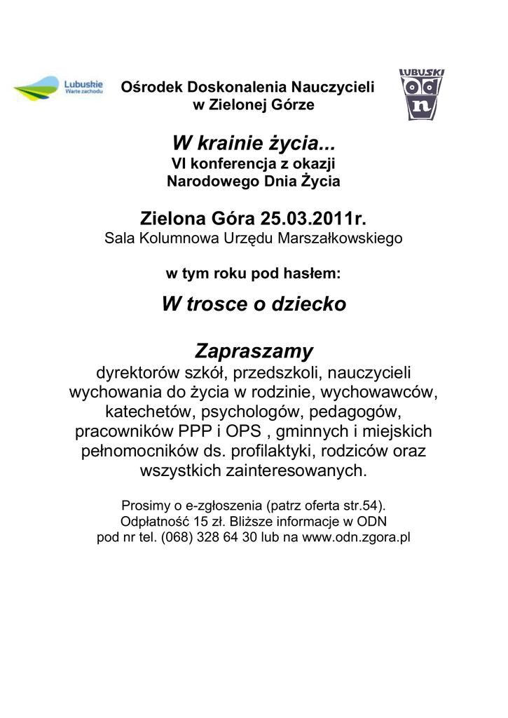 Ośrodek Doskonalenia Nauczycieli w Zielonej Górze W krainie życia... VI konferencja z okazji Narodowego Dnia Życia Zielona Góra 25.03.2011r. Sala Kolumnowa Urzędu Marszałkowskiego w tym roku pod hasłem: W trosce o dziecko Zapraszamy dyrektorów szkół, przedszkoli, nauczycieli wychowania do życia w rodzinie, wychowawców, katechetów, psychologów, pedagogów, pracowników PPP i OPS , gminnych i miejskich pełnomocników ds. profilaktyki, rodziców oraz wszystkich zainteresowanych. Prosimy o e-zgłoszenia (patrz oferta str.54). Odpłatność 15 zł. Bliższe informacje w ODN pod nr tel. (068) 328 64 30 lub na www.odn.zgora.pl