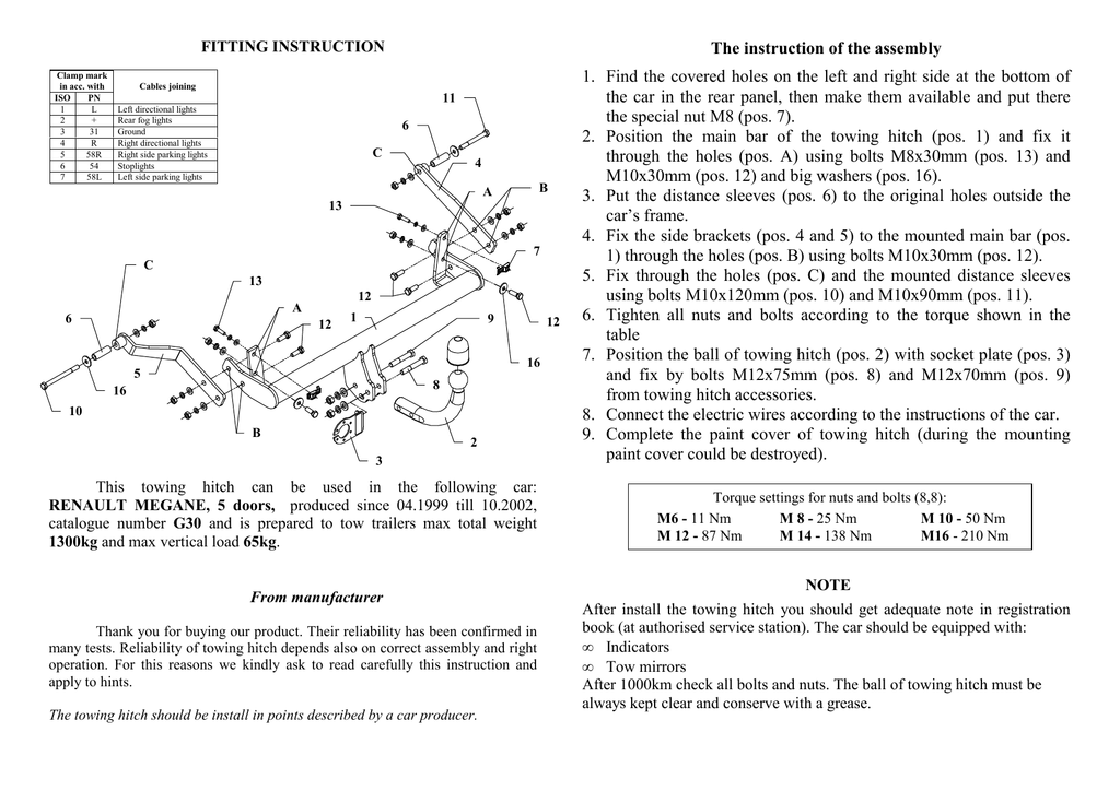FITTING INSTRUCTION Clamp mark in acc. with ISO PN 1 L 2 + 3 31 4 R 5 58R 6 54 7 58L The instruction of the assembly Cables joining 11 Left directional lights Rear fog lights Ground Right directional lights Right side parking lights Stoplights Left side parking lights 6 C 4 V B A 13 7 C 13 12 A 6 12 1 9 12 16 5 8 16 10 B 2 3 This towing hitch can be used in the following car: RENAULT MEGANE, 5 doors, produced since 04.1999 till 10.2002, catalogue number G30 and is prepared to tow trailers max total weight 1300kg and max vertical load 65kg. From manufacturer Thank you for buying our product. Their reliability has been confirmed in many tests. Reliability of towing hitch depends also on correct assembly and right operation. For this reasons we kindly ask to read carefully this instruction and apply to hints. The towing hitch should be install in points described by a car producer. 1. Find the covered holes on the left and right side at the bottom of the car in the rear panel, then make them available and put there the special nut M8 (pos. 7). 2. Position the main bar of the towing hitch (pos. 1) and fix it through the holes (pos. A) using bolts M8x30mm (pos. 13) and M10x30mm (pos. 12) and big washers (pos. 16). 3. Put the distance sleeves (pos. 6) to the original holes outside the car’s frame. 4. Fix the side brackets (pos. 4 and 5) to the mounted main bar (pos. 1) through the holes (pos. B) using bolts M10x30mm (pos. 12). 5. Fix through the holes (pos. C) and the mounted distance sleeves using bolts M10x120mm (pos. 10) and M10x90mm (pos. 11). 6. Tighten all nuts and bolts according to the torque shown in the table 7. Position the ball of towing hitch (pos. 2) with socket plate (pos. 3) and fix by bolts M12x75mm (pos. 8) and M12x70mm (pos. 9) from towing hitch accessories. 8. Connect the electric wires according to the instructions of the car. 9. Complete the paint cover of towing hitch (during the mounting paint cover could be destroyed). Torque settings for nuts and bolts (8,8): M6 - 11 Nm M 8 - 25 Nm M 10 - 50 Nm M 12 - 87 Nm M 14 - 138 Nm M16 - 210 Nm NOTE After install the towing hitch you should get adequate note in registration book (at authorised service station). The car should be equipped with: • Indicators • Tow mirrors After 1000km check all bolts and nuts. The ball of towing hitch must be always kept clear and conserve with a grease. PPUH AUTO-HAK S. J. Towing hitch accessories: Produkcja Zaczepów Kulowych Henryk & Zbigniew Nejman 76-200 SŁUPSK ul. Słoneczna 16K tel/fax (059) 8-414-414; 8-414-413 E-mail: [email protected] www.autohak.com.pl Towing hitch (without electrical set) Class: A50-X Cat. no. G30 Technical data: D-value: 7,17 kN maximum trailer weight: 1300 kg maximum vertical cup load: 65 kg Designed for: Manufacturer: RENAULT Model: MEGANE Type: 5 doors produced since 04.1999 till 10.2002 Approval number acc. to regulations EKG/ONZ 55.01: E20-55R-01 0803 Foreword This towing hitch is designed according to rules of safety traffic regulations. The towing hitch is a safety component and must be installed only by qualified personnel. Any alteration or conversion to the towinh hitch is prohibited and would lead to cancellation of design certification. Remove insulating compound and underseal from vehicle (if present) in the area of the matting surfaces of the towing hitch. The vehicle manufacturer’s specifications regarding trailer load and max. vertical cup load are decisive for driving, and values for the towing hitch cannot be exceeded. D-value formula: Max trailer weight [kg] x Max vehicle weight [kg] 9,81 X = D [kN] 1000 Max trailer weight [kg] + Max vehicle weight [kg] INSTRUCTION De montage et d’exploitation du dispositif d'attelage à boule Désignation de borne selon la norme ISO PN 1 L 2 3 + 31 4 R 5 6 7 58R 54 58L Instructions de montage 11 Connexion des câbles 6 Pour indicateurs de direction gauche Feux de brouillard arrière Au poids du véhicule Pour indicateurs de direction droite Feux de circulation droites Pour feux de freinage Feux de circulation gauches C V 4 B A 13 7 C 13 12 A 6 12 1 9 12 16 5 8 16 10 B 2 3 Le dispositif d'attelage à boule est conçu pour être monté dans la voiture: RENAULT MEGANE, 5 portes, produit à partir de 04.1999 au 10.2002, numéro de catalogue G30 et est utilisé pour tirer des remorques du poids total 1300 kg et de la pression totale sur la boule max 65 kg. 1. Au dessous du véhicule dans le panneau arrière, trouver les trous bouchonnés, du côté gauche et droit (les trous supérieurs de l’attelage). Il faut les déboucher et y mettre « les cages » avec l’écrou M8 (pos. 7). 2. Placer la poutre principale (pos.1) au dessous du véhicule et serrer à travers des trous (pos.A) à l’aide des vis M8x30mm (pos.13) et M10x30mm (pos.12). Utiliser les grandes rondelles (pos. 16). 3. Mettre les douilles d’écartement (pos. 6) dans les trous d’origine des longerons, du côté extérieur. 4. Serrer les appuis latéraux (pos. 4 et 5) à la poutre de l’attelage (pos. 1) à travers des trous (pos. B) à l’aide des vis M10x30mm (pos. 12). 5. Serrer à l’aide des vis M10x120mm (pos. 10) et M10x90mm (pos. 11) à travers des douilles d’écartement montés dans les longerons et à travers des trous de l’attelage. 6. Fixer la boule d’attelage (pos. 2) avec la tôle sous la prise (pos. 3) à l’aide des vis M12x75mm (pos. 8) et M12x70mm (pos. 9). 7. Connecter les câbles de la prise 7 – à l'installation électrique en conformité avec les instructions d'une usine automobile (recommandé la mise en œuvre d’une station-service autorisée). 8. Remplir des pertes de peinture causées durant l'installation. Couples de serrage recommandé pour les vis et les écrous 8,8: M6 - 11 Nm M 8 - 25 Nm M 10 - 50 Nm M 12 - 87 Nm M 14 - 138 Nm M16 - 210 Nm Attention DE LA PART DU FABRICANT Merci d'avoir choisi le dispositif d'attelage à boule produit par notre société. Son fiabilité a été confirmée dans de 