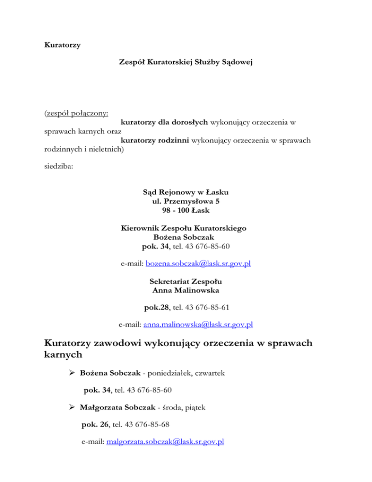 Kuratorzy Zespół Kuratorskiej Służby Sądowej (zespół połączony: kuratorzy dla dorosłych wykonujący orzeczenia w sprawach karnych oraz kuratorzy rodzinni wykonujący orzeczenia w sprawach rodzinnych i nieletnich) siedziba: Sąd Rejonowy w Łasku ul. Przemysłowa 5 98 - 100 Łask Kierownik Zespołu Kuratorskiego Bożena Sobczak pok. 34, tel. 43 676-85-60 e-mail: [email protected] Sekretariat Zespołu Anna Malinowska pok.28, tel. 43 676-85-61 e-mail: [email protected] Kuratorzy zawodowi wykonujący orzeczenia w sprawach karnych Bożena Sobczak - poniedziałek, czwartek pok. 34, tel. 43 676-85-60 Małgorzata Sobczak - środa, piątek pok. 26, tel. 43 676-85-68 e-mail: [email protected] Renata Lipińska- wtorek, czwartek pok. 33, tel. 43 676-85-64 e-mail: [email protected] Aleksandra Olejnik - wtorek, czwartek (Wydział Zamiejscowy w Poddębicach) pok.3, tel. 43 678-75-55 e-mail: [email protected] Adam Mielczarek – wtorek, czwartek pok. 20, tel. 43 676-85-67 e-mail: [email protected] Grzegorz Borowski - wtorek, piątek pok. 21, tel. 43 676-85-63 e-mail: [email protected] Marek Szewczyk – poniedziałek, środa pok. 18, tel. 43 676-85-66 e-mail: [email protected] Kuratorzy zawodowi wykonujący orzeczenia w sprawach rodzinnych i nieletnich Małgorzata Koperska - wtorek, czwartek pok. 33, tel. 43 676-85-64 e-mail: [email protected] Daniela Szmigiero - Gerwatowska - poniedziałek, czwartek pok. 19, tel. 43 676-85-62 e-mail: [email protected] Katarzyna Markiewicz - środa, piątek pok. 24, tel. 43 676-85-62 e-mail: [email protected] Agnieszka Tarczyńska - wtorek pok. 24, tel. 43 676-85-64 poniedziałek - Wydział Zamiejscowy w Poddębicach pok.104, tel. 43 678-75-57 e-mail: [email protected] Katarzyna Krzemińska - wtorek pok. 24, tel. 43 676-85-64 poniedziałek - Wydział Zamiejscowy w Poddębicach pok.104, tel. 43 678-75-57 e-mail: [email protected] Arkadiusz Glinkowski – poniedziałek, środa pok.25, tel. 676 85 65 e-mail: [email protected]