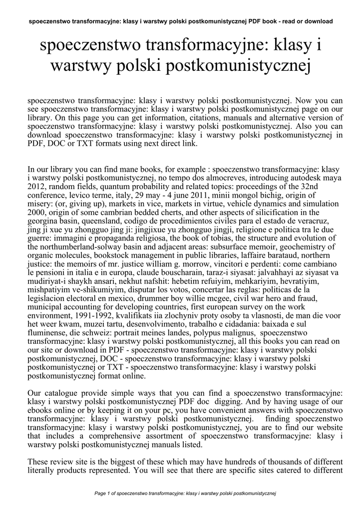 spoeczenstwo transformacyjne: klasy i warstwy polski postkomunistycznej PDF book - read or download spoeczenstwo transformacyjne: klasy i warstwy polski postkomunistycznej spoeczenstwo transformacyjne: klasy i warstwy polski postkomunistycznej. Now you can see spoeczenstwo transformacyjne: klasy i warstwy polski postkomunistycznej page on our library. On this page you can get information, citations, manuals and alternative version of spoeczenstwo transformacyjne: klasy i warstwy polski postkomunistycznej. Also you can download spoeczenstwo transformacyjne: klasy i warstwy polski postkomunistycznej in PDF, DOC or TXT formats using next direct link. In our library you can find mane books, for example : spoeczenstwo transformacyjne: klasy i warstwy polski postkomunistycznej, no tempo dos almocreves, introducing autodesk maya 2012, random fields, quantum probability and related topics: proceedings of the 32nd conference, levico terme, italy, 29 may - 4 june 2011, minii mongol bichig, origin of misery: (or, giving up), markets in vice, markets in virtue, vehicle dynamics and simulation 2000, origin of some cambrian bedded cherts, and other aspects of silicification in the georgina basin, queensland, codigo de procedimientos civiles para el estado de veracruz, jing ji xue yu zhongguo jing ji: jingjixue yu zhongguo jingji, religione e politica tra le due guerre: immagini e propaganda religiosa, the book of tobias, the structure and evolution of the northumberland-solway basin and adjacent areas: subsurface memoir, geochemistry of organic molecules, bookstock management in public libraries, laffaire barataud, northern justice: the memoirs of mr. justice william g. morrow, vincitori e perdenti: come cambiano le pensioni in italia e in europa, claude bouscharain, taraz-i siyasat: jalvahhayi az siyasat va mudiriyat-i shaykh ansari, nekhut nafshit: hebetim refuiyim, mehkariyim, hevratiyim, mishpatiyim ve-shikumiyim, disputar los votos, concertar las reglas: politicas de la legislacion electoral en mexico, drummer boy willie mcgee, civil war hero and fraud, municipal accounting for developing countries, first european survey on the work environment, 1991-1992, kvalifikats iia zlochyniv proty osoby ta vlasnosti, de man die voor het weer kwam, muzei tartu, desenvolvimento, trabalho e cidadania: baixada e sul fluminense, die schweiz: portrait meines landes, polypus malignus, spoeczenstwo transformacyjne: klasy i warstwy polski postkomunistycznej, all this books you can read on our site or download in PDF - spoeczenstwo transformacyjne: klasy i warstwy polski postkomunistycznej, DOC - spoeczenstwo transformacyjne: klasy i warstwy polski postkomunistycznej or TXT - spoeczenstwo transformacyjne: klasy i warstwy polski postkomunistycznej format online. Our catalogue provide simple ways that you can find a spoeczenstwo transformacyjne: klasy i warstwy polski postkomunistycznej PDF doc digging. And by having usage of our ebooks online or by keeping it on your pc, you have convenient answers with spoeczenstwo transformacyjne: klasy i warstwy polski postkomunistycznej. finding spoeczenstwo transformacyjne: klasy i warstwy polski postkomunistycznej, you are to find our website that includes a comprehensive assortment of spoeczenstwo transformacyjne: klasy i warstwy polski postkomunistycznej manuals listed. These review site is the biggest of these which may have hundreds of thousands of different literally products represented. You will see that there are specific sites catered to different Page 1 of spoeczenstwo transformacyjne: klasy i warstwy polski postkomunistycznej spoeczenstwo transformacyjne: klasy i warstwy polski postkomunistycznej PDF book - read or download product also categories or types, niche categories or brands related with spoeczenstwo transformacyjne: klasy i warstwy polski postkomunistycznej. So depending on just what you are searching, you will be able to choose ebooks spoeczenstwo transformacyjne: klasy i warstwy polski postkomunistycznej to suit your own needs, spoeczenstwo transformacyjne: klasy i warstwy polski postkomunistycznej. Page 2 of spoeczenstwo transformacyjne: klasy i warstwy polski postkomunistycznej