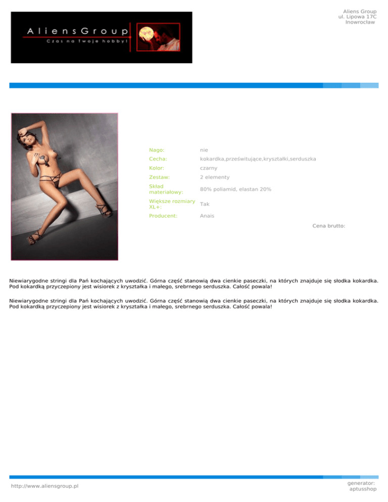 Aliens Group ul. Lipowa 17C Inowrocław Nago: nie Cecha: kokardka,prześwitujące,kryształki,serduszka Kolor: czarny Zestaw: 2 elementy Skład materiałowy: 80% poliamid, elastan 20% Większe rozmiary Tak XL+: Producent: Anais Cena brutto: Niewiarygodne stringi dla Pań kochających uwodzić. Górna część stanowią dwa cienkie paseczki, na których znajduje się słodka kokardka. Pod kokardką przyczepiony jest wisiorek z kryształka i małego, srebrnego serduszka. Całość powala! Niewiarygodne stringi dla Pań kochających uwodzić. Górna część stanowią dwa cienkie paseczki, na których znajduje się słodka kokardka. Pod kokardką przyczepiony jest wisiorek z kryształka i małego, srebrnego serduszka. Całość powala! http://www.aliensgroup.pl generator: aptusshop