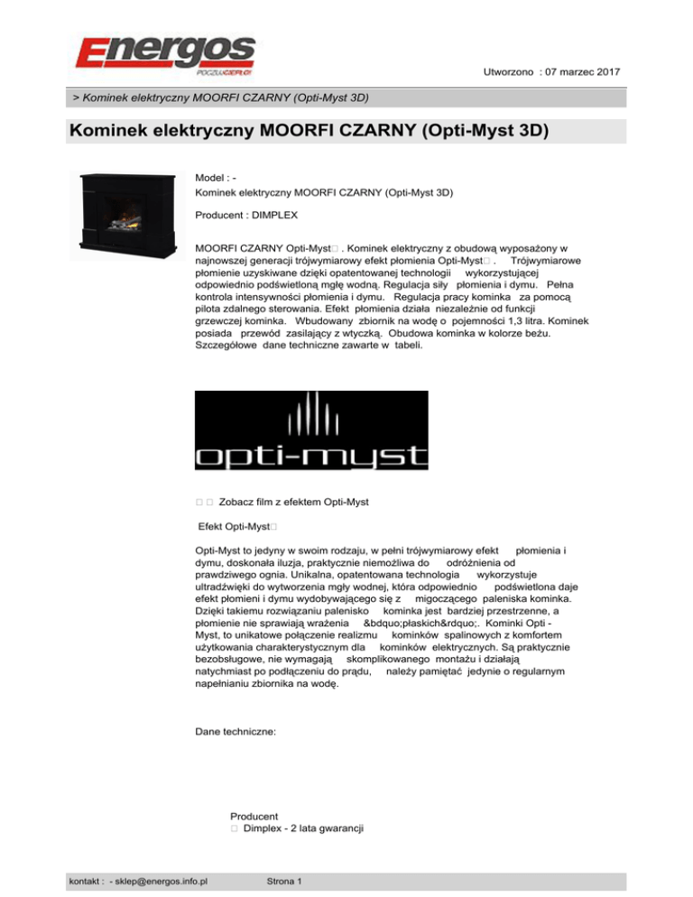 Utworzono : 07 marzec 2017 > Kominek elektryczny MOORFI CZARNY (Opti-Myst 3D) Kominek elektryczny MOORFI CZARNY (Opti-Myst 3D) Model : Kominek elektryczny MOORFI CZARNY (Opti-Myst 3D) Producent : DIMPLEX MOORFI CZARNY Opti-Myst�. Kominek elektryczny z obudową wyposażony w najnowszej generacji trójwymiarowy efekt płomienia Opti-Myst�. Trójwymiarowe płomienie uzyskiwane dzięki opatentowanej technologii wykorzystującej odpowiednio podświetloną mgłę wodną. Regulacja siły płomienia i dymu. Pełna kontrola intensywności płomienia i dymu. Regulacja pracy kominka za pomocą pilota zdalnego sterowania. Efekt płomienia działa niezależnie od funkcji grzewczej kominka. Wbudowany zbiornik na wodę o pojemności 1,3 litra. Kominek posiada przewód zasilający z wtyczką. Obudowa kominka w kolorze beżu. Szczegółowe dane techniczne zawarte w tabeli. �� Zobacz film z efektem Opti-Myst Efekt Opti-Myst� Opti-Myst to jedyny w swoim rodzaju, w pełni trójwymiarowy efekt płomienia i dymu, doskonała iluzja, praktycznie niemożliwa do odróżnienia od prawdziwego ognia. Unikalna, opatentowana technologia wykorzystuje ultradźwięki do wytworzenia mgły wodnej, która odpowiednio podświetlona daje efekt płomieni i dymu wydobywającego się z migoczącego paleniska kominka. Dzięki takiemu rozwiązaniu palenisko kominka jest bardziej przestrzenne, a płomienie nie sprawiają wrażenia „płaskich”. Kominki Opti Myst, to unikatowe połączenie realizmu kominków spalinowych z komfortem użytkowania charakterystycznym dla kominków elektrycznych. Są praktycznie bezobsługowe, nie wymagają skomplikowanego montażu i działają natychmiast po podłączeniu do prądu, należy pamiętać jedynie o regularnym napełnianiu zbiornika na wodę. Dane techniczne: Producent � Dimplex - 2 lata gwarancji kontakt : - [email protected] Strona 1 Utworzono : 07 marzec 2017 > Kominek elektryczny MOORFI CZARNY (Opti-Myst 3D) Kominek elektryczny MOORFI CZARNY (Opti-Myst 3D) Żródło ciepła �- Efekt płomienia ognia � Opti-Myst + palenisko, płonące polana Moc grzewcza [kW] �- Pobór energii przez efekt świetlny [W] � 212 Wymiary : szer. x wys. x gł. [mm] � 870 x 920 x 315 Kolor � czarny Katalog kominków Optimyst 2013 - pobierz Masz wątpliwości? Chcesz wiedzieć więcej? Czekamy na Twoje pytania. Napisz lub zadzwoń kontakt : - [email protected] Strona 2 Utworzono : 07 marzec 2017 > Kominek elektryczny MOORFI CZARNY (Opti-Myst 3D) Kominek elektryczny MOORFI CZARNY (Opti-Myst 3D) kontakt : - [email protected] Strona 3 Utworzono : 07 marzec 2017 > Kominek elektryczny MOORFI CZARNY (Opti-Myst 3D) Kominek elektryczny MOORFI CZARNY (Opti-Myst 3D) kontakt : - [email protected] Strona 4 Utworzono : 07 marzec 2017 > Kominek elektryczny MOORFI CZARNY (Opti-Myst 3D) Kominek elektryczny MOORFI CZARNY (Opti-Myst 3D) Cena : 3.990,00 zł Brutto ( 3.243,90 zł Netto) Cena promocyjna : 2.395,00 zł Brutto ( 1.947,15 zł Netto) kontakt : - [email protected] Strona 5 Utworzono : 07 marzec 2017 > Kominek elektryczny MOORFI CZARNY (Opti-Myst 3D) Kominek elektryczny MOORFI CZARNY (Opti-Myst 3D) Dostępność: Produkt dostępny w naszym sklepie od 30 wrzesień 2013 kontakt : - [email protected] Strona 6