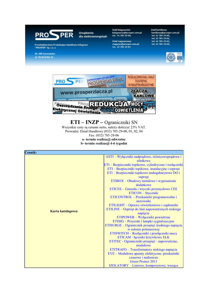 ETI – INZP – Ograniczniki SN Wszystkie ceny są cenami netto, należy doliczyć 23% VAT. Prowadzi: Dział Handlowy (032) 785-29-00, 01, 02, 04 Fax: (032) 785-29-06 a- termin realizacji odwrotny b- termin realizacji 4-6 tygodni Cennik: Karta katalogowa: ASTI – Wyłączniki nadprądowe, różnicowoprądowe i silnikowe ETI – Bezpieczniki topikowe, cylindryczne i rozłączniki ETI – Bezpieczniki topikowe, instalacyjne i osprzęt ETI – Bezpieczniki topikowe małogabarytowe DO i osprzęt ETIBOX – Obudowy metalowe i wyposażenie dodatkowe ETICEE – Gniazda i wtyczki przemysłowe CEE ETICON – Styczniki ETICONTROL – Przekaźniki programowalne i sterowniki ETILIGHT – Oprawy oświetleniowe i zapłonniki ETILINE – Osprzęt do linii napowietrznych niskiego napięcia ETIPOWER – Wyłączniki powietrzne ETISIG – Przyciski i lampki sygnalizacyjne ETISURGE – Ogranicznik przepięć średniego napięcia w osłonie polimerowej ETISWITCH – Rozłączniki i przełączniki mocy ETICAM - łączniki krzywkowe EŁK ETITEC - Ograniczniki przepięć - napowietrzne, modułowe ETITRAFO – Transformatory niskiego napięcia EVE – Modułowe aparaty elektryczne, przekaźniki czasowe i nadzorcze Green Protect 2013 IZOLATORY – Liniowe, kompozytowe, wiszące średniego napięcia ULTRA QUICK – Bezpieczniki topikowe do zabezpieczenia półprzewodników i do specjalnych zastosowań VV – Bezpieczniki topikowe średniego napięcia WT-NH Bezpieczniki topikowe nożowe (przemysłowe). Podstawy BEZP, rozłączniki i osprzęt CENNIK - DATA AKTUALIZACJI: 21-11-2013 - RODZAJ CENY: CENA FABRYCZNA Ilość szt w Nr artykułu Grupa Symbol Nazwa wyrobu Cena 1 szt Realizacja opak Ograniczniki przepięć średniego napięcia Ogranicznik przepięć SN 004211070 ETISURGE INZP1510S Tel. b 2/14 bez wspornika i odłącznika Ogranicznik przepięć SN 004211080 ETISURGE INZP1810S Tel. b 2/14 bez wspornika i odłącznika Ogranicznik przepięć SN 004211090 ETISURGE INZP2110S Tel. a 2/14 bez wspornika i odłącznika Ogranicznik przepięć SN 004211100 ETISURGE INZP2410S Tel. b 2/14 bez wspornika i odłącznika Ogranicznik przepięć SN 004211110 ETISURGE INZP2710S Tel. b 2/14 bez wspornika i odłącznika Ogranicznik przepięć SN 004211120 ETISURGE INZP3010S Tel. b 2/12 bez wspornika i odłącznika Ogranicznik przepięć SN 004211130 ETISURGE INZP3310S Tel. b 2/12 bez wspornika i odłącznika Ogranicznik przepięć SN 004211140 ETISURGE INZP3610S Tel. b 2/12 bez wspornika i odłącznika Ogranicznik przepięć SN 004211150 ETISURGE INZP3910S Tel. b 2/12 bez wspornika i odłącznika Ogranicznik przepięć SN 004211160 ETISURGE INZP4210S Tel. b 2/12 bez wspornika i odłącznika Ogranicznik przepięć SN ze 004213010 ETISURGE INZP0310 wspornikiem i Tel. b 1/10 odłącznikiem Ogranicznik przepięć SN ze 004213020 ETISURGE INZP0610 wspornikiem i Tel. b 1/10 odłącznikiem Ogranicznik przepięć SN ze 004213030 ETISURGE INZP0910 wspornikiem i Tel. b 1/10 odłącznikiem Ogranicznik przepięć SN ze 004213040 ETISURGE INZP1010 wspornikiem i Tel. b 1/10 odłącznikiem Ogranicznik przepięć SN ze 004213050 ETISURGE INZP1210 wspornikiem i Tel. b 1/10 odłącznikiem Ogranicznik przepięć SN ze 004213061 ETISURGE INZP1510/18 wspornikiem i Tel. b 1/7 odłącznikiem Ogranicznik przepięć SN ze 004213070 ETISURGE INZP1510 wspornikiem i Tel. b 1/7 odłącznikiem Ogranicznik przepięć SN ze 004213080 ETISURGE INZP1810 wspornikiem i Tel. b 1/7 odłącznikiem Ogranicznik przepięć SN ze 004213090 ETISURGE INZP2110 wspornikiem i Tel. a 1/7 odłącznikiem 004213100 ETISURGE INZP2410 004213110 ETISURGE INZP2710 004213120 ETISURGE INZP3010 004213130 ETISURGE INZP3310 004213140 ETISURGE INZP3610 004213150 ETISURGE INZP3910 004213160 ETISURGE INZP4210 Aktualna polityka handlowa Obecne promocje Ogranicznik przepięć SN ze wspornikiem i odłącznikiem Ogranicznik przepięć SN ze wspornikiem i odłącznikiem Ogranicznik przepięć SN ze wspornikiem i odłącznikiem Ogranicznik przepięć SN ze wspornikiem i odłącznikiem Ogranicznik przepięć SN ze wspornikiem i odłącznikiem Ogranicznik przepięć SN ze wspornikiem i odłącznikiem Ogranicznik przepięć SN ze wspornikiem i odłącznikiem Tel. b 1/7 Tel. a 1/7 Tel. b 1/6 Tel. b 1/6 Tel. b 1/6 Tel. b 1/6 Tel. b 1/6 Przegląd Przegląd