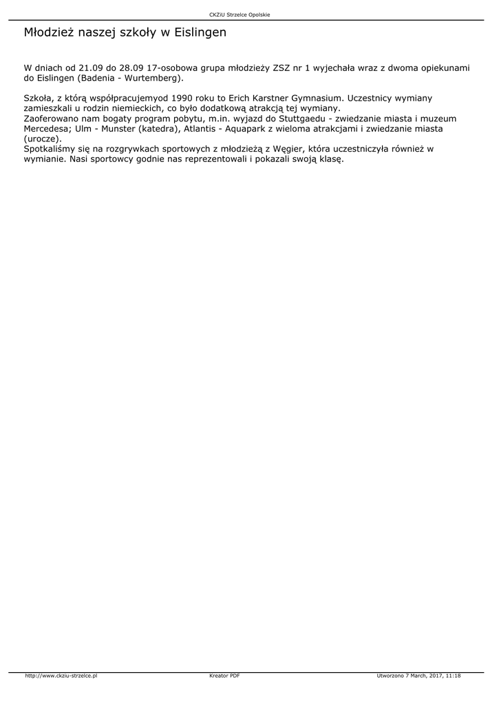CKZiU Strzelce Opolskie Młodzież naszej szkoły w Eislingen W dniach od 21.09 do 28.09 17-osobowa grupa młodzieży ZSZ nr 1 wyjechała wraz z dwoma opiekunami do Eislingen (Badenia - Wurtemberg). Szkoła, z którą współpracujemyod 1990 roku to Erich Karstner Gymnasium. Uczestnicy wymiany zamieszkali u rodzin niemieckich, co było dodatkową atrakcją tej wymiany. Zaoferowano nam bogaty program pobytu, m.in. wyjazd do Stuttgaedu - zwiedzanie miasta i muzeum Mercedesa; Ulm - Munster (katedra), Atlantis - Aquapark z wieloma atrakcjami i zwiedzanie miasta (urocze). Spotkaliśmy się na rozgrywkach sportowych z młodzieżą z Węgier, która uczestniczyła również w wymianie. Nasi sportowcy godnie nas reprezentowali i pokazali swoją klasę. http://www.ckziu-strzelce.pl Kreator PDF Utworzono 7 March, 2017, 11:18