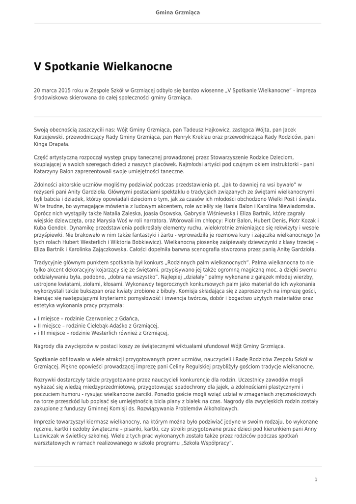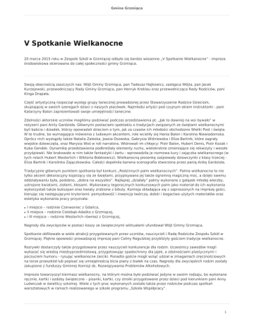 Gmina Grzmiąca V Spotkanie Wielkanocne 20 marca 2015 roku w Zespole Szkół w Grzmiącej odbyło się bardzo wiosenne „V Spotkanie Wielkanocne” - impreza środowiskowa skierowana do całej społeczności gminy Grzmiąca. Swoją obecnością zaszczycili nas: Wójt Gminy Grzmiąca, pan Tadeusz Hajkowicz, zastępca Wójta, pan Jacek Kurzejewski, przewodniczący Rady Gminy Grzmiąca, pan Henryk Kreklau oraz przewodnicząca Rady Rodziców, pani Kinga Drapała. Część artystyczną rozpoczął występ grupy tanecznej prowadzonej przez Stowarzyszenie Rodzice Dzieciom, skupiającej w swoich szeregach dzieci z naszych placówek. Najmłodsi artyści pod czujnym okiem instruktorki - pani Katarzyny Balon zaprezentowali swoje umiejętności taneczne. Zdolności aktorskie uczniów mogliśmy podziwiać podczas przedstawienia pt. „Jak to dawniej na wsi bywało” w reżyserii pani Anity Gardzioła. Głównymi postaciami spektaklu o tradycjach związanych ze świętami wielkanocnymi byli babcia i dziadek, którzy opowiadali dzieciom o tym, jak za czasów ich młodości obchodzono Wielki Post i święta. W te trudne, bo wymagające mówienia z ludowym akcentem, role wcieliły się Hania Balon i Karolina Niewiadomska. Oprócz nich wystąpiły także Natalia Zaleska, Joasia Osowska, Gabrysia Wiśniewska i Eliza Bartnik, które zagrały wiejskie dziewczęta, oraz Marysia Woś w roli narratora. Wtórowali im chłopcy: Piotr Balon, Hubert Denis, Piotr Kozak i Kuba Gendek. Dynamikę przedstawienia podkreślały elementy ruchu, wielokrotnie zmieniające się rekwizyty i wesołe przyśpiewki. Nie brakowało w nim także fantastyki i żartu - wprowadziła je rozmowa kury i zajączka wielkanocnego (w tych rolach Hubert Westerlich i Wiktoria Bobkiewicz). Wielkanocną piosenkę zaśpiewały dziewczynki z klasy trzeciej Eliza Bartnik i Karolinka Zajączkowska. Całości dopełniła barwna scenografia stworzona przez panią Anitę Gardzioła. Tradycyjnie głównym punktem spotkania był konkurs „Rodzinnych palm wielkanocnych”. Palma wielkanocna to nie tylko akcent dekoracyjny kojarzący się ze świętami, przypisywano jej także ogromną magiczną moc, a dzięki swemu oddziaływaniu była, podobno, „dobra na wszystko”. Najlepiej „działały” palmy wykonane z gałązek młodej wierzby, ustrojone kwiatami, ziołami, kłosami. Wykonawcy tegorocznych konkursowych palm jako materiał do ich wykonania wykorzystali także bukszpan oraz kwiaty zrobione z bibuły. Komisja składająca się z zaproszonych na imprezę gości, kierując się następującymi kryteriami: pomysłowość i inwencja twórcza, dobór i bogactwo użytych materiałów oraz estetyka wykonania pracy przyznała: ● ● ● I miejsce – rodzinie Czerwoniec z Gdańca, II miejsce – rodzinie Cielebąk-Adaśko z Grzmiącej, i III miejsce – rodzinie Westerlich również z Grzmiącej, Nagrody dla zwycięzców w postaci koszy ze świątecznymi wiktuałami ufundował Wójt Gminy Grzmiąca. Spotkanie obfitowało w wiele atrakcji przygotowanych przez uczniów, nauczycieli i Radę Rodziców Zespołu Szkół w Grzmiącej. Piękne opowieści prowadzącej imprezę pani Celiny Regulskiej przybliżyły gościom tradycje wielkanocne. Rozrywki dostarczyły także przygotowane przez nauczycieli konkurencje dla rodzin. Uczestnicy zawodów mogli wykazać się wiedzą miedzyprzedmiotową, przygotowując spadochrony dla jajek, a zdolnościami plastycznymi i poczuciem humoru - rysując wielkanocne żarciki. Ponadto goście mogli wziąć udział w zmaganiach zręcznościowych na torze przeszkód lub popisać się umiejętnością bicia piany z białek na czas. Nagrody dla zwycięskich rodzin zostały zakupione z funduszy Gminnej Komisji ds. Rozwiązywania Problemów Alkoholowych. Imprezie towarzyszył kiermasz wielkanocny, na którym można było podziwiać jedyne w swoim rodzaju, bo wykonane ręcznie, kartki i ozdoby świąteczne – pisanki, kartki, czy stroiki przygotowane przez dzieci pod kierunkiem pani Anny Ludwiczak w świetlicy szkolnej. Wiele z tych prac wykonanych zostało także przez rodziców podczas spotkań warsztatowych w ramach realizowanego w szkole programu „Szkoła Współpracy”. 1 Gmina Grzmiąca Podczas spotkania swoją obecność zaznaczyła również Biblioteka Szkolna ZS w Grzmiącej. Dzięki nieocenionej pomocy Rady Rodziców i we współpracy z firmą wydawniczo-handlową „Tania Książka” biblioteka zaprezentowała bogatą ofertę książek. Nabywców znalazły piękne baśnie, pouczające bajki, a także kolorowanki i książki z naklejkami dla najmłodszych oraz łamigłówki o tematyce wielkanocnej. Dużym zainteresowaniem obecnych cieszyło się stoisko florystyczne, przygotowane przez uczniów klasy piątej pod opieką pani Elżbiety Niburskiej-Sitkiewicz. Entuzjaści natury podziwiali sadzonki roślin ozdobnych, które zawdzięczamy rodzicom naszych uczniów. Zachwycały rośliny doniczkowe, także warzywa oraz nasiona. O słodki poczęstunek - ciasta i ciepłe napoje, również zadbali rodzice uczniów naszej szkoły. W zaaranżowanej przez Radę Rodziców kawiarence prym wiodła przewodnicząca Rady, pani Kinga Drapała. Dodatkowo można było spróbować domowych wyrobów, a w szczególności serów i masła pani Doroty Łastówka z Wielawino. Żaden z gości nie mógł przejść obojętnie obok pięknie udekorowanego stołu. Autorem ekspozycji, utrzymanej w tonacji zielono-żółtej, był zespół nauczycieli z Przedszkola. To właśnie wokół stołu co roku zbiera się cała rodzina, by wspólnie celebrować świąteczny czas. Na tym przygotowanym na czas spotkania znalazły się wypieki podarowane przez Piekarnię Grzmiąca oraz baby wielkanocne, upieczone na międzyklasowy konkurs o nagrodę ufundowaną przez Radę Rodziców naszej szkoły. Walory smakowe i atrakcyjność wypieku zdecydowały o przyznaniu I miejsca klasie piątej. Dużym zainteresowaniem cieszyła się także szkolna wystawa konkursowa pisan
