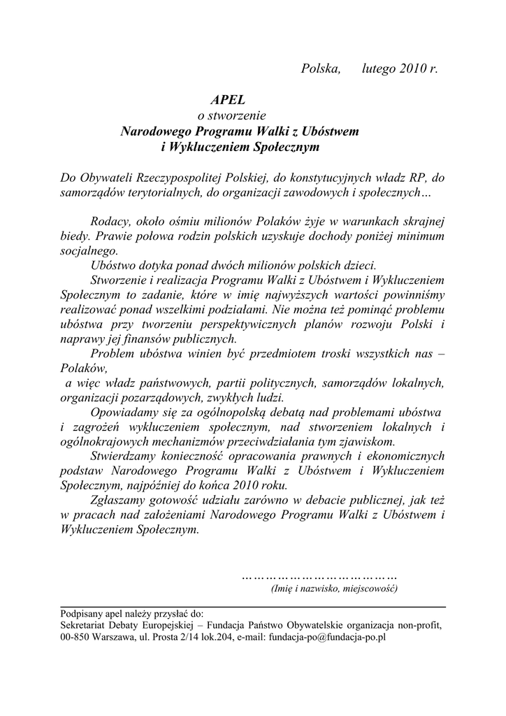 Polska, lutego 2010 r. APEL o stworzenie Narodowego Programu Walki z Ubóstwem i Wykluczeniem Społecznym Do Obywateli Rzeczypospolitej Polskiej, do konstytucyjnych władz RP, do samorządów terytorialnych, do organizacji zawodowych i społecznych… Rodacy, około ośmiu milionów Polaków żyje w warunkach skrajnej biedy. Prawie połowa rodzin polskich uzyskuje dochody poniżej minimum socjalnego. Ubóstwo dotyka ponad dwóch milionów polskich dzieci. Stworzenie i realizacja Programu Walki z Ubóstwem i Wykluczeniem Społecznym to zadanie, które w imię najwyższych wartości powinniśmy realizować ponad wszelkimi podziałami. Nie można też pominąć problemu ubóstwa przy tworzeniu perspektywicznych planów rozwoju Polski i naprawy jej finansów publicznych. Problem ubóstwa winien być przedmiotem troski wszystkich nas – Polaków, a więc władz państwowych, partii politycznych, samorządów lokalnych, organizacji pozarządowych, zwykłych ludzi. Opowiadamy się za ogólnopolską debatą nad problemami ubóstwa i zagrożeń wykluczeniem społecznym, nad stworzeniem lokalnych i ogólnokrajowych mechanizmów przeciwdziałania tym zjawiskom. Stwierdzamy konieczność opracowania prawnych i ekonomicznych podstaw Narodowego Programu Walki z Ubóstwem i Wykluczeniem Społecznym, najpóźniej do końca 2010 roku. Zgłaszamy gotowość udziału zarówno w debacie publicznej, jak też w pracach nad założeniami Narodowego Programu Walki z Ubóstwem i Wykluczeniem Społecznym. ………………………………… (Imię i nazwisko, miejscowość) Podpisany apel należy przysłać do: Sekretariat Debaty Europejskiej – Fundacja Państwo Obywatelskie organizacja non-profit, 00-850 Warszawa, ul. Prosta 2/14 lok.204, e-mail: [email protected]