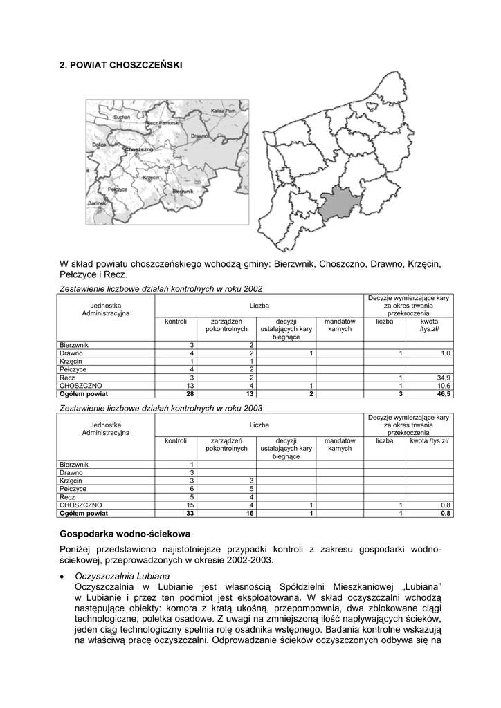 2. POWIAT CHOSZCZEŃSKI W skład powiatu choszczeńskiego wchodzą gminy: Bierzwnik, Choszczno, Drawno, Krzęcin, Pełczyce i Recz. Zestawienie liczbowe działań kontrolnych w roku 2002 Jednostka Administracyjna Liczba kontroli Bierzwnik Drawno Krzęcin Pełczyce Recz CHOSZCZNO Ogółem powiat 3 4 1 4 3 13 28 zarządzeń pokontrolnych decyzji ustalających kary biegnące 2 2 1 2 2 4 13 mandatów karnych Decyzje wymierzające kary za okres trwania przekroczenia liczba kwota /tys.zł/ 1 1 1,0 1 2 1 1 3 34,9 10,6 46,5 Zestawienie liczbowe działań kontrolnych w roku 2003 Jednostka Administracyjna Liczba kontroli Bierzwnik Drawno Krzęcin Pełczyce Recz CHOSZCZNO Ogółem powiat 1 3 3 6 5 15 33 zarządzeń pokontrolnych 3 5 4 4 16 decyzji ustalających kary biegnące 1 1 mandatów karnych Decyzje wymierzające kary za okres trwania przekroczenia liczba kwota /tys.zł/ 1 1 0,8 0,8 Gospodarka wodno-ściekowa Poniżej przedstawiono najistotniejsze przypadki kontroli z zakresu gospodarki wodnościekowej, przeprowadzonych w okresie 2002-2003. • Oczyszczalnia Lubiana Oczyszczalnia w Lubianie jest własnością Spółdzielni Mieszkaniowej „Lubiana” w Lubianie i przez ten podmiot jest eksploatowana. W skład oczyszczalni wchodzą następujące obiekty: komora z kratą ukośną, przepompownia, dwa zblokowane ciągi technologiczne, poletka osadowe. Z uwagi na zmniejszoną ilość napływających ścieków, jeden ciąg technologiczny spełnia rolę osadnika wstępnego. Badania kontrolne wskazują na właściwą pracę oczyszczalni. Odprowadzanie ścieków oczyszczonych odbywa się na podstawie pozwolenia wodnoprawnego z terminem ważności do 31.12.2005 roku Odbiornikiem ścieków za pośrednictwem rowu melioracyjnego jest rzeka Mała Ina. • Oczyszczalnia Rakowo Oczyszczalnia w Rakowie jest własnością Spółdzielni Mieszkaniowej „Mielęcin” w Mielęcinie po przejęciu aktem notarialnym z dniem 31.03.2001 roku od AWRSP/Oddział Szczecin. Spółdzielnia poddała oczyszczalnię remontowi poprzez odtworzenie drugiego rowu recyrkulacyjnego, wykonanie pomostów i osłon nad szczotkami napowietrzającymi, wprowadzenie recyrkulacji osadu czynnego z osadnika wtórnego, zdrenowanie poletek osadowych oraz wykonanie studzienki do poboru prób kontrolnych na terenie oczyszczalni. Aktualnie w skład oczyszczalni wchodzą następujące obiekty: studzienka z krata skośną, 2 rowy cyrkulacyjne, osadnik wtórny, poletka osadowe. Dodatkowo na oczyszczalni w Rakowie oczyszczane są ścieki z Kaszewa, skąd są przewożone po wyłączeniu z eksploatacji niesprawnej oczyszczalni w tej miejscowości. Ogółem oczyszczane i odprowadzane jest 25 m3/dobę ścieków. Odbiornikiem ścieków - za pośrednictwem rowu melioracji szczegółowej - jest jezioro Wielkie Objezierze. Użytkownik posiada ważne pozwolenie wodnoprawne, z terminem obowiązywania do 31.01.2013 roku. Ochrona powietrza Poniżej przedstawiono najistotniejsze zakłady skontrolowane w okresie 2002-2003 w zakresie ochrony powietrza: • Przedsiębiorstwo Energetyki Cieplnej w Choszcznie W przedsiębiorstwie zainstalowane są trzy kotły rusztowe o łącznej mocy 18,5 MW, posiadające odpylacze cyklonowe o sprawności 80 %. Pomiary emisji wykonywane przez WIOŚ nie wykazują przekroczeń emisji dopuszczalnej. • Zakłady Dziewiarskie „Emitex” w Choszcznie Zakład prowadzi produkcję wyrobów dziewiarskich. Głównym źródłem emisji zanieczyszczeń do powietrza jest kocioł węglowy starej konstrukcji charakteryzujący się cykliczną emisją dużych ilości sadzy. • Areszt Śledczy w Choszcznie Zainstalowane są 3 kotły węglowe o mocy łącznej 900 kW. Występuje nadmierna emisja sadzy przy spalaniu węgla. W wyniku zarządzeń pokontrolnych, aktualnie kotłownia opalana jest wyłącznie koksem. Ochrona przed hałasem W latach 2002-2003 nie stwierdzono na terenie powiatu choszczeńskiego przypadku zakładu, który przekraczałby dopuszczalne normy hałasu w środowisku. Gospodarka odpadami W czerwcu 2002 roku przeprowadzono kontrolę w P.H.U. „Moreka” w Choszcznie. Kontrolę przeprowadzono na wniosek Urzędu Miejskiego w Drawnie, który poinformował o magazynowaniu beczek z niewiadomą substancją w piwnicy należącej do firmy. W trakcie kontroli ustalono, że firma wykorzystuje pomieszczenia piwnic do magazynowania klejów, sprowadzanych z terenu Niemiec. Kleje magazynowane są w partiach po 80 sztuk 200 litrowych beczek. Po podzieleniu na mniejsze partie, kleje transportowane są do klientów. Ustalono, że posadzki w pomieszczeniach magazynowych, w których przechowywane są kleje, wyposażone są w kratki ściekowe z odpływem do kanalizacji miejskiej. Ponadto, firma nie posiadała uzgodnień dotyczących wytwarzanych odpadów oraz nie prowadziła ewidencji odpadów. Wydane zostały zarządzenia pokontrolne zobowiązujące firmę do usunięcia naruszeń, w tym zabezpieczenia pomieszczenia magazynowego przed możliwością przedostania się substancji niebezpiecznej do kanalizacji. 2 W roku 2003 w powiecie choszczeńskim w zakresie ochrony powierzchni ziemi kontrolowane były głównie składowiska odpadów. Kontroli poddano: • składowisko odpadów w m. Objezierze w gminie Krzęcin, • składowisko odpadów w m. Będargowo w gminie Pełczyce, • składowisko odpadów w Pełczycach (dwukrotnie), • składowisko odpadów w Reczu. W stosunku do składowisk odpadów w Reczu i Objezierzu, czynności kontrolnych dokonano w związku z prowadzonymi przez Starostwo Powiatowe postępowaniami w sprawie decyzji zezwalających na zamknięcie tych obiektów. Dla obu składowisk takie decyzje zostały wydane. W wyniku kontroli składowiska odpadów w Pełczycach ustalono, że składowisko nie jest ujęte w planie miejscowego zagospodarowania, i w związku z powyższym eksploatator składowiska musi wnosić podwyższone opłaty za składowanie odpadów. Ponadto składowisko nie jest wyposażone w urządzenia umożliwiające kontrolę jego