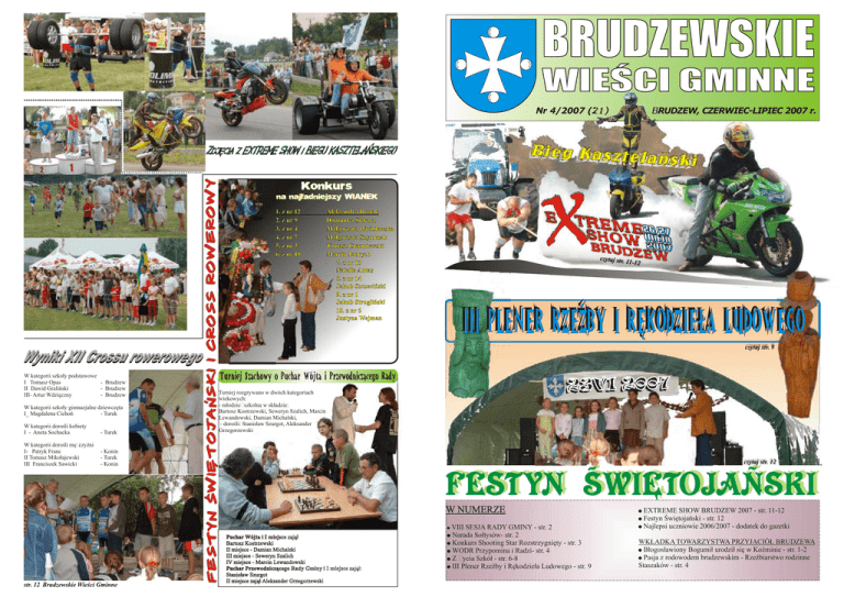 Nr 4/2007 (21) 1. z nr 12 2. z nr 9 3. z nr 4 4. z nr 7 5. z nr 3 6. z nr 10 W kategorii szkoły podstawowe I Tomasz Opas - Brudzew II Dawid Graliński - Brudzew III- Artur Wdzięczny - Brudzew W kategorii szkoły gimnazjalne dziewczęta I_ Magdalena Cichoń - Turek W kategorii dorośli kobiety I - Aneta Sochacka - Turek W kategorii dorośli mężczyźni I- Patryk Franc II Tomasz Mikołajewski III Franciszek Sawicki - Konin - Turek - Konin BRUDZEW, CZERWIEC-LIPIEC 2007 r. Aleksandra Rosiak Dominika Siekacz Małgorzata Wróblewska Małgorzata Szymczak Tomasz Ciemniewski Marcin Jadrych 7. z nr 13 Natalia Antas 8. z nr 14 Jakub Szczeciński 9. z nr 1 Jakub Strugliński 10. z nr 5 Justyna Wejman Turniej rozgrywano w dwóch kategoriach wiekowych: - młodzież szkolna w składzie: Bartosz Kostrzewski, Seweryn Szalich, Marcin Lewandowski, Damian Michalski, - dorośli: Stanisław Szurgot, Aleksander Grzegorzewski W NUMERZE ! VIII SESJA RADY GMINY - str. 2 Puchar Wójta i I miejsce zajął Bartosz Kostrzewski II miejsce - Damian Michalski III miejsce - Seweryn Szalich IV miejsce - Marcin Lewandowski Puchar Przewodniczącego Rady Gminy i I miejsce zajął: Stanisław Szurgot II miejsce zajął Aleksander Grzegorzewski ! Narada Sołtysów- str. 2 ! Konkurs Shooting Star Rozstrzygnięty - str. 3 ! WODR Przypomina i Radzi- str. 4 ! Z Życia Szkół - str. 6-8 ! III Plener Rzeźby i Rękodzieła Ludowego - str. 9 ! EXTREME SHOW BRUDZEW 2007 - str. 11-12 ! Festyn Świętojański - str. 12 ! Najlepsi uczniowie 2006/2007 - dodatek do gazetki WKŁADKA TOWARZYSTWA PRZYJACIÓŁ BRUDZEWA ! Błogosławiony Bogumił urodził się w Koźminie - str. 1-2 ! Pasja z rodowodem brudzewskim - Rzeźbiarstwo rodzinne Staszaków - str. 4 VIII Sesja Rady Gminy Brudzew, odbyła się w dniu 18 czerwca 2007 r. o godzinie 1300 w sali narad Urzędu Gminy. Otwarcia obrad VIII Sesji Rady Gminy tradycyjnie dokonał Przewodniczący Rady Pan Piotr Kwieciński. Powitał radnych, Wójta Pana Cezarego Krasowskiego, Sekretarza Gminy Pana Piotra Nowaczyka, Skarbnika Gminy Panią Wiolettę Gadomską, kierowników jednostek organizacyjnych, dyrektorów szkół i przedszkola, radnego powiatowego Pana Władysława Karskiego, prasę oraz wszystkich obecnych gości. W punkcie zapytania i interpelacje radnych Wiceprzewodniczący Rady Pan Kazimierz Wdowiński w związku z zamieszczonymi w prasie wynikami z testów, które dla szkół z terenu naszej gminy nie wypadły pomyślnie ( wg informacji zawartych w prasie Gmina Brudzew w powiecie tureckim uklasyfikowała się na ostatnim miejscu) zapytał: jaki może być powód lub czym można wytłumaczyć tak niskie wyniki w naszych szkołach ? Dyrektorzy jako uzasadnienie wymienili kilka powodów które mogły przyczynić się do nie najwyższych wyników: większa ilość uczniów z orzeczeniami, zwiększająca się liczba uczniów z trudnościami w nauce, ograniczenie środków finansowych na prowadzenie zajęć wyrównawczych, na wynagrodzenia za zastępstwa dla nauczycieli. Inne powody, które również mają wpływ na osiąganie wyników w nauce to zdaniem radnych Pani Magdaleny Mroczkowskiej i Pana Pawła Stroiwąsa brak motywacji i współpracy ze strony rodziców. Wójt przedstawił radnym system nauczania w Gminie Dobra, która wg klasyfikacji wyników w naszym powiecie zajęła I miejsce. Wprowadzony w tej gminie system nauczania-„Wałbrzyski” wiąże się z przeprowadzaniem testów w klasach II i V szkoły podstawowej oraz w klasie II gimnazjum. Wyniki z przeprowadzonych testów obrazują nauczycielom poziom wiedzy uczniów. Przewodniczący Rady Pan Piotr Kwieciński podkreślił, że nie koniecznie wprowadzenie systemu „Wałbrzyskiego” może przyczynić się do poprawienia wyników z testów, również doskonałym może okazać się opracowany „system brudzewski”. W dalszej części porządku obrad ważnym punktem był punkt 5) podjęcie uchwał, w którym znalazło się 7 projektów: -zmian w budżecie gminy na 2007 rok -ustalenia najniższego wynagrodzenia zasadniczego w I kategorii zaszeregowania oraz ustalenia wartości jednego punktu dla pracowników Zakładu Gospodarki Komunalnej w Brudzewie -odstąpienia od sporządzenia miejscowego planu zagospodarowania przestrzennego gminy dla terenu górniczego, zlokalizowanego na działkach oznaczonych nr ewidencyjnymi 306/2, 307/2, 308/2, położonych w obrębie geodezyjnym Chrząblice, gminy Brudzew -wyrażenia zgody na przystąpienie do Stowarzyszenia Samorządowego A-2 Wielkopolska” -określenia zasad wnoszenia wkładów przez Wójta Gminy na podwyższony kapitał początkowy Spółki „Oświetlenie Uliczne i Drogowe” sp. z o. o. z siedzibą w Kaliszu -nieodpłatnego przejęcia nieruchomości na rzecz Gminy Brudzew położonej w Tarnowie od Agencji Nieruchomości Rolnych Skarbu Państwa -zmieniająca uchwałę w sprawie nadania statutu Gminnego Zespołu Obsługi Oświaty w Brudzewie Wymienione wyżej projekty uchwał zostały przedstawione na posiedzeniach Komisji Stałych. Zaopiniowane zostały pozytywnie. Radni z wyjątkiem jednej uchwały -w sprawie określenia zasad wnoszenia wkładów przez Wójta gminy na podwyższony kapitał początkowy Spółki „Oświetlenie Uliczne i Drogowe” sp. z o. o. z siedzibą w Kaliszu (14 głosów „za”) przegłosowali pozostałe jednogłośnie 15 głosami „za”. W punkcie -wolne wnioski radni zgłaszali wnioski w sprawie żwirowania, równania dróg i poboczy oraz budowy chodników. Inne wnioski dotyczyły uzupełnienia oświetleń ulicznych znaków drogowych oraz budowy sieci kanalizacji. Radny Powiatowy Pan Władysław Karski poinformował radnych o podjętych działaniach i uwzględnieniu w planach wydatków realizację zgłoszonych wniosków w sprawie naprawy i modernizacji niektórych dróg powiatowych znajdujących się na terenie gminy Brudzew. Wójt złożył podziękowania Panu Janowi Karbowemu, mieszkańcowi Chrząblic za zaangażowanie w prace związane z porządko