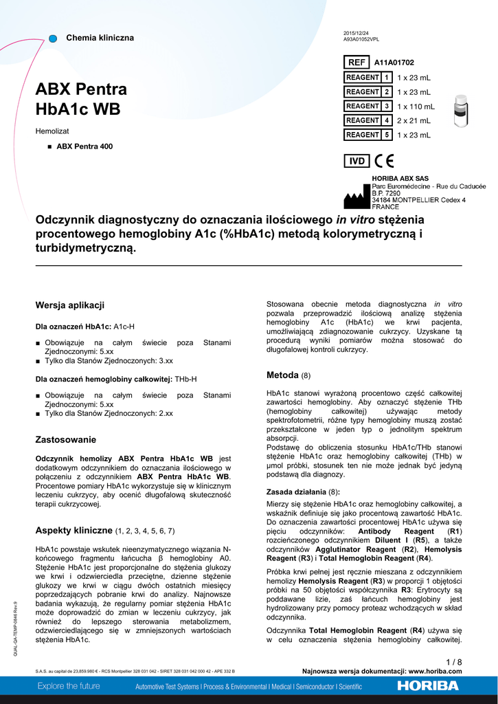 2015/12/24 A93A01052VPL Chemia kliniczna A11A01702 1 x 23 mL ABX Pentra HbA1c WB 1 x 23 mL 1 x 110 mL 2 x 21 mL Hemolizat 1 x 23 mL ■ ABX Pentra 400 Odczynnik diagnostyczny do oznaczania ilościowego in vitro stężenia procentowego hemoglobiny A1c (%HbA1c) metodą kolorymetryczną i turbidymetryczną. Wersja aplikacji Dla oznaczeń HbA1c: A1c-H ■ Obowiązuje na całym świecie poza Zjednoczonymi: 5.xx ■ Tylko dla Stanów Zjednoczonych: 3.xx Stanami Metoda (8) Dla oznaczeń hemoglobiny całkowitej: THb-H ■ Obowiązuje na całym świecie poza Zjednoczonymi: 5.xx ■ Tylko dla Stanów Zjednoczonych: 2.xx Stanami Zastosowanie Odczynnik hemolizy ABX Pentra HbA1c WB jest dodatkowym odczynnikiem do oznaczania ilościowego w połączeniu z odczynnikiem ABX Pentra HbA1c WB. Procentowe pomiary HbA1c wykorzystuje się w klinicznym leczeniu cukrzycy, aby ocenić długofalową skuteczność terapii cukrzycowej. Aspekty kliniczne (1, 2, 3, 4, 5, 6, 7) QUAL-QA-TEMP-0846 Rev.9 Stosowana obecnie metoda diagnostyczna in vitro pozwala przeprowadzić ilościową analizę stężenia hemoglobiny A1c (HbA1c) we krwi pacjenta, umożliwiającą zdiagnozowanie cukrzycy. Uzyskane tą procedurą wyniki pomiarów można stosować do długofalowej kontroli cukrzycy. HbA1c powstaje wskutek nieenzymatycznego wiązania Nkońcowego fragmentu łańcucha β hemoglobiny A0. Stężenie HbA1c jest proporcjonalne do stężenia glukozy we krwi i odzwierciedla przeciętne, dzienne stężenie glukozy we krwi w ciągu dwóch ostatnich miesięcy poprzedzających pobranie krwi do analizy. Najnowsze badania wykazują, że regularny pomiar stężenia HbA1c może doprowadzić do zmian w leczeniu cukrzycy, jak również do lepszego sterowania metabolizmem, odzwierciedlającego się w zmniejszonych wartościach stężenia HbA1c. HbA1c stanowi wyrażoną procentowo część całkowitej zawartości hemoglobiny. Aby oznaczyć stężenie THb (hemoglobiny całkowitej) używając metody spektrofotometrii, różne typy hemoglobiny muszą zostać przekształcone w jeden typ o jednolitym spektrum absorpcji. Podstawę do obliczenia stosunku HbA1c/THb stanowi stężenie HbA1c oraz hemoglobiny całkowitej (THb) w µmol próbki, stosunek ten nie może jednak być jedyną podstawą dla diagnozy. Zasada działania (8): Mierzy się stężenie HbA1c oraz hemoglobiny całkowitej, a wskaźnik definiuje się jako procentową zawartość HbA1c. Do oznaczenia zawartości procentowej HbA1c używa się pięciu odczynników: Antibody Reagent (R1) rozcieńczonego odczynnikiem Diluent I (R5), a także odczynników Agglutinator Reagent (R2), Hemolysis Reagent (R3) i Total Hemoglobin Reagent (R4). Próbka krwi pełnej jest ręcznie mieszana z odczynnikiem hemolizy Hemolysis Reagent (R3) w proporcji 1 objętości próbki na 50 objętości współczynnika R3: Erytrocyty są poddawane lizie, zaś łańcuch hemoglobiny jest hydrolizowany przy pomocy proteaz wchodzących w skład odczynnika. Odczynnika Total Hemoglobin Reagent (R4) używa się w celu oznaczenia stężenia hemoglobiny całkowitej. 1/8 S.A.S. au capital de 23,859.980 € - RCS Montpellier 328 031 042 - SIRET 328 031 042 000 42 - APE 332 B Najnowsza wersja dokumentacji: www.horiba.com Chemia kliniczna ABX Pentra HbA1c WB Metoda opiera się na konwersji wszystkich postaci hemoglobiny w zasadową hematynę w roztworze zasadowym niejonowego detergentu, tak jak opisano w pierwszej procedurze opracowanej przez Wolf i in. Reakcja jest wyzwalana przez dodanie próbki krwi, poddanej uprzednio reakcji z odczynnikiem hemoglobiny całkowitej Total Hemoglobin Reagent (R4), co powoduje zielone zabarwienie roztworu. Przekształcanie różnych typów hemoglobiny w alkaliczną hematynę o zdefiniowanym spektrum absorpcji pozwala obliczyć stężenie hemoglobiny całkowitej. Hemoglobinę mierzy się metodą punktów krańcowych przy długości fali 550 nm. Stężenia hemoglobiny są wprost proporcjonalne do wzrostu obserwowanej absorbancji. Do pomiaru hemoglobiny właściwej HbA1c służy test hamowania aglutynacji cząstek lateksu. Aglutynina (polimer syntetyczny zawierający wiele kopii immunoreaktywnej części HbA1c) powoduje aglutynację cząstek lateksu pokrytych mysimi przeciwciałami monoklonalnymi swoistymi dla hemoglobiny HbA1c. Jeżeli próbka nie zawiera hemoglobiny HbA1c, aglutynina zawarta w odczynniku Agglutinator Reagent (R2) oraz mikrocząstki opłaszczone odczynnikiem Antibody Reagent (R1) ulegną aglutynacji. Aglutynacja powoduje wzrost absorbancji zawiesiny. Obecność hemoglobiny HbA1c w próbce spowalnia szybkość aglutynacji, ponieważ HbA1c konkuruje z odczynnikiem Agglutinator Reagent (R2) w miejscach przyłączania przeciwciał na mikrocząstkach. Im większa ilość hemoglobiny HbA1c w próbce, tym wolniej postępuje aglutynacja. Szybkość reakcji mierzy się przy użyciu absorbancji przy długości fali 550 nm, przy czym szybkość aglutynacji służy do wyliczenia stężenia na podstawie krzywej kalibracji. Następnie, przy użyciu wartości HbA1c i hemoglobiny całkowitej w µmol obliczana jest procentowa zawartość HbA1c. Odczynniki ABX Pentra HbA1c WB to zestaw wieloodczynnikowy. Zawartość zestawu: Reagent 3: Hemolysis Reagent 1 x 110 mL Reagent 4: Total Hemoglobin Reagent 2 x 21 mL Reagent 5: Diluent I 1 x 23 mL Odczynnik Przeciwciał (R1) zawiera: cząstki sprzężone z mysimi przeciwciałami HbA1c; albumina surowicy bydlęcej; bufor; związki powierzchniowo czynne; konserwanty. Odczynnik Aglutynacji (R2) zawiera: kowalencyjny hapten wiążący polimery; albuminę surowicy bydlęcej; bufor; konserwant; związek powierzchniowo czynny. Odczynnik Hemolizy (R3) zawiera: pepsynę świńską; bufor; konserwant. Ten odczynnik jest także sprzedawany osobno jako produkt o numerze ref. A11A01730. Odczynnik Hemoglobiny Całkowitej (R4) zawiera: wodorotlenek sodu; związek powierzchniowo czynny. Rozcieńczalnik I (R5) zawiera: konserwant; NaCl. ABX Pentra HbA1c WB należy używać zgodni