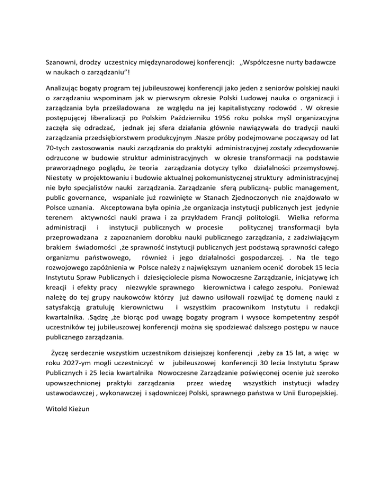 Szanowni, drodzy uczestnicy międzynarodowej konferencji: „Współczesne nurty badawcze w naukach o zarządzaniu”! Analizując bogaty program tej jubileuszowej konferencji jako jeden z seniorów polskiej nauki o zarządzaniu wspominam jak w pierwszym okresie Polski Ludowej nauka o organizacji i zarządzania była prześladowana ze względu na jej kapitalistyczny rodowód . W okresie postępującej Iiberalizacji po Polskim Październiku 1956 roku polska myśl organizacyjna zaczęła się odradzać, jednak jej sfera działania głównie nawiązywała do tradycji nauki zarządzania przedsiębiorstwem produkcyjnym .Nasze próby podejmowane począwszy od lat 70-tych zastosowania nauki zarządzania do praktyki administracyjnej zostały zdecydowanie odrzucone w budowie struktur administracyjnych w okresie transformacji na podstawie praworządnego poglądu, że teoria zarządzania dotyczy tylko działalności przemysłowej. Niestety w projektowaniu i budowie aktualnej pokomunistycznej struktury administracyjnej nie było specjalistów nauki zarządzania. Zarządzanie sferą publiczną- public management, public governance, wspaniale już rozwinięte w Stanach Zjednoczonych nie znajdowało w Polsce uznania. Akceptowana była opinia ,że organizacja instytucji publicznych jest jedynie terenem aktywności nauki prawa i za przykładem Francji politologii. Wielka reforma administracji i instytucji publicznych w procesie politycznej transformacji była przeprowadzana z zapoznaniem dorobku nauki publicznego zarządzania, z zadziwiającym brakiem świadomości ,że sprawność instytucji publicznych jest podstawą sprawności całego organizmu państwowego, również i jego działalności gospodarczej. . Na tle tego rozwojowego zapóźnienia w Polsce należy z największym uznaniem ocenić dorobek 15 lecia Instytutu Spraw Publicznych i dziesięciolecie pisma Nowoczesne Zarządzanie, inicjatywę ich kreacji i efekty pracy niezwykle sprawnego kierownictwa i całego zespołu. Ponieważ należę do tej grupy naukowców którzy już dawno usiłowali rozwijać tę domenę nauki z satysfakcją gratuluję kierownictwu i wszystkim pracownikom Instytutu i redakcji kwartalnika. .Sądzę ,że biorąc pod uwagę bogaty program i wysoce kompetentny zespół uczestników tej jubileuszowej konferencji można się spodziewać dalszego postępu w nauce publicznego zarządzania. Życzę serdecznie wszystkim uczestnikom dzisiejszej konferencji ,żeby za 15 lat, a więc w roku 2027-ym mogli uczestniczyć w jubileuszowej konferencji 30 lecia Instytutu Spraw Publicznych i 25 lecia kwartalnika Nowoczesne Zarządzanie poświęconej ocenie już szeroko upowszechnionej praktyki zarządzania przez wiedzę wszystkich instytucji władzy ustawodawczej , wykonawczej i sądowniczej Polski, sprawnego państwa w Unii Europejskiej. Witold Kieżun
