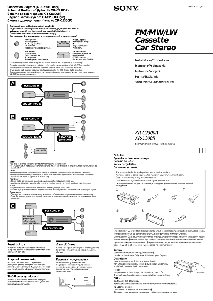 Connection Diagram (XR-C2300R only) Schemat Podłączeń (tylko dla XR-C2300R) Schéma zapojení (pouze XR-C2300R) Bağlantı şeması (yalnız XR-C2300R için) Схема подсоединения (топько XR-C2300R) 3-868-292-31 (1) Equipment used in illustrations (not supplied) Wyposażenie wykorzystane w celach ilustracyjnych (nie załączone) Vybavení použité pro ilustrace (není součástí příslušenství) Örneklerde kullanılan alet (beraberinde değil) Аппаратура, фигурирующая в иллюстрациях (не прилагается) Front speaker Przedni głośnik Přední reproduktor Ön hoparlör Передний громкоговоритель Power Amplifier Wzmacniacz mocy Zesilovač Güç amplifikatörü Усилитель Rear speaker Tylny głośnik Zadní reproduktor Arka hoparlör Задний громкоговоритель CD/MD changer Zmieniacz płyt CD/MD menič CD/MD CD/MD changer Проигрыватель CD/MD FM/MW/LW Cassette Car Stereo Installation/Connections For connecting two or more changers, the source selector XA-C30 (optional) is necessary. Do podłączenia dwóch lub więcej zmieniaczy płyt, niezbędny jest selektor źródła XA-C30 (opcjonalny). Pro zapojení dvou nebo více měničů je zapotřebí selektor zdroje XA-C30 (možno dokoupit). İki veya daha fazla changer bağlamak için kaynak selektörü XA-C30 (tercihe bağlı) gereklidir. Для подсоединения двух или более проигрывателей компакт-дисков необходим селектор источника XA-C30 (в комплект не входит). Instalacja/Podłączenia Instalace/Zapojení Kurma/Bağlantılar A Установка/Подсоединение BUS AUDIO IN BUS CONTROL IN B BUS AUDIO IN BUS CONTROL IN XR-C2300R XR-1300R AUDIO OUT (LINE OUT) Sony Corporation 2000 Notes • Be sure to connect the earth cord before connecting the amplifier. • If you connect an optional power amplifier and do not use the built-in amplifier, the beep sound will be deactivated. Uwagi • Przed podłączeniem do wzmacniacza, proszę w pierwszej kolejności podłączyć przewód uziemienia. • Podłączenie opcjonalnego wzmacniacza mocy i tym samym zrezygnowanie z wbudowanego do sprzętu wzmacniacza, wyłącza sygnalizację akustyczną. Poznámky • Dbejte na to, abyste napřed zapojili kabel pro uzemnění, než zapojíte zesilovač. • Jestliže zapojíte přídavný zesilovač a nebudete používat zabudovaný zesilovač, bude pípání vypnuté. Notlar • Toprak kablosunu, amplifikatörü bağlamadan önce bağlamaya dikkat ediniz. • Tercihe bağlı güç amplifikatörünü bağlamazsanız ve dahili amplifikatörü kullanmazsanız, uyarı sinyali zayıflar. Примечания • Прежде чем подключать магнитолу к усилителю, обязательно подсоедините провод заземления. • Если Вы изпользуете не встроенный усилитель, а дополнительный усилитель, сигнал зуммера будет отключен. Printed in Malaysia Parts list Spis elementów montażowych Seznam součástí Yedek parça listesi Перечень деталей The numbers in the list are keyed to those in the instructions. Numery podane w spisie odpowiadają numerom używanym w instrukcjach. Čísla v seznamu odpovídají číslům v návodu. Listedeki sayılar açıklamalardaki sayılara göre ayarlanmıştır. Нижеприводимые цифры соответствуют цифрам, упоминаемым далее в данной инструкции. 1 2 4 3 C BUS AUDIO IN 5 6 7 Source selector Selektor zrodła Přepinač zdroje Kaynak selektörü Селектор источника BUS CONTROL IN The release key 4 is used for dismounting the unit. See the Operating Instructions manual for details. Klucz zwalniający 4 do demontażu sprzętu. Szczegóły, patrz Instrukcje Obsługi. Uvolňovací klíč 4 je používán na demontáž přístroje. Další podrobnosti naleznete v Návodu k použití. Söküm anahtarı 4 üniteyi sökmek için kullanılır. Ayrıntılar için teknik açıklamalar kılavuzuna bakınız. Прилагаемый демонтажный ключ 4 предназначен для демонтажа данной автомагнитолы. Более подробно об этом см. в Руководстве по эксплуатации. Reset button Ayar düğmesi When the installation and connections are complete, be sure to press the reset button with a ballpoint pen, etc. Kurma ve bağlantılar bittiğinde, ayar düğmesine tükenmez bir kalem v.b. ile bastığınıza emin olunuz. Caution Przycisk zerowania Клавиша переустановки Ostrzeżenie Po zakończeniu montażu i wykonaniu podłączeń, proszę pamiętać o naciśnięciu przycisku zerowania sprzętu, używając do tego celu np. długopisu lub podobnego przedmiotu. По окончании установки и всех подсоединений не забудьте нажать кончиком шариковой ручки или иным аналогичным предметом клавишу переустановки. Tlačítko na vynulování Jakmile je dokončená instalace a zapojení, nezapomeňte stisknout tlačítko na vynulování kuličkovým perem apod. Cautionary notice for handling the bracket 1. Handle the bracket carefully to avoid injuring your fingers. Uwaga ostrzegawcza dotycząca wspornika 1. Aby uniknąć obrażeń ciała, proszę przy montażu wspornika, podjąć odpowiednie środki ostrożności. Pozor Bezpečnostní upozornění pro zacházení s konzolou 1. S konzolou zacházejte opatrně, abyste si přitom neporanili prsty. 1 Dikkat Destekle 1 ilgili dikkat ikazı. Parmaklarınızın yaralanmaması için desteğe dokunurken dikkat ediniz. Предо