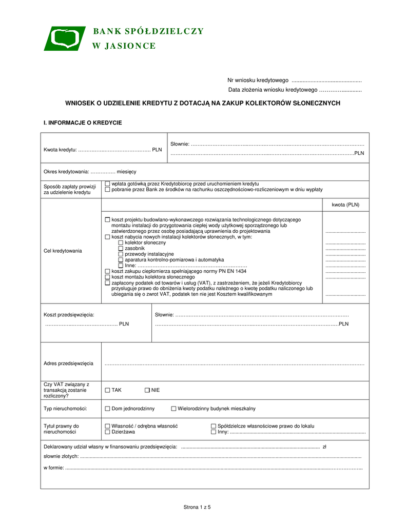 BA N K S P Ó Ł D ZIE L C ZY W J A S IO N CE Nr wniosku kredytowego ............................................. Data złoŜenia wniosku kredytowego …………............. WNIOSEK O UDZIELENIE KREDYTU Z DOTACJĄ NA ZAKUP KOLEKTORÓW SŁONECZNYCH I. INFORMACJE O KREDYCIE Słownie: ……………………………..…………………….……………………………………… Kwota kredytu: …………….………………………. PLN ………………….………………………………..……………………………………………PLN Okres kredytowania: …………… miesięcy Sposób zapłaty prowizji za udzielenie kredytu wpłata gotówką przez Kredytobiorcę przed uruchomieniem kredytu pobranie przez Bank ze środków na rachunku oszczędnościowo-rozliczeniowym w dniu wypłaty kwota (PLN) Cel kredytowania koszt projektu budowlano-wykonawczego rozwiązania technologicznego dotyczącego montaŜu instalacji do przygotowania ciepłej wody uŜytkowej sporządzonego lub zatwierdzonego przez osobę posiadającą uprawnienia do projektowania koszt nabycia nowych instalacji kolektorów słonecznych, w tym: kolektor słoneczny zasobnik przewody instalacyjne aparatura kontrolno-pomiarowa i automatyka Inne: ………………………………………………………… koszt zakupu ciepłomierza spełniającego normy PN EN 1434 koszt montaŜu kolektora słonecznego zapłacony podatek od towarów i usług (VAT), z zastrzeŜeniem, Ŝe jeŜeli Kredytobiorcy przysługuje prawo do obniŜenia kwoty podatku naleŜnego o kwotę podatku naliczonego lub ubiegania się o zwrot VAT, podatek ten nie jest Kosztem kwalifikowanym ............................. ............................. ............................. ............................. ............................. ............................. ............................. ............................. ............................. ............................. ............................. ............................. ............................. ............................. Koszt przedsięwzięcia: Słownie: ……………………………..…………………….……………………………………… …………….………………………. PLN ………………….………………………………..……………………………………………PLN Adres przedsięwzięcia ………………….………………………………..……………………………………………………………….…………………… Czy VAT związany z transakcją zostanie rozliczony? TAK Typ nieruchomości: Dom jednorodzinny Tytuł prawny do nieruchomości Własność / odrębna własność DzierŜawa NIE Wielorodzinny budynek mieszkalny Spółdzielcze własnościowe prawo do lokalu Inny: .................................................................................................. Deklarowany udział własny w finansowaniu przedsięwzięcia: .................................................................................................... zł słownie złotych: ........................................................................................................................................................................................................... w formie: ...............................................................................................................................................................................................……………….. Strona 1 z 5 Przewidywane terminy wykorzystania kredytu i wysokość poszczególnych transz: termin kwota kwota słownie 1) ................................................ .................................................... 2) ................................................ .................................................... 3) ................................................ .................................................... 4) ................................................ .................................................... 5) ................................................ .................................................... ......................................................................... ......................................................................... ......................................................................... ......................................................................... ......................................................................... ......................................................................... ......................................................................... ......................................................................... ......................................................................... ........................................................................ - oświadczenie o poddaniu się egzekucji ORAZ pierwsza hipoteka kaucyjna na kredytowanej nieruchomości dla której/-ego prowadzona jest przez ...................................................................................................................... (określenie sądu) Prawne zabezpieczenie spłaty kredytu: księga wieczysta KW nr .................................................. weksel własny in blanco wraz z deklaracja wekslową cesja praw z ubezpieczenia na Ŝycie poręczenie wekslowe poręczenie według prawa cywilnego kaucja pienięŜna blokada środków pienięŜnych na rachunku bankowym pełnomocnictwo do rachunku nr…………………………. w Banku ………….…………………………… pełnomocnictwo do rachunku nr…………………………. w Banku ………….…………………………… pełnomocnictwo do rachunku nr…………………………. w Banku ………….…………………………… inne zabezpieczenia: ………………….……………………………………………