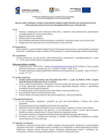 REGULAMIN TURNIEJU TENISA STOŁOWEGO SZKÓŁ PODSTAWOWYCH, GIMNAZJALNYCH I PONADGIMNAZJALNYCH W KATEGORII DZIEWCZĄT I CHŁOPCÓW I. Cel: 1. Promocja i popularyzacja tenisa stołowego wśród dzieci i młodzieży szkół podstawowych, gimnazjalnych i ponadgimnazjalnych z terenu miasta Lęborka. 2. Integracja społeczności szkolnej. 3. Selekcja utalentowanej młodzieży. 4. Przeciwdziałanie patologiom społecznym poprzez wypełnienie i organizację wolego czasu uczniom szkół. 5. Propagowanie zdrowego trybu życia wśród mieszkańców miasta i powiatu. II. Organizatorzy. Powiat Lęborski w ramach działania Punktu Promocji Wolontariatu, który powstał w ramach projektu „Przyjaciele dzieci ulicy” współfinansowanego ze środków Unii Europejskiej w ramach Europejskiego Funduszu Społecznego. III. Uczestnictwo: Turniej przeznaczony jest dla uczniów szkół podstawowych, gimnazjalnych i ponadgimnazjalnych w wieku 13 – 18 lat z terenu miasta Lęborka. Uczestnictwo jest bezpłatne. Zgłaszanie udziału w turnieju: 1. Telefonicznie (tel. 59 8632 851), e-mailem ([email protected]) lub osobiście w biurze projektu (Starostwo Powiatowe w Lęborku, pok. 217) – do dnia 27.10.2011 r. godz. 15.30 2. W miejscu odbywania turnieju (Zespół Szkół Mechaniczno-Informatycznych w Lęborku) – dnia 28.10.2011 r. 45 15 w godz. 14 -15 . IV. Zasady rozgrywek: 1. Turniej zostanie przeprowadzony dnia 28 października 2011 r. w godz. od 15.00 do 19.00 w Zespole Szkół Mechaniczno-Informatycznych w Lęborku. 2. Turniej zostanie przeprowadzony w kategoriach wiekowych (osobno dla dziewcząt i chłopców). W zależności od liczby zgłoszonych uczestników sędziowie utworzą odpowiednie kategorie wiekowe i zakwalifikują uczestników do poszczególnych kategorii. 3. W każdej kategorii zostanie rozegrany turniej indywidualny systemem pucharowym. 4. Gry prowadzone będą do trzech zwycięskich setów. 5. Podczas turnieju obowiązuje całkowity zakaz palenia papierosów i spożywania alkoholu. V. Postanowienie końcowe. 1. Za nie przestrzeganie regulaminu i przepisów gry grozi kara dyskwalifikacji z turnieju. Karę orzeka organizator. 2. Do interpretacji powyższego regulaminu uprawniony jest organizator. 3. Organizator nie ponosi odpowiedzialności za rzeczy pozostawione i zgubione w trakcie trwania turnieju. 4. W czasie zawodów obowiązuje strój sportowy, w tym obowiązkowo obuwie zmienne. Sprzęt sportowy (rakietki) zawodnicy zabezpieczają we własnym zakresie lub organizator turnieju. 5. O wszystkich sprawach nie objętych przepisami niniejszego regulaminu decyduje sędzia główny. 6. Zawodnicy korzystają z ubezpieczenia zawartego w szkołach. Nad prawidłowym przebiegiem zawodów czuwać będą trenerzy tenisa stołowego. VI. Nagrody i wyróżnienia. Zawodnicy za zajęcie pierwszych miejsc w każdej z kategorii otrzymają nagrody, ufundowane w ramach projektu „Przyjaciele dzieci ulicy” współfinansowanego ze środków Unii Europejskiej w ramach Europejskiego Funduszu Społecznego. Nagrody zostaną wręczone podczas konferencji podsumowującej projekt i promującej idee wolontariatu. Uczestnicy otrzymają medal pamiątkowy za udział w turnieju sportowym.