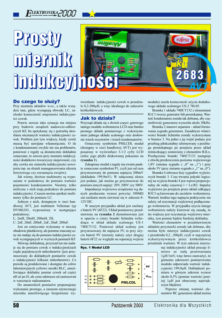 + Prosty miernik indukcyjności Do czego to służy? Przy montażu układów w.cz., a także wszędzie tam, gdzie występują obwody LC, zachodzi konieczność znajomości indukcyjności cewek. Prawie zawsze taka sytuacja ma miejsce przy budowie urządzeń nadawczo-odbiorczych KF, bo spotykamy się z potrzebą określania nieznanych wartości indukcyjności cewek. Problem jest tym większy, kiedy cewki muszą być nawijane własnoręcznie. O ile z kondensatorami zwykle nie ma problemów, ponieważ z reguły są dostatecznie dokładnie oznaczane, to zawsze przy montażu indukcyjności dodatkowo towarzyszy niepewność, czy aby cewka nie zmieniła indukcyjności uzwojenia (np. na skutek namagnesowania rdzenia ferrytowego czy rozsunięcia zwojów). Jak wiemy, droższe multimetry są wyposażane w podzakresy do pomiaru wartości pojemności kondensatorów. Niestety, tylko nieliczne z nich mają podzakres do pomiaru indukcyjności. Czasem można spotkać multimetry tylko do pomiaru LC. Jednym z nich, dostępnym w sieci handlowej AVT, jest multimetr Velleman typ DVM6243, wyposażony w następujące podzakresy: L: 2mH, 20mH, 200mH, 2H, C: 2nF, 20nF, 200nF, 2uF, 20uF, 200uF. Jest on estetycznie wykonany w mocnej obudowie plastikowej, ale pomimo znacznej ceny nie nadaje się do pomiaru indukcyjności cewek występujacych w wyższych pasmach KF. Mówiąc dokładniej, przyrzad ten nie nadaje się do pomiaru cewek o indukcyjnościach rzędu pojedynczych mikrohenrów (jest przystosowany do dokładnych pomiarów cewek o indukcyjności kilkuset mikrohenrów). Co prawda są produkowane i dostępne do celów laboratoryjnych cyfrowe mostki RLC, umożliwiające dokładny pomiar cewek od części nH aż po H, ale cena odstrasza od zastosowań w warsztacie radioamatora. Do amatorskich pomiarów proponujemy wykonanie prostego, a zarazem użytecznego miernika umożliwiącego bezpośrenie wy- 50 świetlanie indukcyjności cewek w przedziale 0,2-200µH, a więc idealnego do zakresów krótkofalowych. Jak to działa? Przyrząd składa się z dwóch częsci: gotowego taniego modułu woltomierza LCD oraz bardzo prostego układu pomiarowgo z wykorzystaniem jednego układu scalonego oraz dosłownie trzech rezystorów i trzech kondensatorów. Oznaczony symbolem PMLCDL moduł (dostępny w sieci handlowej AVT) jest wyposażony w wyświetlacz 3-1/2 cyfry LCD (szkic jego płytki drukowanej pokazano na rysunku 1). Zakupiony moduł z reguły ma zwarte punkty oznaczone symbolem P1, czyli jest od razu przystosowany do pomiaru napięcia 200mV (dokładnie 199,9mV). W załączonej ulotce jest podane, jak można go przystosować do pomiaru innych napięć: 20V, 200V czy 500V. Impedancja wejściowa urządzenia wg danych producenta wynosi powyżej 100MΩ zaś zasilanie może zawierać się w zakresie 812V/DC. W naszym przypadku układ jest zasilany z baterii 9V (6F22). Układ pomiarowy przedstawiony na rysunku 2 skonstruowany jest w oparciu o cztery bramki Schmitta wchodzące w skład układu scalonego US-1 74HCT132. Ponieważ układ scalony jest przystosowany do napięcia 5V, to przy użyciu baterii 9V (niestety należy użyć drugiej baterii 6F22 ze względu na separację wejścia Rys. 1 Moduł LCD 2683 modułu) zaszła konieczność użycia dodatkowego układu scalonego US-2 78L05. Bramka 1 układu 74HCT132 z elementami R1C1 tworzy generator fali prostokątnej. Wartość kondensatora została tak dobrana, aby częstotliwość generatora wynosiła około 30kHz. Bramka 2 stanowi separator - układ formowania sygnału generatora. Zasadnicze właściwości bramki Schmitta zostały wykorzystane w bramce 3. Na jedno z jej wejść podany jest przebieg piłokształtny uformowany z przebiegu prostokątnego po przejściu przez układ różniczkujący zestawiony z elementów R2Lx. Przełączenie bramki 74HCT132 następuje z chwilą przekroczenia poziomu wejściowego 1,8V (zmiana sygnału z „0” na „1”) i przy około 3V (przy zmianie sygnału z „1” na „0”). Bramka 4 odwraca fazy sygnałów wyjściowych bramki 3. Czas trwania jedynki logicznej na wyjściu bramki 4 jest wprost proporcjonalny do stałej czasowej l = Lx/R2. Impulsy wyjściowe po przejściu przez układ całkujący R3C3 są kierowane do zacisków woltomierza. Wartość średnia tego napięcia praktycznie nie zależy od rezystancji wejściowej podłączonego woltomierza. W przypadku użycia innego woltomierza należy kierować się zasadą, że im większa jest rezystancja wejściowa miernika, tym pomiar będzie bardziej dokładny. Wartości elementów w przedstawionym układzie przystawki zostały tak dobrane, aby można było mierzyć indukcyjności cewek z przedziału 0,2...200µH, czyli w najczęściej wykorzystywanym przez krótkofalowca przedziale wartości. W tym zakresie mierzonej indukcyjności układ pracuje liniowo ze stałą przetwarzania 1µH/1mV, więc łatwo zauważyć, że górnemu zakresowi pomiarowemu modułu odpowiada wartość indukcyjności 199,9µH. Dokładność pomiaru w górnym zakresie wynosi około 0,5% (pomiar wartości poniżej 1µH jest obarczony największym błędem). Poprzez zmianę wartości elementów RC generatora układ można E l e k t ro n i k a d l a Ws z y s t k i c h W przypadku bezpośredniego zwarcia zacisków Lx napięcie wyjściowe zbliżone jest do zera, a przy rozwarciu wynosi około 2,7V, co jest sygnalizowane wyświetleniem „1”. Podczas testowania przystawki można wykorzystać także inny multimetr cyfrowy (woltomierz) i porównać wskazania napięcia wejściowego modułu z wyświetlaną wartością na wskaźniku LCD. Korektę wskazań samego ukladu PMLCDL można zrobić za pomocą potencjometru montażowego na płytce modułu. Oczywiście poprzez zmianę wartości elementów R1C1, jak również rezystora w okolicy puktów P1-P3 na płytce modułu woltomierza, układ można przystosować do innych zakresów mierzonych indukcyjności (wiąże się to z koniecznością zastosowania dodatkowego przełącznika). Ry