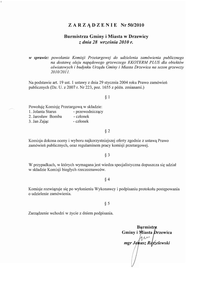 ZARZ1\DZENIE Nr50/2010 Burmistrza Gminy i Miasta w Drzewicy z dnia 28 wrzesnia 2010 r. w sprawie: powolania Komisji Przetargowej do udzielenia zamowienia publicznego na dostawe oleju napedowego grzewczego EKOTERM PLUS dla obiekt6w oswiatowych i budynku Urzedu Gminy i Miasta Drzewica na sezon grzewczy 201012011. Na podstawie art. 19 ust. 1 ustawy z dnia 29 stycznia 2004 roku Prawo zarnowien publicznych (Dz. U. z 2007 r. Nr 223, poz. 1655 z pain. zmianami.) §1 Powoluje Kornisje Przetargowa w skladzie: 1. Jolanta Starus - przewodniczacy 2. Jaroslaw Bomba - czlonek 3. Jan Zajac - czlonek §2 Komisja dokona oceny i wyboru najkorzystniejszej oferty zgodnie z ustawa Prawo zamowien pub1icznych, oraz regulaminem pracy komisji przetargowej. §3 W przypadkach, w ktorych wymaganajest wiedza specjalistyczna dopuszcza sie udzial w skladzie Komisji bieglych rzeczoznawcow. §4 Komisje rozwiazuje sie po wylonieniu Wykonawcy i podpisaniu protokolu postepowania o udzielenie zamowienia. §5 Zarzadzenie wchodzi w zycie z dniem podpisania. rmi~sr iasta rzewica usz R elewski