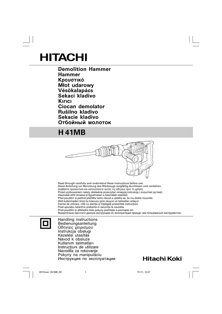 Demolition Hammer Hammer ∫ÚÔ˘ÛÙÈÎfi Młot udarowy Vésökalapács Sekací kladivo Kırıcı Ciocan demolator Rušilno kladivo Sekacie kladivo OÚÄoÈÌêÈ ÏoÎoÚoÍ H 41MB Read through carefully and understand these instructions before use. Diese Anleitung vor Benutzung des Werkzeugs sorgfältig durchlesen und verstehen. ¢È·‚¿ÛÙ ÚÔÛÂÎÙÈο Î·È Î·Ù·ÓÔ‹ÛÂÙ ·˘Ù¤˜ ÙȘ Ô‰ËÁ›Â˜ ÚÈÓ ÙË ¯Ú‹ÛË. Przed użytkowaniem należy dokładnie przeczytać niniejszą instrukcję i zrozumieć jej treść. Használat előtt olvassa el figyelmesen a használati utasítást. Před použitím si pečlivě přečtěte tento návod a ujistěte se, že mu dobře rozumíte. Aleti kullanmadan önce bu kılavuzu iyice okuyun ve talimatları anlayın. Înainte de utilizare, citiţi cu atenţie și înţelegeţi prezentele instrucţiuni. Pred uporabo natančno preberite in razumite ta navodila. Pred použitím si dôkladne tieto pokyny prečítajte a pochopte ich. BÌËÏaÚeÎëÌo ÔpoäÚËÚe ÀaÌÌyï ËÌcÚpyÍáËï Ôo íÍcÔÎyaÚaáËË ÔpeÊÀe äeÏ ÔoÎëÁoÇaÚëcÓ ËÌcÚpyÏeÌÚoÏ. Handling instructions Bedienungsanleitung √‰ËÁ›Â˜ ¯ÂÈÚÈÛÌÔ‡ Instrukcja obsługi Kezelési utasítás Návod k obsluze Kullanım talimatları Instrucţiuni de utilizare Navodila za rokovanje Pokyny na manipuláciu àÌcÚpyÍáËÓ Ôo íÍcÔÎyaÚaáËË 001Cover_H41MB_EE 1 7/1/11, 10:57 1 2 3 1 A 2 3 4 6 3 5 A B 4 5 6 7 8 ▼ ▼ a 17 mm 1 00Table_H41MB_EE 1 7/1/11, 10:55 9 9 a 0 43 6 mm A 73 7 mm English 1 2 3 4 5 6 7 8 Tool shank Front cap Grip (A) Grip (B) Side handle Handle Crank cover 9 Wear limit No. of carbon brush 0 Usual carbon brush A Auto-stop carbon brush 1 Szerszámszár Elülső kupak Karmantyú (A) Deutsch Στέλεχος εργαλείου Μπροστιν κάλυµµα Λαβή (Α) Λαβή (Β) Πλευρική λαβή Λαβή Κάλυµµα στροφάλου !ριο φθοράς Αρ. Καρβουνακίων Uchwyt narzędzia Przednia pokrywa Uchwyt (A) Uchwyt (B) Uchwyt boczny Uchwyt Pokrywa korby Συνηθισµένα καρβουνάκια Zwykła szczotka węglowa Auto-Stop Kohlebürest Καρβουνάκια αυτµατης διακοπής Szczotka węglowa auto stop Magyar Čeština Stopka vrtáku Přední kryt Română Karmantyú (B) Oldalfogantyú Fogantyú Hajtómű burkolata Kopási határ Szénkefe száma Hagyományos szénkefe Držadlo (A) Držadlo (B) Boční držadlo Držadlo Kryt převodovky Mez opotřebení Číslo uhlíkového kartáčku Obvyklý uhlíkový kartáček A Automatikus leállítású szénkefe Uhlíkový kartáček pro automatické zastavení Otomatik Durdurma Kömürü 1 2 Držaj orodja Sprednji pokrov Prijem (A) Prijem (B) Stranska ročica Ročaj Pokrov ročice 9 0 Slovenščina 3 4 5 6 7 8 9 0 A Slovenčina Držadlo náradia Trunchiul uneltei Capac frontal Cap de prindere (A) Cap de prindere (B) Mâner lateral Mâner Capac al manivelei Limita de uzură Nr. periilor de carbon Perie de carbon cu oprire automată Perie de carbon obișnuită PyccÍËÈ CÚepÊeÌë ËÌcÚpyÏeÌÚa èepeÀÌËÈ ÔaÚpoÌ PyÍoÓÚÍa (A) PyÍoÓÚÍa (B) ÅoÍoÇaÓ pyÍoÓÚÍa Št. ogljikovih krtač Predný uzáver Držadlo (A) Držadlo (B) Bočná rukovä Rukovä Kryt kuky Hranica opotrebovania Č. uhlíkovej kefky Običajna karbonska ščetka Štandardná uhlíková kefka Samodejno-ustavljiva ogljikova krtača ìÖoÎëÌaÓ çeÚÍa Uhlíková kefka s aÇÚoÏaÚËäecÍoÈ automatickým zastavením ocÚaÌoÇÍË Meja obrabe Granica zużycia Nr szczotki węglowej Türkçe Takım sapı Ön mandren kapaåı Mandren tutma yeri (A) Mandren tutma yeri (B) Yan kol Kol Krank kapaåı Yıpranma limiti Kömür numarası Normal Kömür 2 3 4 5 6 7 8 Polski Ελληνικά Werkzeugschaft Frontkappe Griff (A) Griff (B) Seitengriff Handgriff Kurbeldeckel Verschleißgrenze Nr. der kohlebürste Gewöhnliche Kohlebürste PyÍoÓÚÍa KpêåÍa ÍopoÄÍË pêäaÖa èpeÀeÎ ËÁÌoca £ yÖoÎëÌoÈ çeÚÍË OÄêäÌaÓ yÖoÎëÌaÓ çeÚÍa 2 00Table_H41MB_EE 2 7/1/11, 10:55 Symbols WARNING Symbole WARNUNG ™‡Ì‚ÔÏ· ¶ƒ√™√Ã∏ The following show symbols used for the machine. Be sure that you understand their meaning before use. Die folgenden Symbole werden für diese Maschine verwendet. Achten Sie darauf, diese vor der Verwendung zu verstehen. Τα παρακάτω δείχνουν τα σύµβολα που χρησιµοποιούνται στο µηχάνηµα. Βεβαιωθείτε τι κατανοείτε τη σηµασίας τους πριν τη χρήση. Read all safety warnings and all instructions. Failure to follow the warnings and instructions may result in electric shock, fire and/or serious injury. Lesen Sie sämtliche Sicherheitshinweise und Anweisungen durch. Wenn die Warnungen und Anweisungen nicht befolgt werden, kann es zu Stromschlag, Brand und/oder ernsthaften Verletzungen kommen. ¢È·‚¿˙ÂÙ fiϘ ÙȘ ÚÔÂȉÔÔÈ‹ÛÂȘ ·ÛÊ·Ï›·˜ Î·È fiϘ ÙȘ Ô‰ËÁ›Â˜. Η µη τήρηση των προειδοποιήσεων και οδηγιών µπορεί να προκαλέσει ηλεκτροπληξία, πυρκαγιά και/ή σοβαρ τραυµατισµ. Only for EU countries Do not dispose of electric tools together with household waste material! In observance of European Directive 2002/96/EC on waste electrical and electronic equipment and its implementation in accordance with national law, electric tools that have reached the end of their life must be collected separately and returned to an environmentally compatible recycling facility. Nur für EU-Länder Werfen Sie Elektrowerkzeuge nicht in den Hausmüll! Gemäss Europäischer Richtlinie 2002/96/EG über Elektro- und Elektronik- Altgeräte und Umsetzung in nationales Recht müssen verbrauchte Elektrowerkzeuge getrennt gesammelt und einer umweltgerechten Wied