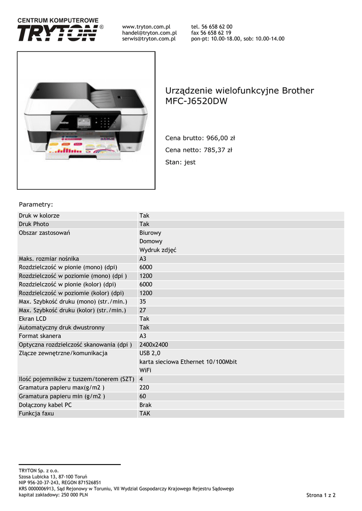www.tryton.com.pl [email protected] [email protected] tel. 56 658 62 00 fax 56 658 62 19 pon-pt: 10.00-18.00, sob: 10.00-14.00 Urządzenie wielofunkcyjne Brother MFC-J6520DW Cena brutto: 966,00 zł Cena netto: 785,37 zł Stan: jest Parametry: Druk w kolorze Druk Photo Obszar zastosowań Tak Tak Biurowy Domowy Wydruk zdjęć Maks. rozmiar nośnika A3 Rozdzielczość w pionie (mono) (dpi) 6000 Rozdzielczość w poziomie (mono) (dpi ) 1200 Rozdzielczość w pionie (kolor) (dpi) 6000 Rozdzielczość w poziomie (kolor) (dpi) 1200 Max. Szybkość druku (mono) (str./min.) 35 Max. Szybkość druku (kolor) (str./min.) 27 Ekran LCD Tak Automatyczny druk dwustronny Tak Format skanera A3 Optyczna rozdzielczość skanowania (dpi ) 2400x2400 Złącze zewnętrzne/komunikacja USB 2,0 karta sieciowa Ethernet 10/100Mbit WiFi Ilość pojemników z tuszem/tonerem (SZT) 4 Gramatura papieru max(g/m2 ) 220 Gramatura papieru min (g/m2 ) 60 Dołączony kabel PC Brak Funkcja faxu TAK TRYTON Sp. z o.o. Szosa Lubicka 13, 87-100 Toruń NIP 956-20-37-243, REGON 871526851 KRS 0000006913, Sąd Rejonowy w Toruniu, VII Wydział Gospodarczy Krajowego Rejestru Sądowego kapitał zakładowy: 250 000 PLN Strona 1 z 2 www.tryton.com.pl [email protected] [email protected] Opis produktu tel. 56 658 62 00 fax 56 658 62 19 pon-pt: 10.00-18.00, sob: 10.00-14.00 MFC-J6520DW - atramentowe urządzenie wielofunkcyjne firmy Brother. To wydajne i proste rozwiązanie w zakresie drukowania, kopiowania, skanowania i faksowania. Urządzenie jest wyposażone w automatyczny podajnik papieru mieszczący 35 arkuszy (do formatu A3) oraz standardowy podajnik papieru, mieszczący 250 arkuszy. Intuicyjną i bezproblemową obsługę modelu zapewnia natomiast dotykowy wyświetlacz LCD o przekątnej 6,8 cm. Dodatkowo, urządzenie MFC-J6520DW wyposażone jest w opcjonalne, wysokowydajne pojemniki z tuszem na 2400 stron (czarny) oraz 1200 stron (kolorowy), a także tryb oszczędzania tuszu pozwalający znacząco obniżyć jego zużycie. Model MFC-J6520DW udostępnia także funkcje drukowania z i skanowania do takich usług chmurowych jak Box, Dropbox, Evernote, Facebook, Flickr, Google Drive, Picasa i SkyDrive oraz drukowanie z tabletów i smartfonów za pośrednictwem Apple AirPrint, Google Cloud Print oraz autorskiej aplikacji Brother iPrint&Scan. Prezentowane urządzenie wykorzystuje aplikacje i rozwiązania Brother do wygodnego zarządzania dokumentami, pozwalające m.in. na skanowanie do wiadomości e-mail, skanowanie i kopiowanie tylko zaznaczonych obszarów dokumentów oraz konwertowanie zeskanowanych lub wydrukowanych dokumentów do formatu edytowalnych dokumentów biurowych jak .pdf, .pptx czy .docx. Mimo dołożenia wszelkich starań nie gwarantujemy, że publikowane dane techniczne nie zawierają uchybień lub błędów. W przypadku jakichkolwiek wątpliwości prosimy przed podjęciem decyzji o kontakt z handlowcem. Przedstawiona oferta cenowa ma charakter informacyjny, nie stanowi oferty handlowej w rozumieniu Art.66 par.1 Kodeksu Cywilnego oraz innych właściwych przepisów prawnych. TRYTON Sp. z o.o. Szosa Lubicka 13, 87-100 Toruń NIP 956-20-37-243, REGON 871526851 KRS 0000006913, Sąd Rejonowy w Toruniu, VII Wydział Gospodarczy Krajowego Rejestru Sądowego kapitał zakładowy: 250 000 PLN Strona 2 z 2