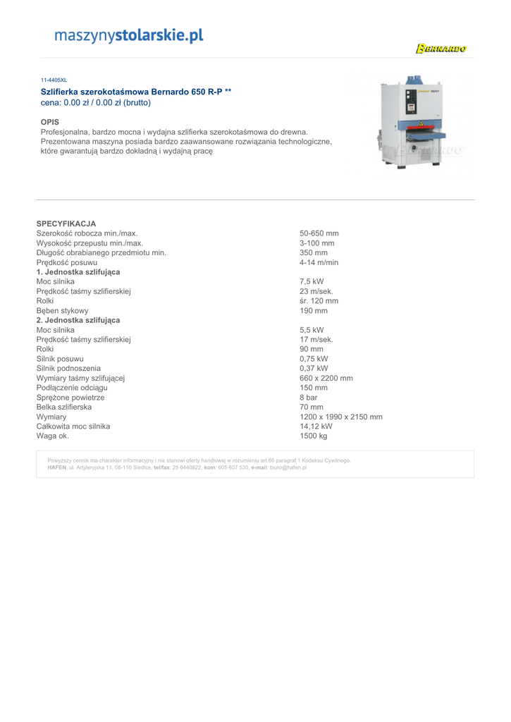 11-4405XL Szlifierka szerokotaśmowa Bernardo 650 R-P ** cena: 0.00 zł / 0.00 zł (brutto) OPIS Profesjonalna, bardzo mocna i wydajna szlifierka szerokotaśmowa do drewna. Prezentowana maszyna posiada bardzo zaawansowane rozwiązania technologiczne, które gwarantują bardzo dokładną i wydajną pracę SPECYFIKACJA Szerokość robocza min./max. Wysokość przepustu min./max. Długość obrabianego przedmiotu min. Prędkość posuwu 1. Jednostka szlifująca Moc silnika Prędkość taśmy szlifierskiej Rolki Bęben stykowy 2. Jednostka szlifująca Moc silnika Prędkość taśmy szlifierskiej Rolki Silnik posuwu Silnik podnoszenia Wymiary taśmy szlifującej Podłączenie odciągu Sprężone powietrze Belka szlifierska Wymiary Całkowita moc silnika Waga ok. 50-650 mm 3-100 mm 350 mm 4-14 m/min 7,5 kW 23 m/sek. śr. 120 mm 190 mm 5,5 kW 17 m/sek. 90 mm 0,75 kW 0,37 kW 660 x 2200 mm 150 mm 8 bar 70 mm 1200 x 1990 x 2150 mm 14,12 kW 1500 kg Powyższy cennik ma charakter informacyjny i nie stanowi oferty handlowej w rozumieniu art.66 paragraf 1 Kodeksu Cywilnego. HAFEN, ul. Artyleryjska 11, 08-110 Siedlce, tel/fax: 25 6440822, kom: 605 607 530, e-mail: [email protected]