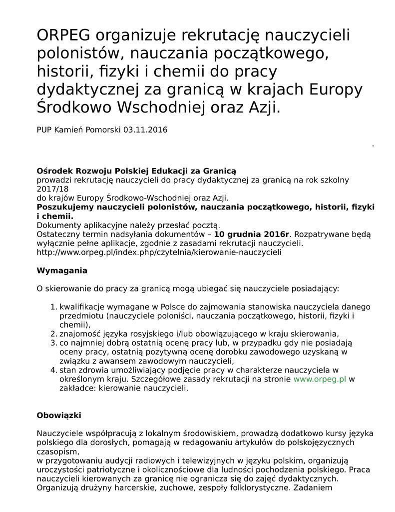 ORPEG organizuje rekrutację nauczycieli polonistów, nauczania początkowego, historii, fizyki i chemii do pracy dydaktycznej za granicą w krajach Europy Środkowo Wschodniej oraz Azji. PUP Kamień Pomorski 03.11.2016 . Ośrodek Rozwoju Polskiej Edukacji za Granicą prowadzi rekrutację nauczycieli do pracy dydaktycznej za granicą na rok szkolny 2017/18 do krajów Europy Środkowo-Wschodniej oraz Azji. Poszukujemy nauczycieli polonistów, nauczania początkowego, historii, fizyki i chemii. Dokumenty aplikacyjne należy przesłać pocztą. Ostateczny termin nadsyłania dokumentów – 10 grudnia 2016r. Rozpatrywane będą wyłącznie pełne aplikacje, zgodnie z zasadami rekrutacji nauczycieli. http://www.orpeg.pl/index.php/czytelnia/kierowanie-nauczycieli Wymagania O skierowanie do pracy za granicą mogą ubiegać się nauczyciele posiadający: 1. kwalifikacje wymagane w Polsce do zajmowania stanowiska nauczyciela danego przedmiotu (nauczyciele poloniści, nauczania początkowego, historii, fizyki i chemii), 2. znajomość języka rosyjskiego i/lub obowiązującego w kraju skierowania, 3. co najmniej dobrą ostatnią ocenę pracy lub, w przypadku gdy nie posiadają oceny pracy, ostatnią pozytywną ocenę dorobku zawodowego uzyskaną w związku z awansem zawodowym nauczycieli, 4. stan zdrowia umożliwiający podjęcie pracy w charakterze nauczyciela w określonym kraju. Szczegółowe zasady rekrutacji na stronie www.orpeg.pl w zakładce: kierowanie nauczycieli. Obowiązki Nauczyciele współpracują z lokalnym środowiskiem, prowadzą dodatkowo kursy języka polskiego dla dorosłych, pomagają w redagowaniu artykułów do polskojęzycznych czasopism, w przygotowaniu audycji radiowych i telewizyjnych w języku polskim, organizują uroczystości patriotyczne i okolicznościowe dla ludności pochodzenia polskiego. Praca nauczycieli kierowanych za granicę nie ogranicza się do zajęć dydaktycznych. Organizują drużyny harcerskie, zuchowe, zespoły folklorystyczne. Zadaniem nauczycieli jest nie tylko nauczanie języka polskiego i promocja polskiej kultury, ale także pomaganie rodakom w kultywowaniu polskich tradycji oraz przybliżanie obrazu współczesnej Polski. Informacje dodatkowe 1. oświadczenia muszą być podpisane własnoręcznie, 2. oferty złożone po terminie lub niezawierające wszystkich dokumentów zostaną odrzucone, 3. w przypadku przedstawienia dokumentów w języku obcym należy dołączyć ich tłumaczenie na język polski dokonane przez tłumacza przysięgłego, 4. kopie złożonych dokumentów aplikacyjnych należy potwierdzić własnoręcznie za zgodność z oryginałem, 5. ORPEG nie zwraca złożonych dokumentów aplikacyjnych. ul. Rolna 175 02-729 Warszawa tel.: +48 22 622 37 92, 22 622 37 93 fax: +48 22 853 87 02, 22 853 87 03 e-mail: [email protected] www.orpeg.pl Załączniki Ogłoszenie ORPEG.pdf