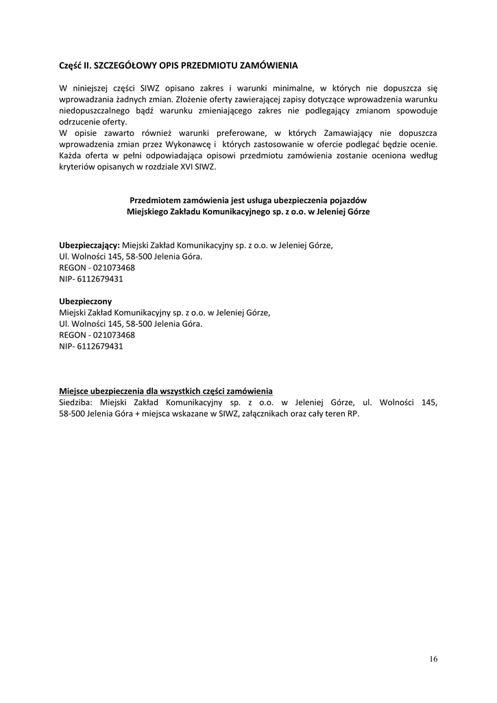 Część II. SZCZEGÓŁOWY OPIS PRZEDMIOTU ZAMÓWIENIA W niniejszej części SIWZ opisano zakres i warunki minimalne, w których nie dopuszcza się wprowadzania żadnych zmian. Złożenie oferty zawierającej zapisy dotyczące wprowadzenia warunku niedopuszczalnego bądź warunku zmieniającego zakres nie podlegający zmianom spowoduje odrzucenie oferty. W opisie zawarto również warunki preferowane, w których Zamawiający nie dopuszcza wprowadzenia zmian przez Wykonawcę i których zastosowanie w ofercie podlegać będzie ocenie. Każda oferta w pełni odpowiadająca opisowi przedmiotu zamówienia zostanie oceniona według kryteriów opisanych w rozdziale XVI SIWZ. Przedmiotem zamówienia jest usługa ubezpieczenia pojazdów Miejskiego Zakładu Komunikacyjnego sp. z o.o. w Jeleniej Górze Ubezpieczający: Miejski Zakład Komunikacyjny sp. z o.o. w Jeleniej Górze, Ul. Wolności 145, 58-500 Jelenia Góra. REGON - 021073468 NIP- 6112679431 Ubezpieczony Miejski Zakład Komunikacyjny sp. z o.o. w Jeleniej Górze, Ul. Wolności 145, 58-500 Jelenia Góra. REGON - 021073468 NIP- 6112679431 Miejsce ubezpieczenia dla wszystkich części zamówienia Siedziba: Miejski Zakład Komunikacyjny sp. z o.o. w Jeleniej Górze, ul. Wolności 145, 58-500 Jelenia Góra + miejsca wskazane w SIWZ, załącznikach oraz cały teren RP. 16 Załącznik nr 1 do OPZ Pakiet 1. Ubezpieczenia komunikacyjne Postanowienia ogólne 1. Opis przedmiotu zamówienia zawiera warunki wykonania zamówienia i klauzule obligatoryjne, które będą mieć pierwszeństwo przed zapisami ogólnych warunków ubezpieczenia wykonawcy, za wyjątkiem zapisów korzystniejszych dla Zamawiającego. 2. Wykonawca dokonuje wyboru klauzul fakultatywnych z pośród klauzul zamieszczonych w niniejszym opisie zamówienia. Brak wyboru klauzul oznacza 0 punktów za drugie kryterium oceny oferty. Przy wykonaniu zamówienia stosowana będzie wyłącznie treść klauzul fakultatywnych niezależnie od tego czy ogólne warunki ubezpieczenia wykonawcy zawierają analogiczne rozwiązania. 3. Niedopuszczalne jest wprowadzanie innych limitów kwotowych jak wskazane w opisie przedmiotu zamówienia ani też stosowanie czasowych ograniczeń odpowiedzialności. Pakiet 1 składa się z następujących zadań : Zadanie 1: Obowiązkowe ubezpieczenie Odpowiedzialności cywilnej posiadacza pojazdów mechanicznych za szkody powstałe w związku z ruchem tych pojazdów Zadanie 2: Ubezpieczenie auto-casco bez ryzyka kradzieży dla autobusów, pojazdy dla których ma zostać włączone ryzyko kradzieży rej: DJ 17136, DJ 45456, DJ 71664, DJ 71835 Zadanie 3: Ubezpieczenie ASSISTANCE Przedmiot ubezpieczenia do zadania 1,2,3 Pakiet 1 – wykaz pojazdów, zgodnie z załącznikiem nr 3 do OPZ. Okres wykonywania zamówienia. Dla zadania 1 Okres wykonywania zamówienia wynosi 2 lata, w ramach którego wydzielone zostają dwa 12-miesieczne okresy ubezpieczenia, gdzie data początkowa okresu ubezpieczenia musi mieścić się w okresie wykonywania zamówienia i będzie właściwa dla danego pojazdu z powodu upływu poprzedniego okresu ubezpieczenia lub wynikać będzie z daty nabycia , rejestracji danego pojazdu. Dla zadania 2 i 3 Okres wykonywania zamówienia wynosi 2 lata, w ramach którego wydzielone zostają dwa 12-miesieczne okresy ubezpieczenia oznaczone datami wg załącznika nr 3 do OPZ. Na każdy okres ubezpieczenia Wykonawca wystawi polisy co najmniej 7 dni przed datą początku danego okresu ubezpieczenia, a w przypadku pojazdów nabytych rejestrowanych w okresie wykonywania zamówienia w dniu zgłoszenia pojazdu do ubezpieczenia. Składka 1. W formularzu oferty Wykonawca podaje stawki i stopy składki w odniesieniu do 12-miesięcznego okresu ubezpieczenia. 2. Stawki i stopy składki przez cały czas wykonania zamówienia nie ulegają zmianie z zastrzeżeniem art. 142 ust 5 ustawy. 17 3. W przypadku konieczności zapłaty składki za okres krótszy niż 12 –miesięcy składka zostanie wyliczona wg. zasady pro rata temporis bez stosowania składki minimalnej. 4. Płatność składki za okres 12- miesięczny nastąpi w 6 równych ratach, płatnych co dwa miesiące. Za dzień zapłaty składki przyjmuje się dzień złożenia dyspozycji przelewu przez zamawiającego pod warunkiem posiadania na koncie odpowiednich środków finansowych. Zadanie 1: Obowiązkowe ubezpieczenie Odpowiedzialności cywilnej posiadacza pojazdów mechanicznych za szkody powstałe w związku z ruchem tych pojazdów Obowiązkowe ubezpieczenie odpowiedzialności cywilnej posiadacza pojazdów mechanicznych za szkody powstałe w związku z ruchem tych pojazdów Ubezpieczone pojazdy – stanowiące własność zamawiającego, użytkowane na podstawie umów leasingu, powierzenia itp. Zgodnie z załącznikiem nr 3 do OPZ. Zakres ubezpieczenie odpowiedzialności cywilnej posiadacza pojazdów mechanicznych za szkody powstałe w związku z ruchem tych pojazdów zgodny z Ustawą z dnia 22.05.2003 r. o ubezpieczeniach obowiązkowych, Ubezpieczeniowym Funduszu Gwarancyjnym i Polskim Biurze Ubezpieczycieli Komunikacyjnych (Dz.U. 2013 poz. 392 j.t. z późn. zm). Suma gwarancyjna na jeden pojazd – zgodna z w/w ustawą – bez podwyższania (w przypadku zwiększenia przez ustawodawcę minimalnej ustawowej sumy gwarancyjnej składka za ubezpieczenie pozostaje bez zmian). Wykonawca zwiększa zakres ochrony o ubezpieczenie OC posiadaczy pojazdów mechanicznych za szkody powstałe w związku z ruchem pojazdów na terenie państw należących do Systemu Zielonej Karty, a nie będących członkami Unii Europejskiej i Europejskiego Obszaru Gospodarczego - tzw. ubezpieczenie Zielona Karta na następujących zasadach: a) Warunki ubezpieczenia zgodne z Ogólnymi Warunkami Ubezpieczenia danego Ubezpieczyciela, dołączanego bezskładkowo do obowiązkowego ubezpieczenia OC posiadaczy pojazdów mechanicznych. b) Suma gwarancyjna: minimalna ustawowa obowiązująca na terenie kraju, w którym Ubezpieczający wyrządził szkodę 