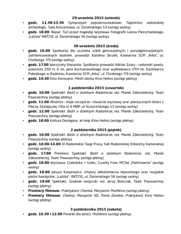 • • • • • • • • • • • • • • • • • • 29 września 2015 (wtorek) godz. 11.30–13.30 Sympozjum popularnonaukowe: Tajemnice radomskiej archeologii, Sala Koncertowa, ul. Żeromskiego 53 (wstęp wolny) godz. 18.00 Nepal. Tuż przed tragedią. Wystawa Fotografii Leona Pierzchalskiego, „Łaźnia”-RKŚTiG ul. Żeromskiego 56 (wstęp wolny) 30 września 2015 (środa) godz. 16.00 Spotkania dla uczniów szkół gimnazjalnych i ponadgimnazjalnych, zainteresowanych teatrem, prowadzi Karolina Skrzek, Kawiarnia SCM „Arka”, ul. Chrobrego 7/9 (wstęp wolny) godz. 17.00 Warsztaty literackie. Spotkania prowadzi Adrian Szary – radomski poeta, polonista ZSO nr 6 im. Jana Kochanowskiego oraz wykładowca UTH im. Kazimierza Pułaskiego w Radomiu, Kawiarnia SCM „Arka”, ul. Chrobrego 7/9 (wstęp wolny) godz. 19.30 Kino Konesera: Pieśń słonia, Kino Helios (wstęp płatny) 1 października 2015 (czwartek) godz. 10.00 Spektakl: Baśń o dzielnym Radomirze, reż. Marek Zákostelecký, Teatr Powszechny (wstęp płatny) godz. 11.00 Rodzina – moje szczęście – otwarcie wystawy prac plastycznych dzieci z Pieczy Zastępczej, Filia nr 6 MBP, ul. Kusocińskiego 13 (wstęp wolny) godz. 12.00 Spektakl: Baśń o dzielnym Radomirze, reż. Marek Zákostelecký, Teatr Powszechny (wstęp płatny) godz. 18.00 Kultura Dostępna: W imię, Kino Helios (wstęp płatny) 2 października 2015 (piątek) godz. 10.00 Spektakl: Baśń o dzielnym Radomirze, reż. Marek Zákostelecký, Teatr Powszechny (wstęp płatny) godz. 10.00–14.00 XI Radomskie Targi Pracy, hall Radomskiej Orkiestry Kameralnej (wstęp wolny) godz. 17.00 Premiera Spektakl: Baśń o dzielnym Radomirze, reż. Marek Zákostelecký, Teatr Powszechny (wstęp płatny) godz. 18.00 Wystawa: Czekalska + Golec, Cruelty Free, MCSW „Elektrownia” (wstęp wolny) godz. 18.00 Janusz Kasprowicz. Utwory Włodzimierza Wysockiego oraz rosyjskie pieśni bandyckie, „Łaźnia”- RKŚTiG, ul. Żeromskiego 56 (wstęp wolny) godz. 19.00 Spektakl: Szalone nożyczki, reż. Jerzy Bończak, Teatr Powszechny (wstęp płatny) Premiery filmowe: Praktykant; Chemia; Marsjanin, Multikino (wstęp płatny) Premiery filmowe: Chemia; Marsjanin 3D; Panie Dulskie; Praktykant, Kino Helios (wstęp płatny) 3 października 2015 (sobota) godz. 10.30 i 12.00 Poranki dla dzieci, Multikino (wstęp płatny) • • • • • • • • • • • • • • • • • godz. 11.00 Sporty motorowe dla osób niepełnosprawnych – uczyńmy świat bliższym, Automobilklub, ul. Warszawska 17/21 (wstęp wolny) godz. 12.00 „Star Wars Rebelianci: Oblężenie Lothal” – specjalny, godzinny odcinek na otwarcie drugiego sezonu serialu!, Kino Helios (wstęp płatny) godz. 17.00 Skład Doczepiony. Wystawa nieformalnej grupy artystów z Sanoka, Radomia i Starachowic, „Łaźnia”- RKŚTiG, ul. Traugutta 31/33 (wstęp wolny) godz. 17.00 Wykład nauczyciela Buddyzmu Diamentowej Drogi, Marka Witka Wolność i radość w Buddyzmie Diamentowej Drogi, MCSW „Elektrownia” (wstęp wolny) godz. 18.30 M-3. VI Przegląd Małych Form Teatralnych. Przypadek – Marta Klubowicz czyta Szymborską, DK „Borki” (wstęp płatny) godz. 19.00 Spektakl: Szalone nożyczki, reż. Jerzy Bończak, Teatr Powszechny (wstęp płatny) 4 października 2015 (niedziela) godz. 10.30 i 12.00 Poranki dla dzieci, Multikino (wstęp płatny) godz. 12.00 „Star Wars Rebelianci: Oblężenie Lothal” – specjalny, godzinny odcinek na otwarcie drugiego sezonu serialu!, Kino Helios (wstęp płatny) godz. 12.00–19.00 Festiwal Ziemniaka, Muzeum Wsi Radomskiej (wstęp płatny) godz. 13.00 Spektakl: Baśń o dzielnym Radomirze, reż. Marek Zákostelecký, Teatr Powszechny (wstęp płatny) godz. 16.00 Spektakl: Szalone nożyczki, reż. Jerzy Bończak, Teatr Powszechny (wstęp płatny) godz. 17.00 Spotkanie Klubu Seniora Samotnych Serc, DK „Idalin” (wstęp płatny) godz. 19.00 Tydzień Kultury Chrześcijańskiej.„Satyra w życiu publicznym” – rozmowa z Janem Pietrzakiem, Kościół p.w. Matki Bożej Miłosierdzia, ul. Struga 31 A (wstęp wolny) 5 października 2015 (poniedziałek) godz. 12.00 Tydzień Kultury Chrześcijańskiej. Otwarcie 3 edycji Kiermaszu Książki Katolickiej, Miejska Biblioteka Publiczna (wstęp wolny) godz. 12.00 Tydzień Kultury Chrześcijańskiej. Otwarcie wystawy Za drzwiami duszy i słów – poświęconej poezji księdza Jana Twardowskiego. Ekspozycja została przygotowana z okazji 100. rocznicy urodzin Księdza, Miejska Biblioteka Publiczna (sala 36) (wstęp wolny) godz. 16.00 Menopauza – nie taki diabeł straszny jak go malują – wykład Lidii Chrząstek, socjologa medycyny, wpisujący się w cykl Akademii Zdrowia Forever, Miejska Biblioteka Publiczna, Filia nr 16, ul. Barycka 6 (wstęp wolny) godz. 18.00 Tydzień Kultury Chrześcijańskiej. Projekcja filmu Czy naprawdę wierzysz?, Kino Helios (wstęp płatny) godz. 18.00 Parafia Ewangelicko-Augsburska zaprasza na wykład w ramach cyklu pt. Czy znasz Kościół Ewangelicki? Wykład pt. Sakrament Komunii Świętej według Dużego Katechizmu ks. dr. Marcina Lutra, Dom parafialny, ul. Reja 6 (wstęp wolny)