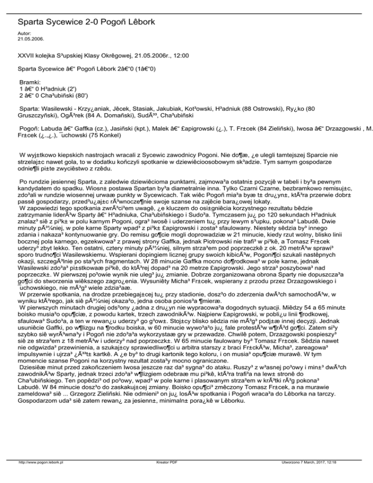 Sparta Sycewice 2-0 Pogoñ Lêbork Autor: 21.05.2006. XXVII kolejka S³upskiej Klasy Okrêgowej, 21.05.2006r., 12:00 Sparta Sycewice – Pogoñ Lêbork 2–0 (1–0) Bramki: 1 – 0 H³adniuk (2') 2 – 0 Cha³ubiñski (80') Sparta: Wasilewski - Krzy¿aniak, Jêcek, Stasiak, Jakubiak, Kot³owski, H³adniuk (88 Ostrowski), Ry¿ko (80 Gruszczyñski), Ogórek (84 A. Domañski), Sudó³, Cha³ubiñski Pogoñ: Labuda – Gaffka (cz.), Jasiñski (kpt.), Malek – £apigrowski (¿.), T. Fr±cek (84 Zieliñski), Iwosa – Drzazgowski , M. Fr±cek (¿.,¿.), ¯uchowski (75 Konkel) W wyj±tkowo kiepskich nastrojach wracali z Sycewic zawodnicy Pogoni. Nie do¶æ, ¿e ulegli tamtejszej Sparcie nie strzelaj±c nawet gola, to w dodatku koñczyli spotkanie w dziewiêcioosobowym sk³adzie. Tym samym gospodarze odnie¶li pi±te zwyciêstwo z rzêdu. Po rundzie jesiennej Sparta, z zaledwie dziewiêcioma punktami, zajmowa³a ostatni± pozycjê w tabeli i by³a pewnym kandydatem do spadku. Wiosn± postawa Spartan by³a diametralnie inna. Tylko Czarni Czarne, bezbramkowo remisuj±c, zdo³ali w rundzie wiosennej urwaæ punkty w Sycewicach. Tak wiêc Pogoñ mia³a byæ t± dru¿yn±, która przerwie dobr± passê gospodarzy, przed³u¿aj±c równocze¶nie swoje szanse na zajêcie bara¿owej lokaty. W zapowiedzi tego spotkania zwróci³em uwagê, ¿e kluczem do osi±gniêcia korzystnego rezultatu bêdzie zatrzymanie liderów Sparty – H³adniuka, Cha³ubiñskiego i Sudo³a. Tymczasem ju¿ po 120 sekundach H³adniuk znalaz³ siê z pi³k± w polu karnym Pogoni, ogra³ Iwosê i uderzeniem tu¿ przy lewym s³upku, pokona³ Labudê. Dwie minuty pó¼niej, w pole karne Sparty wpad³ z pi³k± £apigrowski i zosta³ sfaulowany. Niestety sêdzia by³ innego zdania i nakaza³ kontynuowanie gry. Do remisu go¶cie mogli doprowadziæ w 21 minucie, kiedy rzut wolny, blisko linii bocznej pola karnego, egzekwowa³ z prawej strony Gaffka, jednak Piotrowski nie trafi³ w pi³kê, a Tomasz Fr±cek uderzy³ zbyt lekko. Ten ostatni, cztery minuty pó¼niej, silnym strza³em pod poprzeczkê z ok. 20 metrów sprawi³ sporo trudno¶ci Wasilewskiemu. Wspierani dopingiem licznej grupy swoich kibiców, Pogoni¶ci szukali nastêpnych okazji, szczególnie po sta³ych fragmentach. W 28 minucie Gaffka mocno do¶rodkowa³ w pole karne, jednak Wasilewski zdo³a³ pi±stkowaæ pi³kê, do której dopad³ na 20 metrze £apigrowski. Jego strza³ poszybowa³ nad poprzeczk±. W pierwszej po³owie wynik nie uleg³ ju¿ zmianie. Dobrze zorganizowana obrona Sparty nie dopuszcza³a go¶ci do stworzenia wiêkszego zagro¿enia. Wysuniêty Micha³ Fr±cek, wspierany z przodu przez Drzazgowskiego i ¯uchowskiego, nie móg³ wiele zdzia³aæ. W przerwie spotkania, na drodze przebiegaj±cej tu¿ przy stadionie, dosz³o do zderzenia dwóch samochodów, w wyniku którego, jak siê pó¼niej okaza³o, jedna osoba ponios³a ¶mieræ. W pierwszych minutach drugiej ods³ony ¿adna z dru¿yn nie wypracowa³a dogodnych sytuacji. Miêdzy 54 a 65 minut± boisko musia³o opu¶ciæ, z powodu kartek, trzech zawodników. Najpierw £apigrowski, w pobli¿u linii ¶rodkowej, sfaulowa³ Sudo³a, a ten w rewan¿u uderzy³ go g³ow±. Stoj±cy blisko sêdzia nie móg³ podj±æ innej decyzji. Jednak usuniêcie Gaffki, po w¶lizgu na ¶rodku boiska, w 60 minucie wywo³a³o ju¿ fale protestów w¶ród go¶ci. Zatem si³y szybko siê wyrówna³y i Pogoñ nie zdo³a³a wykorzystaæ gry w przewadze. Chwilê potem, Drzazgowski pospieszy³ siê ze strza³em z 18 metrów i uderzy³ nad poprzeczk±. W 65 minucie faulowany by³ Tomasz Fr±cek. Sêdzia nawet nie odgwizda³ przewinienia, a szukaj±cy sprawiedliwo¶ci u arbitra starszy z braci Fr±cków, Micha³, zareagowa³ impulsywnie i ujrza³ ¿Ã³³t± kartkê. A ¿e by³ to drugi kartonik tego koloru, i on musia³ opu¶ciæ murawê. W tym momencie szanse Pogoni na korzystny rezultat zosta³y mocno ograniczone. Dziesiêæ minut przed zakoñczeniem Iwosa jeszcze raz da³ sygna³ do ataku. Ruszy³ z w³asnej po³owy i min±³ dwóch zawodników Sparty, jednak trzeci zdo³a³ w¶lizgiem odebraæ mu pi³kê, która trafi³a na lew± stronê do Cha³ubiñskiego. Ten popêdzi³ od po³owy, wpad³ w pole karne i plasowanym strza³em w krótki róg pokona³ Labudê. W 84 minucie dosz³o do zaskakuj±cej zmiany. Boisko opu¶ci³ zmêczony Tomasz Fr±cek, a na murawie zameldowa³ siê ... Grzegorz Zieliñski. Nie odmieni³ on ju¿ losów spotkania i Pogoñ wraca³a do Lêborka na tarczy. Gospodarzom uda³ siê zatem rewan¿ za jesienn±, minimaln± pora¿kê w Lêborku. http://www.pogon.lebork.pl Kreator PDF Utworzono 7 March, 2017, 12:18