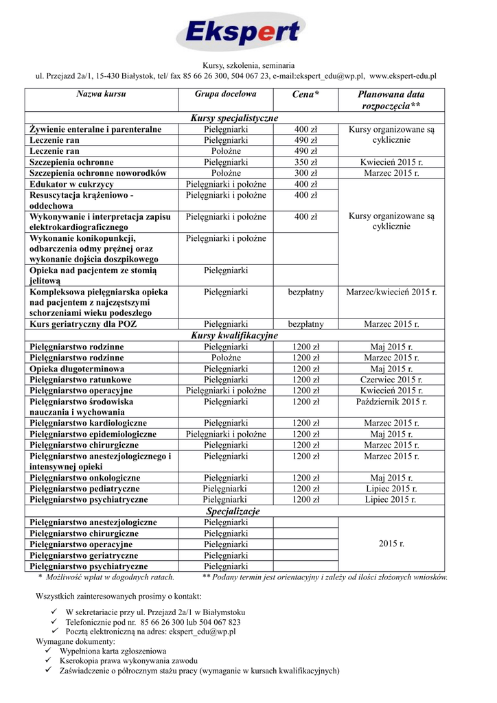 Kursy, szkolenia, seminaria ul. Przejazd 2a/1, 15-430 Białystok, tel/ fax 85 66 26 300, 504 067 23, e-mail:[email protected], www.ekspert-edu.pl Nazwa kursu Grupa docelowa Cena* Planowana data rozpoczęcia** Pielęgniarki Pielęgniarki Położne Pielęgniarki Położne Pielęgniarki i położne Pielęgniarki i położne 400 zł 490 zł 490 zł 350 zł 300 zł 400 zł 400 zł Kursy organizowane są cyklicznie Pielęgniarki i położne 400 zł Kursy organizowane są cyklicznie Pielęgniarki bezpłatny Marzec/kwiecień 2015 r. Pielęgniarki bezpłatny Marzec 2015 r. Pielęgniarki Położne Pielęgniarki Pielęgniarki Pielęgniarki i położne Pielęgniarki 1200 zł 1200 zł 1200 zł 1200 zł 1200 zł 1200 zł Maj 2015 r. Marzec 2015 r. Maj 2015 r. Czerwiec 2015 r. Kwiecień 2015 r. Październik 2015 r. Pielęgniarki Pielęgniarki i położne Pielęgniarki Pielęgniarki 1200 zł 1200 zł 1200 zł 1200 zł Marzec 2015 r. Maj 2015 r. Marzec 2015 r. Marzec 2015 r. Pielęgniarki Pielęgniarki Pielęgniarki 1200 zł 1200 zł 1200 zł Maj 2015 r. Lipiec 2015 r. Lipiec 2015 r. Kursy specjalistyczne Żywienie enteralne i parenteralne Leczenie ran Leczenie ran Szczepienia ochronne Szczepienia ochronne noworodków Edukator w cukrzycy Resuscytacja krążeniowo oddechowa Wykonywanie i interpretacja zapisu elektrokardiograficznego Wykonanie konikopunkcji, odbarczenia odmy prężnej oraz wykonanie dojścia doszpikowego Opieka nad pacjentem ze stomią jelitową Kompleksowa pielęgniarska opieka nad pacjentem z najczęstszymi schorzeniami wieku podeszłego Kurs geriatryczny dla POZ Kwiecień 2015 r. Marzec 2015 r. Pielęgniarki i położne Pielęgniarki Kursy kwalifikacyjne Pielęgniarstwo rodzinne Pielęgniarstwo rodzinne Opieka długoterminowa Pielęgniarstwo ratunkowe Pielęgniarstwo operacyjne Pielęgniarstwo środowiska nauczania i wychowania Pielęgniarstwo kardiologiczne Pielęgniarstwo epidemiologiczne Pielęgniarstwo chirurgiczne Pielęgniarstwo anestezjologicznego i intensywnej opieki Pielęgniarstwo onkologiczne Pielęgniarstwo pediatryczne Pielęgniarstwo psychiatryczne Specjalizacje Pielęgniarstwo anestezjologiczne Pielęgniarstwo chirurgiczne Pielęgniarstwo operacyjne Pielęgniarstwo geriatryczne Pielęgniarstwo psychiatryczne * Możliwość wpłat w dogodnych ratach. Pielęgniarki Pielęgniarki Pielęgniarki Pielęgniarki Pielęgniarki 2015 r. ** Podany termin jest orientacyjny i zależy od ilości złożonych wniosków. Wszystkich zainteresowanych prosimy o kontakt: W sekretariacie przy ul. Przejazd 2a/1 w Białymstoku Telefonicznie pod nr. 85 66 26 300 lub 504 067 823 Pocztą elektroniczną na adres: [email protected] Wymagane dokumenty: Wypełniona karta zgłoszeniowa Kserokopia prawa wykonywania zawodu Zaświadczenie o półrocznym stażu pracy (wymaganie w kursach kwalifikacyjnych)