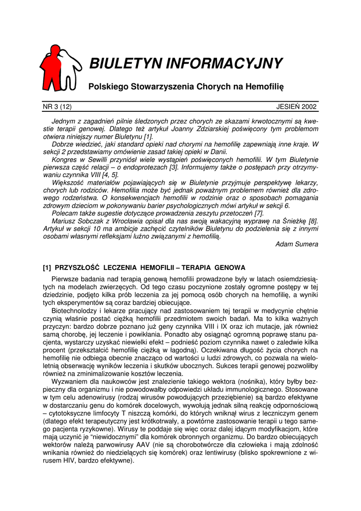BIULETYN INFORMACYJNY Polskiego Stowarzyszenia Chorych na Hemofilię NR 3 (12) JESIEŃ 2002 Jednym z zagadnień pilnie śledzonych przez chorych ze skazami krwotocznymi są kwestie terapii genowej. Dlatego też artykuł Joanny Zdziarskiej poświęcony tym problemom otwiera niniejszy numer Biuletynu [1]. Dobrze wiedzieć, jaki standard opieki nad chorymi na hemofilię zapewniają inne kraje. W sekcji 2 przedstawiamy omówienie zasad takiej opieki w Danii. Kongres w Sewilli przyniósł wiele wystąpień poświęconych hemofilii. W tym Biuletynie pierwsza część relacji – o endoprotezach [3]. Informujemy także o postępach przy otrzymywaniu czynnika VIII [4, 5]. Większość materiałów pojawiających się w Biuletynie przyjmuje perspektywę lekarzy, chorych lub rodziców. Hemofilia może być jednak poważnym problemem również dla zdrowego rodzeństwa. O konsekwencjach hemofilii w rodzinie oraz o sposobach pomagania zdrowym dzieciom w pokonywaniu barier psychologicznych mówi artykuł w sekcji 6. Polecam także sugestie dotyczące prowadzenia zeszytu przetoczeń [7]. Mariusz Sobczak z Wrocławia opisał dla nas swoją wakacyjną wyprawę na Śnieżkę [8]. Artykuł w sekcji 10 ma ambicje zachęcić czytelników Biuletynu do podzielenia się z innymi osobami własnymi refleksjami luźno związanymi z hemofilią. Adam Sumera [1] PRZYSZŁOŚĆ LECZENIA HEMOFILII – TERAPIA GENOWA Pierwsze badania nad terapią genową hemofilii prowadzone były w latach osiemdziesiątych na modelach zwierzęcych. Od tego czasu poczynione zostały ogromne postępy w tej dziedzinie, podjęto kilka prób leczenia za jej pomocą osób chorych na hemofilię, a wyniki tych eksperymentów są coraz bardziej obiecujące. Biotechnolodzy i lekarze pracujący nad zastosowaniem tej terapii w medycynie chętnie czynią właśnie postać ciężką hemofilii przedmiotem swoich badań. Ma to kilka ważnych przyczyn: bardzo dobrze poznano już geny czynnika VIII i IX oraz ich mutacje, jak również samą chorobę, jej leczenie i powikłania. Ponadto aby osiągnąć ogromną poprawę stanu pacjenta, wystarczy uzyskać niewielki efekt – podnieść poziom czynnika nawet o zaledwie kilka procent (przekształcić hemofilię ciężką w łagodną). Oczekiwana długość życia chorych na hemofilię nie odbiega obecnie znacząco od wartości u ludzi zdrowych, co pozwala na wieloletnią obserwację wyników leczenia i skutków ubocznych. Sukces terapii genowej pozwoliłby również na zminimalizowanie kosztów leczenia. Wyzwaniem dla naukowców jest znalezienie takiego wektora (nośnika), który byłby bezpieczny dla organizmu i nie powodowałby odpowiedzi układu immunologicznego. Stosowane w tym celu adenowirusy (rodzaj wirusów powodujących przeziębienie) są bardzo efektywne w dostarczaniu genu do komórek docelowych, wywołują jednak silną reakcję odpornościową – cytotoksyczne limfocyty T niszczą komórki, do których wniknął wirus z leczniczym genem (dlatego efekt terapeutyczny jest krótkotrwały, a powtórne zastosowanie terapii u tego samego pacjenta ryzykowne). Wirusy te poddaje się więc coraz dalej idącym modyfikacjom, które mają uczynić je “niewidocznymi” dla komórek obronnych organizmu. Do bardzo obiecujących wektorów należą parwowirusy AAV (nie są chorobotwórcze dla człowieka i mają zdolność wnikania również do niedzielących się komórek) oraz lentiwirusy (blisko spokrewnione z wirusem HIV, bardzo efektywne). W kwietniu 2002 r. w Filadelfii odbyła się piąta konferencja dotycząca terapii genowej w hemofilii zorganizowana przez amerykańską National Hemophilia Foundation. Zaprezentowano tam najnowsze osiągnięcia w tej dziedzinie i wyniki dotychczasowych badań. Przedstawione zostały prowadzone aktualnie badania I fazy, tzn. takie, w których terapia jest testowana pod kątem działań niepożądanych na bardzo małej grupie pacjentów: W Północnej Karolinie użyto zmodyfikowanych adenowirusów do wprowadzenia genu czynnika VIII do komórek wątroby jednego pacjenta. W rezultacie poziom czynnika w jego krwi wzrósł do 1–1,5% normy. Niestety pacjent rozwinął reakcję zapalną w odpowiedzi na obecność wirusa (wysoka gorączka i wzrost poziomu enzymów wątrobowych), w związku z czym zatrzymano program, jednak planowane jest jego wznowienie z użyciem niższych dawek. W Kalifornii użyto jako nośnika rekombinowanego wirusa AAV. Gen kodujący czynnik IX wprowadzono w niskich dawkach przez tętnicę wątrobową do wątroby dwóch pacjentów. Osiągnięto wzrost poziomu czynnika do około 1%. Nie pojawiły się przeciwciała przeciwko czynnikowi IX, a parametry wątroby i nerek nie pogorszyły się. Niestety wykryto obecność wektora w nasieniu obu pacjentów. Chociaż nie ma dowodów na to, iż mógłby on być przekazywany z pokolenia na pokolenie, należy zastosować najwyższe środki ostrożności w tej kwestii. U pierwszego pacjenta wirus przestał być wykrywalny w spermie po dziesięciu tygodniach. Następny etap programu, w którym terapia w wyższej dawce podana będzie czterem osobom, nie rozpocznie się, dopóki wirus nie zniknie z nasienia drugiego pacjenta. Sam gen kodujący czynnik VIII poddawany jest kolejnym manipulacjom, mającym na celu jego zmniejszenie (jako dużo większy od genu czynnika IX jest trudniejszy do “upakowania” do wnętrza wektora) oraz polepszenie właściwości produkowanego przez niego białka – zwiększenie jego wydzielania, aktywności, przedłużenie czasu półtrwania. Trwają również prace nad metodami podawania genu czynnika VIII i IX przez inhalację (bez użycia nośnika wirusowego). Być może niedługo czynnik będzie podawany chorym doustnie, ta droga jest możliwa dzięki wyhodowaniu transgenicznych świń, produkujących i wydzielających czynnik IX z mlekiem. Byłoby to szczególnie przydatne w krajach trzeciego świata jako tania (bardzo wydajna) i łatwa w stosowaniu metoda leczenia. Na zwierzętach ba
