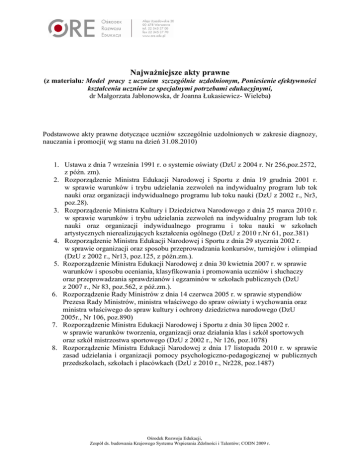 NajwaŜniejsze akty prawne (z materiału: Model pracy z uczniem szczególnie uzdolnionym, Poniesienie efektywności kształcenia uczniów ze specjalnymi potrzebami edukacyjnymi, dr Małgorzata Jabłonowska, dr Joanna Łukasiewicz- Wieleba) Podstawowe akty prawne dotyczące uczniów szczególnie uzdolnionych w zakresie diagnozy, nauczania i promocji( wg stanu na dzień 31.08.2010) 1. Ustawa z dnia 7 września 1991 r. o systemie oświaty (DzU z 2004 r. Nr 256,poz.2572, z późn. zm). 2. Rozporządzenie Ministra Edukacji Narodowej i Sportu z dnia 19 grudnia 2001 r. w sprawie warunków i trybu udzielania zezwoleń na indywidualny program lub tok nauki oraz organizacji indywidualnego programu lub toku nauki (DzU z 2002 r., Nr3, poz.28). 3. Rozporządzenie Ministra Kultury i Dziedzictwa Narodowego z dnia 25 marca 2010 r. w sprawie warunków i trybu udzielania zezwoleń na indywidualny program lub tok nauki oraz organizacji indywidualnego programu i toku nauki w szkołach artystycznych nierealizujących kształcenia ogólnego (DzU z 2010 r.Nr 61, poz.381) 4. Rozporządzenie Ministra Edukacji Narodowej i Sportu z dnia 29 stycznia 2002 r. w sprawie organizacji oraz sposobu przeprowadzania konkursów, turniejów i olimpiad (DzU z 2002 r., Nr13, poz.125, z późn.zm.). 5. Rozporządzenie Ministra Edukacji Narodowej z dnia 30 kwietnia 2007 r. w sprawie warunków i sposobu oceniania, klasyfikowania i promowania uczniów i słuchaczy oraz przeprowadzania sprawdzianów i egzaminów w szkołach publicznych (DzU z 2007 r., Nr 83, poz.562, z póź.zm.). 6. Rozporządzenie Rady Ministrów z dnia 14 czerwca 2005 r. w sprawie stypendiów Prezesa Rady Ministrów, ministra właściwego do spraw oświaty i wychowania oraz ministra właściwego do spraw kultury i ochrony dziedzictwa narodowego (DzU 2005r., Nr 106, poz.890) 7. Rozporządzenie Ministra Edukacji Narodowej i Sportu z dnia 30 lipca 2002 r. w sprawie warunków tworzenia, organizacji oraz działania klas i szkół sportowych oraz szkół mistrzostwa sportowego (DzU z 2002 r., Nr 126, poz.1078) 8. Rozporządzenie Ministra Edukacji Narodowej z dnia 17 listopada 2010 r. w sprawie zasad udzielania i organizacji pomocy psychologiczno-pedagogicznej w publicznych przedszkolach, szkołach i placówkach (DzU z 2010 r., Nr228, poz.1487) Ośrodek Rozwoju Edukacji, Zespół ds. budowania Krajowego Systemu Wspierania Zdolności i Talentów; CODN 2009 r.