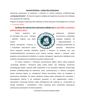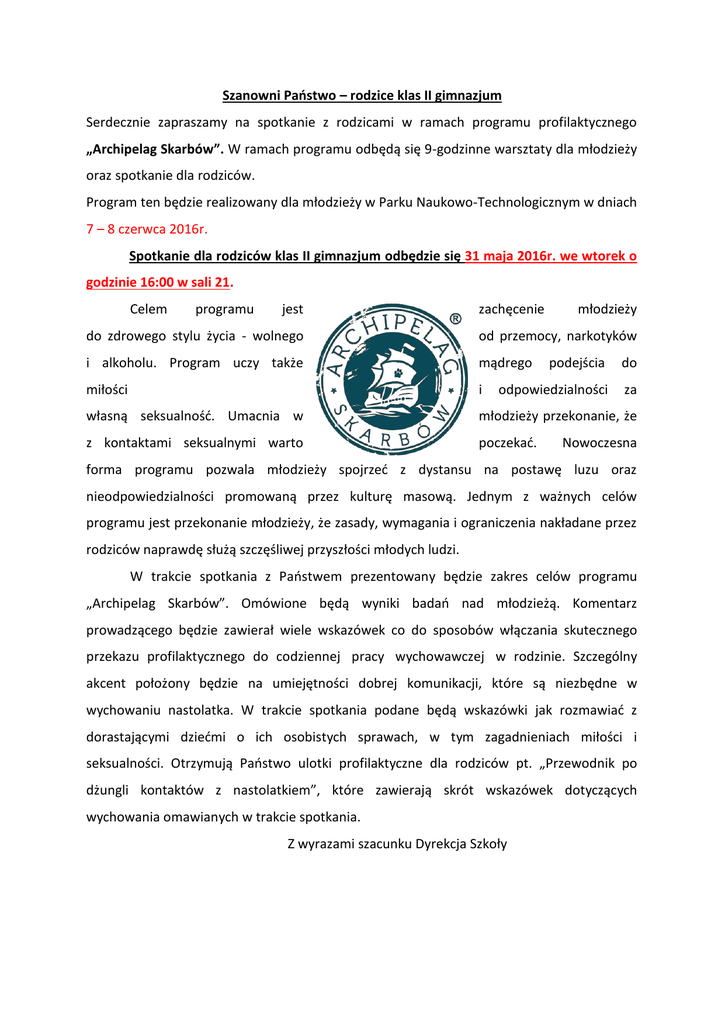 Szanowni Państwo – rodzice klas II gimnazjum Serdecznie zapraszamy na spotkanie z rodzicami w ramach programu profilaktycznego „Archipelag Skarbów”. W ramach programu odbędą się 9-godzinne warsztaty dla młodzieży oraz spotkanie dla rodziców. Program ten będzie realizowany dla młodzieży w Parku Naukowo-Technologicznym w dniach 7 – 8 czerwca 2016r. Spotkanie dla rodziców klas II gimnazjum odbędzie się 31 maja 2016r. we wtorek o godzinie 16:00 w sali 21. Celem programu jest zachęcenie młodzieży do zdrowego stylu życia - wolnego od przemocy, narkotyków i alkoholu. Program uczy także mądrego miłości i własną seksualność. Umacnia w młodzieży przekonanie, że z kontaktami seksualnymi warto poczekać. podejścia do odpowiedzialności za Nowoczesna forma programu pozwala młodzieży spojrzeć z dystansu na postawę luzu oraz nieodpowiedzialności promowaną przez kulturę masową. Jednym z ważnych celów programu jest przekonanie młodzieży, że zasady, wymagania i ograniczenia nakładane przez rodziców naprawdę służą szczęśliwej przyszłości młodych ludzi. W trakcie spotkania z Państwem prezentowany będzie zakres celów programu „Archipelag Skarbów”. Omówione będą wyniki badań nad młodzieżą. Komentarz prowadzącego będzie zawierał wiele wskazówek co do sposobów włączania skutecznego przekazu profilaktycznego do codziennej pracy wychowawczej w rodzinie. Szczególny akcent położony będzie na umiejętności dobrej komunikacji, które są niezbędne w wychowaniu nastolatka. W trakcie spotkania podane będą wskazówki jak rozmawiać z dorastającymi dziećmi o ich osobistych sprawach, w tym zagadnieniach miłości i seksualności. Otrzymują Państwo ulotki profilaktyczne dla rodziców pt. „Przewodnik po dżungli kontaktów z nastolatkiem”, które zawierają skrót wskazówek dotyczących wychowania omawianych w trakcie spotkania. Z wyrazami szacunku Dyrekcja Szkoły