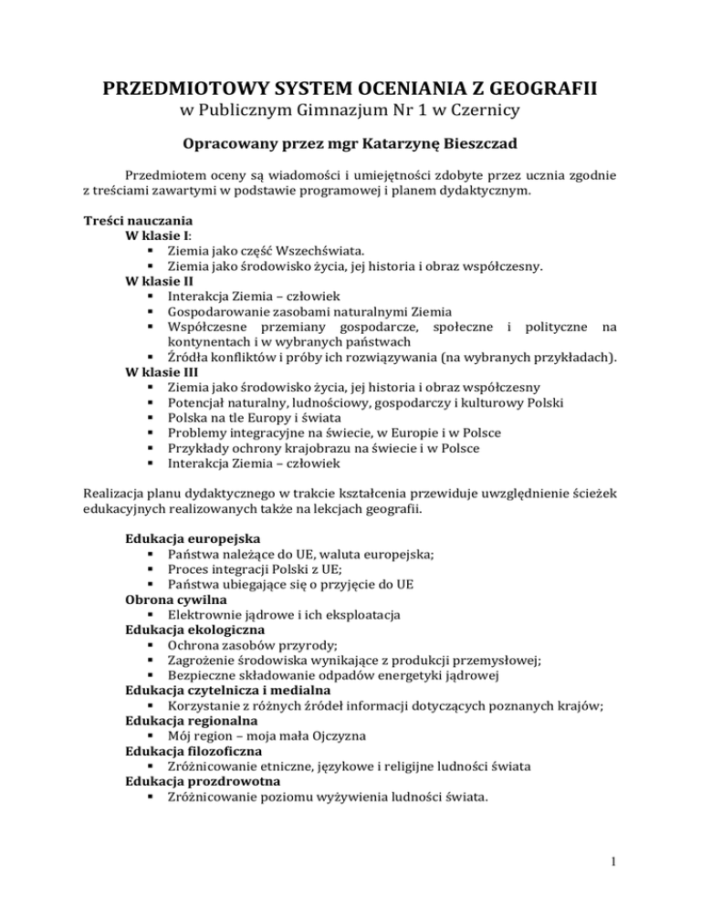 PRZEDMIOTOWY SYSTEM OCENIANIA Z GEOGRAFII w Publicznym Gimnazjum Nr 1 w Czernicy Opracowany przez mgr Katarzynę Bieszczad Przedmiotem oceny są wiadomości i umiejętności zdobyte przez ucznia zgodnie z treściami zawartymi w podstawie programowej i planem dydaktycznym. Treści nauczania W klasie I: Ziemia jako część Wszechświata. Ziemia jako środowisko życia, jej historia i obraz współczesny. W klasie II Interakcja Ziemia – człowiek Gospodarowanie zasobami naturalnymi Ziemia Współczesne przemiany gospodarcze, społeczne i polityczne na kontynentach i w wybranych państwach Źródła konfliktów i próby ich rozwiązywania (na wybranych przykładach). W klasie III Ziemia jako środowisko życia, jej historia i obraz współczesny Potencjał naturalny, ludnościowy, gospodarczy i kulturowy Polski Polska na tle Europy i świata Problemy integracyjne na świecie, w Europie i w Polsce Przykłady ochrony krajobrazu na świecie i w Polsce Interakcja Ziemia – człowiek Realizacja planu dydaktycznego w trakcie kształcenia przewiduje uwzględnienie ścieżek edukacyjnych realizowanych także na lekcjach geografii. Edukacja europejska Państwa należące do UE, waluta europejska; Proces integracji Polski z UE; Państwa ubiegające się o przyjęcie do UE Obrona cywilna Elektrownie jądrowe i ich eksploatacja Edukacja ekologiczna Ochrona zasobów przyrody; Zagrożenie środowiska wynikające z produkcji przemysłowej; Bezpieczne składowanie odpadów energetyki jądrowej Edukacja czytelnicza i medialna Korzystanie z różnych źródeł informacji dotyczących poznanych krajów; Edukacja regionalna Mój region – moja mała Ojczyzna Edukacja filozoficzna Zróżnicowanie etniczne, językowe i religijne ludności świata Edukacja prozdrowotna Zróżnicowanie poziomu wyżywienia ludności świata. 1 1. ZAŁOŻENIA DYDAKTYCZNE I WYCHOWAWCZE PROGRAMU Edukacja geograficzna w gimnazjum stwarza uczniowi możliwości do: zrozumienia otaczającego nas świata i poruszania się w przestrzeni geograficznej; przygotowania do przemian społecznych, gospodarczych i politycznych zachodzących w regionie, kraju i na świecie; kształtowania postaw ludzi otwartych, aktywnych, tolerancyjnych i twórczych; świadomego podejmowania decyzji. 2. FORMY I METODY SPRAWDZANIA I OCENIANIA OSIĄGNIĘĆ UCZNIA Przedmiotem oceny są: a) wiadomości b) umiejętności c) postawa - aktywność, systematyczność, samodzielność w pracy, współpracy w grupie, praca domowa, prezentacja przygotowanej samodzielnie siebie pracy. Ocenie podlegać będzie: – wiedza (znajomość problemów geograficznych) w szerokim znaczeniu; – umiejętność logicznego łączenia poszczególnych elementów geograficznych; – trafność określania zjawisk geograficznych; – umiejętność posługiwania się atlasem; – wkład w pracę i przygotowanie się do lekcji; – aktywność na lekcji (udział w dyskusjach: argumentowanie, przekonywanie); – formy aktywności dodatkowej (samodzielne przygotowanie referatów, przedstawianie własnych poglądów); Uczniowie w toku zajęć lekcyjnych mogą otrzymywać oceny cząstkowe za: krótkie sprawdziany wiedzy – kartkówki; odpowiedź ustną (połączoną ze znajomością mapy); sprawdzian wiadomości po zakończonym dziale; samodzielnie wykonaną pracę domową; aktywność na lekcji (lub jej brak); przygotowanie do lekcji (przynoszenie atlasów geograficznych, zeszytów przedmiotowych i zeszytów ćwiczeń); krótkie odpowiedzi w toku lekcji; pisemne zadania testowe; udział w dyskusjach; prezentowanie pracy grupy; prezentację dłuższych wypowiedzi popartych literaturą; sporządzenie map myślowych, posterów; wykonanie prac dodatkowych (zaproponowanych przez ucznia lub wskazanych przez nauczyciela), wynikających z zainteresowań ucznia, wiążących się z programem jak i wykraczające poza program np.: własne działania na rzecz środowiska potwierdzone przez dorosłych, przygotowanie materiału do nowej lekcji, zorganizowanie wystawy, konkursu itp., 2 Zarówno odpowiedzi ustne jak i pisemne powinny być oparte o umiejętność korzystania z różnych źródeł informacji: podręcznika, zeszytu ćwiczeń, map różnej treści, rocznika statystycznego, słownika geograficznego, czasopisma, literatury popularnonaukowej. Prowadzi to do praktycznego wykorzystania wiedzy geograficznej co jest głównym celem kształcenia geograficznego, 3. ZASADY OCENIANIA I KLASYFIKACJI 1. Uczeń otrzymuje oceny śródroczną i roczną. 2. Oceny bieżące ustala się w skali od 1 do 6 z możliwością rozszerzenia o „+” i „- . 3. Oceny poparte są dokładną i szczegółową informacją o postępach ucznia w których także ocenia jest „postawa” tzn.: » aktywna praca na lekcji: samodzielna, odkrywcza, kreatywna; » systematyczność w przygotowaniu się do lekcji; » samodzielność pracy na lekcji; » umiejętność współpracy w grupie; » praca domowa – jej rzetelność, estetyka, zgodność z tematem i samodzielność wykonania; » prezentacja dodatkowej wykonanej przez ucznia pracy; » frekwencja na zajęciach; » prowadzenie zeszytu przedmiotowego i zeszytu ćwiczeń; » udział w konkursach; 4. Uzasadnione propozycje nauczyciela o przewidywanej ocenie z przedmiotu przedstawione są wszystkim uczniom w obecności klasy nie później niż na tydzień przed planowanym klasyfikacyjnym posiedzeniem Rady Pedagogicznej. 5. Warunki i tryb uzyskania wyższych niż przewidywanych rocznych ocen klasyfikacyjnych obowiązuje zgodnie z wewnątrzszkolnym systemem oceniania 6. Sprawdzenie wiadomości odbywać się będzie przez: a) wypowiedź ustną b) prace pisemne (sprawdziany i kartkówki): - w formie pytań opisowych i problemów - w formie testów - ćwiczeń na mapach c) ćwiczenia; d) orientacja na mapie w różnych formach: przy mapie ściennej, w atlasie uczniowskim, na mapie konturowej, na sprawdzianach, kartkówkach; 7. Prace klasowe są dla uczniów obowiązkowe i zapowiadane 