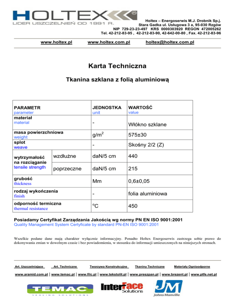 Holtex – Energoserwis M.J. Drobnik Sp.j. Stara Gadka ul. Usługowa 3 a, 95-030 Rzgów NIP 729-23-23-497 KRS 0000303920 REGON 472005262 Tel. 42-212-83-95 , 42-212-83-90, 42-642-00-80 , Fax. 42-212-83-96 www.holtex.pl www.holtex.com.pl [email protected] Karta Techniczna Tkanina szklana z folią aluminiową JEDNOSTKA unit WARTOŚĆ material - Włókno szklane masa powierzchniowa weight splot weave g/m2 575±30 - Skośny 2/2 (Z) wzdłużne daN/5 cm 440 poprzeczne daN/5 cm 215 grubość thickness Mm 0,6±0,05 rodzaj wykończenia finish - folia aluminiowa PARAMETR parameter value materiał wytrzymałość na rozciąganie tensile strength odporność termiczna thermal resistance o C 450 Posiadamy Certyfikat Zarządzania Jakością wg normy PN EN ISO 9001:2001 Quality Management System Certyficate by standard PN-EN ISO 9001:2001 Wszelkie podane dane mają charakter wyłącznie informacyjny. Ponadto Holtex Energoserwis zastrzega sobie prawo do dokonywania zmian w dowolnym czasie i bez powiadomienia, w stosunku do informacji umieszczonych na niniejszych stronach. Art. Uszczelniające Art. Techniczne Tworzywa Konstrukcyjne Tkaniny Techniczne Materiały Ognioodporne www.aramid.com.pl | www.temac.pl | www.filc.pl | www.tekstolit.pl | www.preszpan.pl | www.brezent.pl | www.ptfe.net.pl