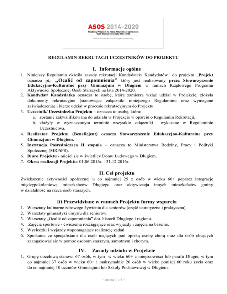 REGULAMIN REKRUTACJI UCZESTNIKÓW DO PROJEKTU I. Informacje ogólne 1. Niniejszy Regulamin określa zasady rekrutacji Kandydatek/ Kandydatów do projektu „Projekt oznacza pt.: „,Ocalić od zapomnienia” który jest realizowany przez Stowarzyszenie Edukacyjno-Kulturalne przy Gimnazjum w Długiem w ramach Rządowego Programu Aktywności Społecznej Osób Starszych na lata 2014-2020. 2. Kandydat/ Kandydatka oznacza to osobę, która zamierza wziąć udział w Projekcie, złożyła dokumenty rekrutacyjne (stanowiące załączniki niniejszego Regulaminu oraz wymagane zaświadczenia) i bierze udział w procesie rekrutacyjnym do Projektu. 3. Uczestnik/ Uczestniczka Projektu – oznacza to osobę, która: a. zostanie zakwalifikowana do udziału w Projekcie w oparciu o Regulamin Rekrutacji, b. złożyły w wyznaczonym terminie wszystkie załączniki wykazane w Regulaminie Uczestnictwa. 4. Realizator Projektu (Beneficjent) oznacza Stowarzyszenie Edukacyjno-Kulturalne przy Gimnazjum w Długiem. 5. Instytucja Pośrednicząca II stopnia – oznacza to Ministerstwa Rodziny, Pracy i Polityki Społecznej (MRPiPS). 6. Biuro Projektu - mieści się w świetlicy Domu Ludowego w Długiem. 7. Okres realizacji Projektu: 01.06.2016r. - 31.12.2016r. II. Cel projektu Zwiększenie aktywności społecznej u co najmniej 25 z osób w wieku 60+ poprzez integrację międzypokoleniową mieszkańców Długiego oraz aktywizacja innych mieszkańców gminy w działalność na rzecz osób starszych. 1. 2. 3. 4. 5. 6. III.Przewidziane w ramach Projektu formy wsparcia Warsztaty kulinarne zdrowego żywienia dla seniorów (część teoretyczna i praktyczna). Warsztaty gimnastyki umysłu dla seniorów. Warsztaty „Ocalić od zapomnienia” dot. historii Długiego i regionu. Zajęcia sportowe - ćwiczenia rozciągające oraz wyjazdy i zajęcia na basenie. Wycieczki i wyjazdy wspomagające realizację zadań. Spotkania ze specjalistami dla osób mających pod opieką osobę chorą oraz dla osób chcących zaangażować się w pomoc osobom starszym, samotnym i chorym. IV. Zasady udziału w Projekcie 1. Grupę docelową stanowi 67 osób, w tym w wieku 60+ z miejscowości lub parafii Długie, w tym co najmniej 37 osób w wieku 60+ i maksymalnie 20 osób w wieku poniżej 60 roku życia oraz do co najmniej 10 uczniów Gimnazjum lub Szkoły Podstawowej w Długiem. > strona 1 z 4 < 2. Kryteria rekrutacji dotyczące poszczególnych grup wymienionych w punkcie 1 będą weryfikowane na podstawie danych z Formularza Rekrutacyjnego. 3. Osoby, które spełnią kryteria formalne przejdą do drugiego etapu rekrutacji, który zostanie przeprowadzony w przypadku dużej liczby zgłoszeń do 10.07.2016r. V. Proces rekrutacji 4. Rekrutację i weryfikację kwalifikowalności Kandydatów/ek do Projektu prowadzi Komisja Rekrutacyjna w składzie koordynator projektu lub asystent koordynatora oraz Przedstawiciel Stowarzyszenia. 5. Rekrutacja Kandydatów/tek do Projektu będzie się odbywała w dwóch etapach: Etap I: przyjmowanie i weryfikacja zgłoszeń Kandydatów/tek na podstawie Formularza Rekrutacyjnego do 07.07. 2016r. Etap II: ocena punktowa ocena Kandydatów/tek do 12.07. 2016r. i wyłonienie uczestników projektu oraz utworzenie listy podstawowej i rezerwowej. 6. Rekrutacja uczniów Szkoły Podstawowej lub Gimnazjum w Długiem będzie odbywała się na podstawie opinii nauczyciela historii w terminie od 01.09.2016r. do 10.09.2016r. VI. Opis I etapu rekrutacji 1. Warunkiem uczestnictwa w Projekcie i zakwalifikowania w pierwszym etapie rekrutacji jest złożenie przez Kandydata/kę: wypełnionego formularza rekrutacyjnego. 2. Formularz rekrutacyjny oraz oświadczenia muszą być opatrzone własnoręcznym, czytelnym podpisem Kandydata/ki wraz z datą ich wypełnienia. 3. Dokumenty rekrutacyjne dostępne będą na stronie internetowej: www.klubseniora-dlugie.pl, w siedzibie Klubu Seniora - świetlica w Domu Ludowym w Długiem ( czwartki od godz. 19:00 do 21:00) lub w sklepach Pana Janusza Folty na terenie Długiego. 4. Po zakończeniu naboru dokumentów rekrutacyjnych Komisja Rekrutacyjna dokona weryfikacji dokumentów zgłoszeniowych pod kątem spełnienia kryteriów formalnych. 5. Zostaną odrzucone dokumenty zgłoszeniowe niekompletne lub zawierające uchybienia formalne takie jak: a. brak spełnienia kryteriów formalnych, b. brak podpisów Kandydata/ki na wymaganych dokumentach, c. brak wymaganych danych. 1. Osoby, które spełnią wymagania formalne zostaną poinformowane osobiście lub telefonicznie przez Koordynatora. VII. Opis II etapu rekrutacji 1. II etap rekrutacji zostanie przeprowadzony tylko w przypadku, gdy liczba kandydatów spełniających wymogi formalne przekroczy planowaną ilość uczestników. 2. Na podstawie złożonych dokumentów zostaną przyznane punkty: a. przynależność do Klubu Seniora w Długiem – 30 punktów, b. aktywny udział w przedsięwzięciach na rzecz mieszkańców wsi lub przynależność lub aktywny udział w organizacjach działającej na rzecz mieszkańców Długiego – 5-10 punktów c. stopień niepełnosprawności – 5 punktów, d. zadeklarowanie chęci pozostania wolontariuszem w świadczeniu pomocy w opiece nad osobą niepełnosprawną, przewlekle chorą w wieku 60+ lub samotną w wieku 70+ – 10 punktów, e. brak aktywności zawodowej – 5 punktów, f. osoba korzystająca z pomocy GOPS w Zarszynie – 5 punktów > strona 2 z 4 < 3. Na podstawie sumy punktów przyznanych przez Komisję utworzona zostanie lista podstawowa z zachowaniem odpowiedniej proporcji osób w wieku 60+ (co najmniej 65%) i niepełnosprawnych (co najmniej 18%) i lista rezerwowa wg. malejącej liczby punktów, w przypadku równej liczny punktów – kryterium rozstrzygającym będzie kolejność zgłoszeń. 4. Osoby z listy rezerwowej będą kwalifikowane w przypadku rezygnacji osób z listy podstawowej. 5. Osoby zakwalifikowane do udziału w Projekcie (lista podstawowa) zobowiązane będą do podpisania deklaracji i pr