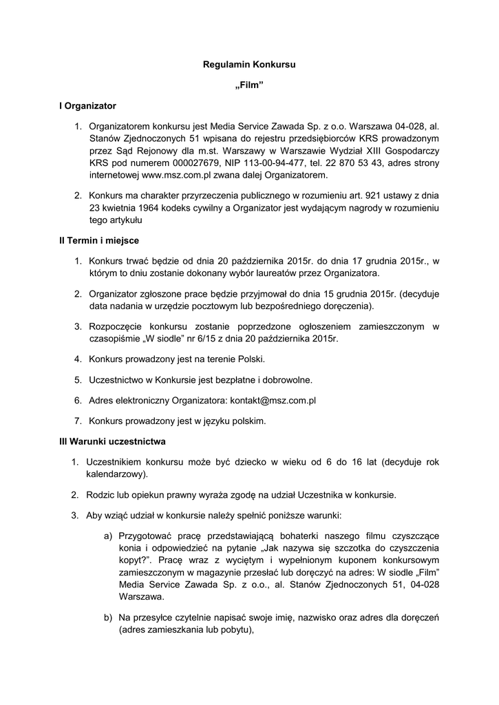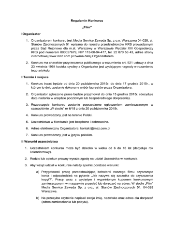 Regulamin Konkursu „Film” I Organizator 1. Organizatorem konkursu jest Media Service Zawada Sp. z o.o. Warszawa 04-028, al. Stanów Zjednoczonych 51 wpisana do rejestru przedsiębiorców KRS prowadzonym przez Sąd Rejonowy dla m.st. Warszawy w Warszawie Wydział XIII Gospodarczy KRS pod numerem 000027679, NIP 113-00-94-477, tel. 22 870 53 43, adres strony internetowej www.msz.com.pl zwana dalej Organizatorem. 2. Konkurs ma charakter przyrzeczenia publicznego w rozumieniu art. 921 ustawy z dnia 23 kwietnia 1964 kodeks cywilny a Organizator jest wydającym nagrody w rozumieniu tego artykułu II Termin i miejsce 1. Konkurs trwać będzie od dnia 20 października 2015r. do dnia 17 grudnia 2015r., w którym to dniu zostanie dokonany wybór laureatów przez Organizatora. 2. Organizator zgłoszone prace będzie przyjmował do dnia 15 grudnia 2015r. (decyduje data nadania w urzędzie pocztowym lub bezpośredniego doręczenia). 3. Rozpoczęcie konkursu zostanie poprzedzone ogłoszeniem zamieszczonym w czasopiśmie „W siodle” nr 6/15 z dnia 20 października 2015r. 4. Konkurs prowadzony jest na terenie Polski. 5. Uczestnictwo w Konkursie jest bezpłatne i dobrowolne. 6. Adres elektroniczny Organizatora: [email protected] 7. Konkurs prowadzony jest w języku polskim. III Warunki uczestnictwa 1. Uczestnikiem konkursu może być dziecko w wieku od 6 do 16 lat (decyduje rok kalendarzowy). 2. Rodzic lub opiekun prawny wyraża zgodę na udział Uczestnika w konkursie. 3. Aby wziąć udział w konkursie należy spełnić poniższe warunki: a) Przygotować pracę przedstawiającą bohaterki naszego filmu czyszczące konia i odpowiedzieć na pytanie „Jak nazywa się szczotka do czyszczenia kopyt?”. Pracę wraz z wyciętym i wypełnionym kuponem konkursowym zamieszczonym w magazynie przesłać lub doręczyć na adres: W siodle „Film” Media Service Zawada Sp. z o.o., al. Stanów Zjednoczonych 51, 04-028 Warszawa. b) Na przesyłce czytelnie napisać swoje imię, nazwisko oraz adres dla doręczeń (adres zamieszkania lub pobytu), c) Kupon konkursowy powinien być wypełniony przez rodzica lub opiekuna prawnego. d) Każdy Uczestnik może wysłać dowolną ilość prac. e) Regulamin w PDF jest dostępny na stronie www.msz.com.pl (wejście przez zakładkę „Konkursy”) oraz jest udostępniony w siedzibie Organizatora. Uczestnik przed wzięciem udziału w Konkursie powinien zapoznać się z jego treścią. Regulamin może być pobrany w wersji PDF. Uczestnik przed przystąpieniem do konkursu powinien zapoznać się z niniejszym regulaminem. Wysłanie kuponu konkursowego oznacza, iż Uczestnik Konkursu (rodzic/opiekun prawny) zapoznał się z Regulaminem i polityką prywatności. f) Biorąc udział w Konkursie, Uczestnik nie będzie dostarczać treści bezprawnych, w szczególności używać obraźliwych oznaczeń UWAGA: Z uwagi na fakt, iż Uczestnikiem Konkursu może być osoba małoletnia, poniżej 18 lat, z Regulaminem Konkursu oraz Polityką prywatności powinien zapoznać się rodzic albo opiekun prawny. Określone czynności powinny być podejmowane przez rodzica (opiekuna prawnego) albo być przez niego potwierdzone. 4. Uczestnikowi nie przysługuje zwrot kosztów wykonania i przesłania prac. 5. Organizator ma prawo zatrzymania oryginału prac zgłoszonych do konkursu i ich publikacji. IV Wyłonienie laureata 1. 2. 3. Organizator w terminie do 17 grudnia wyłoni 25 laureatów. Spośród Uczestników Konkursu, którzy dokonali Zgłoszenia do Konkursu. Nagroda przyznana zostanie temu Uczestnikowi, którego odpowiedź na zadanie Konkursowe zostanie uznana za najciekawszą, i która najpełniej spełniła kryteria Konkursu opisane poniżej. Laureatów Konkursu wybierze Komisja Konkursowa, składająca się z 3-5 osób, która przy wyborze Laureata będzie kierowała się następującymi kryteriami: • zgodność merytoryczna, • oryginalność, pomysłowość, • kreatywność, • poprawność językowa. Przy wyborze Laureata nie ma znaczenia kolejność zgłoszeń. 4. Organizator sporządzi listę laureatów zawierającą imiona, nazwiska i adresy dla doręczeń laureatów, rodzaj przyznanej nagrody, datę i podpis osoby sporządzającej listę. 5. Informacja o otrzymaniu nagrody głównej lub nagród dodatkowych zostanie przesłana na adres e-mail Uczestnika lub rodzica/opiekuna prawnego podany w kuponie konkursowym oraz zostanie opublikowana wraz z imieniem, nazwiskiem, miejscowością zamieszkania w czasopiśmie „W siodle” nr 2/16 z dnia 26.02.2015r. lub na stronie internetowej. V Nagrody 1. Laureaci konkursu otrzymają nagrody w postaci: a) 1 Weekendowy pobyt dla 3 osób (laureat + rodzice) w Stadninie Koni Ciekocinko, ufundowany przez firmę Horizontal z o.o. o wartości jednostkowej 3517,8 zł brutto. i b) 5 piżam Ever After High ufundowanych przez firmę E plus M Sp. z o.o. o wartości jednostkowej 25 zł brutto c) 3 plecaki Ever After High, ufundowane przez firmę St. Majewski o wartości jednostkowej 112 zł brutto d) 4 lalki Ever After High ufundowane przez firmę Mattel Poland Sp. z o.o. o wartości jednostkowej 103 zł brutto e) 5 pościeli Ever After High ufundowane przez firmę PHU Carbotex o wartości jednostkowej 79 zł f) 4 zestawy książek „Bzik i Makówka” ufundowane przez Wydawnictwo Nasza Księgarnia Sp. z o.o. o wartości jednostkowej 63 zł g) 1 płyta Margaret, ufundowana przez firmę Media Service Zawada Sp. z o.o. o wartości jednostkowej 40 zł brutto h) 1 zestaw książek serii AKADEMIA CANTERWOOD autorstwa Jessiki Burkhart, ufundowany przez Wydawnictwo Dolnośląskie - Publicat S.A o wartości jednostkowej 148 zł brutto i) 2. 1 zestaw książek serii JINNY Z FINMORY autorstwa Patricii Leitch ufundowany przez Wydawnictwo Dolnośląskie - Publicat S.A o wartości jednostkowej 211 zł brutto Nagroda nie może zostać zamieniona na ekwiwalent pieniężny lub inną nagrodę rzeczową. 3. Jeden Uczestnik może otrzymać tylko jedną nagrodę. 4. Laureat 