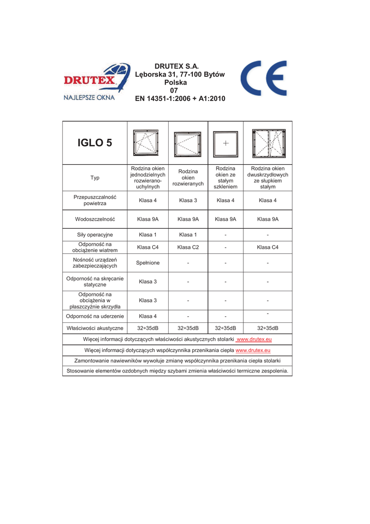 DRUTEX S.A. LĊborska 31, 77-100 Bytów Polska 07 EN 14351-1:2006 + A1:2010 IGLO 5 Typ Rodzina okien jednodzielnych rozwieranouchylnych Rodzina okien rozwieranych Rodzina okien ze stałym szkleniem Rodzina okien dwuskrzydłowych ze słupkiem stałym PrzepuszczalnoĞü powietrza Klasa 4 Klasa 3 Klasa 4 Klasa 4 WodoszczelnoĞü Klasa 9A Klasa 9A Klasa 9A Klasa 9A Siły operacyjne Klasa 1 Klasa 1 - - OdpornoĞü na obciąĪenie wiatrem Klasa C4 Klasa C2 - Klasa C4 NoĞnoĞü urządzeĔ zabezpieczających Spełnione - - - OdpornoĞü na skrĊcanie statyczne Klasa 3 - - - OdpornoĞü na obciąĪenia w płaszczyĨnie skrzydła Klasa 3 - - - OdpornoĞü na uderzenie Klasa 4 - - WłaĞciwoĞci akustyczne 32÷35dB 32÷35dB 32÷35dB 32÷35dB WiĊcej informacji dotyczących właĞciwoĞci akustycznych stolarki www.drutex.eu WiĊcej informacji dotyczących współczynnika przenikania ciepła www.drutex.eu Zamontowanie nawiewników wywołuje zmianĊ współczynnika przenikania ciepła stolarki Stosowanie elementów ozdobnych miĊdzy szybami zmienia właĞciwoĞci termiczne zespolenia. DRUTEX S.A. LĊborska 31, 77-100 Bytów Polska 07 EN 14351-1:2006 + A1:2010 IGLO 5 Typ Rodzina drzwi balkonowych dwudzielnych ze słupkiem ruchomym Rodzina okien jednorzĊdowych trójskrzydłowych ze słupkiem stałym i ruchomym Rodzina okien dwurzĊdowych ze słupkiem ruchomym PrzepuszczalnoĞü powietrza Klasa 4 Klasa 4 Klasa 4 WodoszczelnoĞü Klasa 9A Klasa 8A Klasa 7A Siły operacyjne Klasa 1 Klasa 1 Klasa 1 OdpornoĞü na obciąĪenie wiatrem Klasa C1 Klasa C2 Klasa C1 NoĞnoĞü urządzeĔ zabezpieczających Spełnione Spełnione Spełnione WłaĞciwoĞci akustyczne 32÷35dB 32÷35dB 32÷35dB WiĊcej informacji dotyczących właĞciwoĞci akustycznych stolarki www.drutex.eu WiĊcej informacji dotyczących współczynnika przenikania ciepła www.drutex.eu Zamontowanie nawiewników wywołuje zmianĊ współczynnika przenikania ciepła całej stolarki Stosowanie elementów ozdobnych miĊdzy szybami zmienia właĞciwoĞci termiczne zespolenia. DRUTEX S.A. Lęborska 31, 77-100 Bytów Polska 07 EN 14351-1:2006 + A1:2010 IGLO 5 Drzwi zewnętrzne wejściowe Typ Rodzina drzwi jednoskrzydłowych Rodzina drzwi dwuskrzydłowych Przepuszczalność powietrza Klasa 2 Klasa 2 Wodoszczelność Klasa 5A Klasa 4A Odporność na obciążenie wiatrem Klasa C5 Klasa C1 Odporność na uderzenia Klasa 2 Klasa 3 Dynamiczna siła zamykająca Klasa 4 Klasa 4 Siła potrzebna do przekręcania klucza w zamku Klasa 4 Klasa 4 Siła (lub moment obrotowy) potrzebna do otwarcia drzwi przy użyciu klamki Klasa 3 Klasa 3 Siła potrzeba do rozpoczęcia i utrzymania poruszenia skrzydła Klasa 4 Właściwości akustyczne 32÷35dB Klasa 4 32÷35dB Więcej informacji dotyczących właściwości akustycznych stolarki www.drutex.eu Więcej informacji dotyczących współczynnika przenikania ciepła www.drutex.eu Zamontowanie nawiewników wywołuje zmianę współczynnika przenikania ciepła stolarki Stosowanie elementów ozdobnych między szybami zmienia właściwości termiczne zespolenia. DRUTEX S.A. Lęborska 31, 77-100 Bytów Polska 07 EN 14351-1:2006 + A1:2010 IGLO 5 Okna i drzwi balkonowe łukowe Przepuszczalność powietrza Klasa 4 Wodoszczelność Klasa 9A Odporność na obciążenie wiatrem B2(800Pa) / C1(400Pa) Siły operacyjne Klasa 1 Właściwości akustyczne 32÷35dB Więcej informacji dotyczących właściwości akustycznych stolarki www.drutex.eu Więcej informacji dotyczących współczynnika przenikania ciepła www.drutex.eu Zamontowanie nawiewników wywołuje zmianę współczynnika przenikania ciepła stolarki Stosowanie elementów ozdobnych między szybami zmienia właściwości termiczne zespolenia.