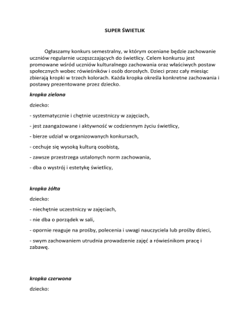 SUPER ŚWIETLIK Ogłaszamy konkurs semestralny, w którym oceniane będzie zachowanie uczniów regularnie uczęszczających do świetlicy. Celem konkursu jest promowane wśród uczniów kulturalnego zachowania oraz właściwych postaw społecznych wobec rówieśników i osób dorosłych. Dzieci przez cały miesiąc zbierają kropki w trzech kolorach. Każda kropka określa konkretne zachowania i postawy prezentowane przez dziecko. kropka zielona dziecko: - systematycznie i chętnie uczestniczy w zajęciach, - jest zaangażowane i aktywność w codziennym życiu świetlicy, - bierze udział w organizowanych konkursach, - cechuje się wysoką kulturą osobistą, - zawsze przestrzega ustalonych norm zachowania, - dba o wystrój i estetykę świetlicy, kropka żółta dziecko: - niechętnie uczestniczy w zajęciach, - nie dba o porządek w sali, - opornie reaguje na prośby, polecenia i uwagi nauczyciela lub prośby dzieci, - swym zachowaniem utrudnia prowadzenie zajęć a rówieśnikom pracę i zabawę. kropka czerwona dziecko: - odmawia uczestnictwa w zajęciach, - nie przestrzega zasad panujących w świetlicy, - przeszkadza w prowadzeniu zajęć, - jest niekulturalne i agresywne, - nie reaguje na uwagi i upomnienia nauczyciela oraz prośby dzieci, -swoim zachowaniem zagraża bezpieczeństwu własnemu i innych, - nie dba o porządek swojego otoczenia, - uczestniczy w konfliktach, - niszczy własność innych dzieci lub wyposażenie świetlicy, Uczniowie zbierają kropki przez miesiąc. Na koniec miesiąca dzieci, które zdobędą cztery zielone kropki, otrzymają dyplom Super Świetlik Miesiąca i drobną słodką nagrodę. Uczniowie, którzy zdobędą maksymalną ilość miesięcznych dyplomów w semestrze, wyróżnieni zostaną dyplomem SuperŚwietlik i otrzymają nagrodę rzeczową. Uczniom, którzy zbiorą najwięcej czerwonych kropek w miesiącu, zostanie wpisana uwaga do dziennika, w rubryce zachowanie. Wszystkim życzymy powodzenia!!!