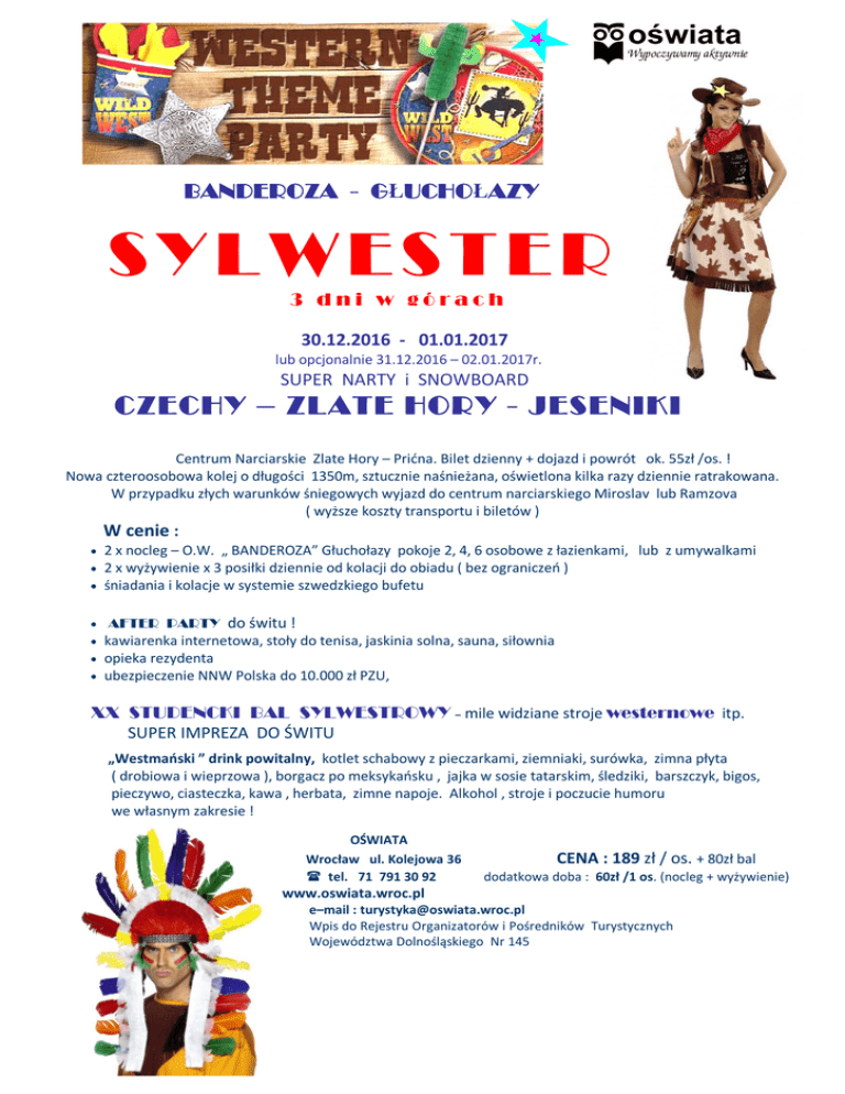 BANDEROZA - GŁUCHOŁAZY SYLWESTER 3 dni w górach 30.12.2016 - 01.01.2017 lub opcjonalnie 31.12.2016 – 02.01.2017r. SUPER NARTY i SNOWBOARD CZECHY – ZLATE HORY - JESENIKI Centrum Narciarskie Zlate Hory – Prićna. Bilet dzienny + dojazd i powrót ok. 55zł /os. ! Nowa czteroosobowa kolej o długości 1350m, sztucznie naśnieżana, oświetlona kilka razy dziennie ratrakowana. W przypadku złych warunków śniegowych wyjazd do centrum narciarskiego Miroslav lub Ramzova ( wyższe koszty transportu i biletów ) W cenie : 2 x nocleg – O.W. „ BANDEROZA” Głuchołazy pokoje 2, 4, 6 osobowe z łazienkami, lub z umywalkami 2 x wyżywienie x 3 posiłki dziennie od kolacji do obiadu ( bez ograniczeń ) śniadania i kolacje w systemie szwedzkiego bufetu AFTER PARTY do świtu ! kawiarenka internetowa, stoły do tenisa, jaskinia solna, sauna, siłownia opieka rezydenta ubezpieczenie NNW Polska do 10.000 zł PZU, XX STUDENCKI BAL SYLWESTROWY – mile widziane stroje westernowe itp. SUPER IMPREZA DO ŚWITU „Westmański ” drink powitalny, kotlet schabowy z pieczarkami, ziemniaki, surówka, zimna płyta ( drobiowa i wieprzowa ), borgacz po meksykańsku , jajka w sosie tatarskim, śledziki, barszczyk, bigos, pieczywo, ciasteczka, kawa , herbata, zimne napoje. Alkohol , stroje i poczucie humoru we własnym zakresie ! OŚWIATA Wrocław ul. Kolejowa 36 tel. 71 791 30 92 CENA : 189 zł / os. + 80zł bal dodatkowa doba : 60zł /1 os. (nocleg + wyżywienie) www.oswiata.wroc.pl e–mail : [email protected] Wpis do Rejestru Organizatorów i Pośredników Turystycznych Województwa Dolnośląskiego Nr 145 Dodatkowe informacje : Ośrodek „ Banderoza” w Głuchołazach - 4 km od granicy z Czechami ( ok. 110 km od Wrocławia ), Wyżywienie : 2 x wyżywienie x 3 posiłki dziennie bez ograniczeń (śniadania w systemie szwedzkiego bufetu) od ciepłej kolacji przy sylwestrze do obiadu ostatniego dnia pobytu. Istnieje możliwość wcześniejszego przyjazdu lub przedłużenia pobytu do 02.01.2017r. – dodatkowa opłata za dzień 60zł / 1 os. (nocleg + wyżywienie) Dla chętnych możliwość wykupienia przewozu autokarem na trasie : Wyjazd z Wrocławia do Głuchołaz 30.12.2016 godz.13.00 Wyjazd z ośrodka „Banderoza” w Głuchołazach do Wrocławia 01.01.2017r. o godz. 15.00 planowany przyjazd do Wrocławia ok. godz. 17.00 Koszt przejazdu w dwie strony 70zł. Minimalna ilość osób – 30os. Impreza sylwestrowa : realizowana na sali balowej Ośrodka przy muzyce mechanicznej Uwaga : uczestników obowiązuje regulamin Ośrodka, za stan pokoju odpowiada osoba pobierająca skierowanie. Zakwaterowanie na podstawie skierowania i dowodu osobistego. Ubezpieczenie narciarskie i do Czech we własnym zakresie. Istnieje możliwość płacenia w ratach Opłata rezerwacyjna – zadatek 150 zł / os. Rezerwacja miejsc : telefonicznie, e - mailem lub osobiście, Płatność na konto z dopiskiem : BZ WBK S.A. I O/ Wrocław 59 1090 2398 0000 0006 0800 0825 z dopiskiem : imię, nazwisko + Głuchołazy Biuro czynne : od poniedziałku do piątku w godz. 09.00 – 17.00 Życzymy Szampańskiej Zabawy !