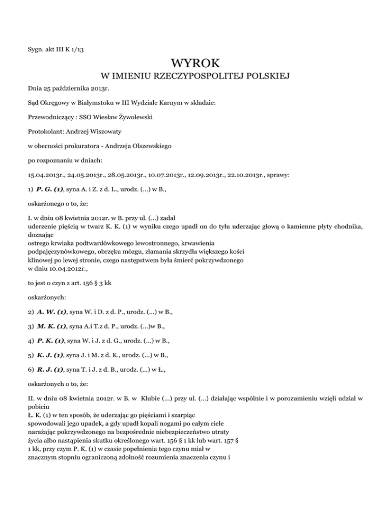 Sygn. akt III K 1/13 WYROK W IMIENIU RZECZYPOSPOLITEJ POLSKIEJ Dnia 25 października 2013r. Sąd Okręgowy w Białymstoku w III Wydziale Karnym w składzie: Przewodniczący : SSO Wiesław Żywolewski Protokolant: Andrzej Wiszowaty w obecności prokuratora - Andrzeja Olszewskiego po rozpoznaniu w dniach: 15.04.2013r., 24.05.2013r., 28.05.2013r., 10.07.2013r., 12.09.2013r., 22.10.2013r., sprawy: 1) P. G. (1), syna A. i Z. z d. L., urodz. (...) w B., oskarżonego o to, że: I. w dniu 08 kwietnia 2012r. w B. przy ul. (...) zadał uderzenie pięścią w twarz K. K. (1) w wyniku czego upadł on do tyłu uderzając głową o kamienne płyty chodnika, doznając ostrego krwiaka podtwardówkowego lewostronnego, krwawienia podpajęczynówkowego, obrzęku mózgu, złamania skrzydła większego kości klinowej po lewej stronie, czego następstwem była śmierć pokrzywdzonego w dniu 10.04.2012r., to jest o czyn z art. 156 § 3 kk oskarżonych: 2) A. W. (1), syna W. i D. z d. P., urodz. (...) w B., 3) M. K. (1), syna A.i T.z d. P., urodz. (...)w B., 4) P. K. (1), syna W. i J. z d. G., urodz. (...) w B., 5) K. J. (1), syna J. i M. z d. K., urodz. (...) w B., 6) R. J. (1), syna T. i J. z d. B., urodz. (...) w Ł., oskarżonych o to, że: II. w dniu 08 kwietnia 2012r. w B. w Klubie (...) przy ul. (...) działając wspólnie i w porozumieniu wzięli udział w pobiciu Ł. K. (1) w ten sposób, że uderzając go pięściami i szarpiąc spowodowali jego upadek, a gdy upadł kopali nogami po całym ciele narażając pokrzywdzonego na bezpośrednie niebezpieczeństwo utraty życia albo nastąpienia skutku określonego wart. 156 § 1 kk lub wart. 157 § 1 kk, przy czym P. K. (1) w czasie popełnienia tego czynu miał w znacznym stopniu ograniczoną zdolność rozumienia znaczenia czynu i zdolność kierowania swoim postępowaniem, to jest o czyn z art. 158 § l kk wobec A. W. (1), M. K. (1), K. J. (1) i R. J. (1), zaś o czyn z art. 158 § l kk w zw. z art. 31 § 2 kk wobec P. K. (1). a nadto: A. W. (1) oskarżonego o to, że: III. w dniu 08 kwietnia 2012r. w B. w okolicy Klubu (...) przy ul. (...), nie udzielił pomocy nieprzytomnemu K. K. (1) znajdującemu się w położeniu grożącym bezpośrednim niebezpieczeństwem utraty życia, mogąc jej udzielić bez narażania siebie lub innej osoby na niebezpieczeństwo utraty życia albo ciężkiego uszczerbku na zdrowiu, to jest o czyn z art. 162 § l kk M. K. (1) oskarżonego o to, że: IV. w dniu 08 kwietnia 2012r. w B. w okolicy Klubu (...) przy ul. (...), nie udzielił pomocy nieprzytomnemu K. K. (1) znajdującemu się w położeniu grożącym bezpośrednim niebezpieczeństwem utraty życia, mogąc jej udzielić bez narażania siebie lub innej osoby na niebezpieczeństwo utraty życia albo ciężkiego uszczerbku na zdrowiu, to jest o czyn z art. 162 § l kk. P. K. (1) oskarżonego o to, że: V. w dniu 08 kwietnia 2012r. w B. w okolicy Klubu (...) przy ul. (...), nie udzielił pomocy nieprzytomnemu K. K. (1) znajdującemu się w położeniu grożącym bezpośrednim niebezpieczeństwem utraty życia, mogąc jej udzielić bez narażania siebie lub innej osoby na niebezpieczeństwo utraty życia albo ciężkiego uszczerbku na zdrowiu, przy czym w czasie popełnienia tego czynu miał w znacznym stopniu ograniczoną zdolność rozumienia znaczenia czynu i zdolność kierowania swoim postępowaniem, to jest o czyn z art. 162 § l kk w zw. z art. 31 § 2 kk K. J. (1) oskarżonego o to, że: VI. w dniu 08 kwietnia 2012r. w B. w okolicy Klubu (...) przy ul. (...), nie udzielił pomocy nieprzytomnemu K. K. (1) znajdującemu się w położeniu grożącym bezpośrednim niebezpieczeństwem utraty życia, mogąc jej udzielić bez narażania siebie lub innej osoby na niebezpieczeństwo utraty życia albo ciężkiego uszczerbku na zdrowiu, to jest o czyn z art. 162 § 1 kk. R. J. (1) oskarżonego o to, że: VII. w dniu 08 kwietnia 2012r. w B. w okolicy Klubu (...) przy ul. (...), nie udzielił pomocy nieprzytomnemu K. K. (1) znajdującemu się w położeniu grożącym bezpośrednim niebezpieczeństwem utraty życia, mogąc jej udzielić bez narażania siebie lub innej osoby na niebezpieczeństwo utraty życia albo ciężkiego uszczerbku na zdrowiu, to jest o czyn z art. 162 § 1 kk 7) P. O., syna W. i H. z d. Ś., urodz. (...) w B., oskarżonego o to, że: VIII. w dniu 08 kwietnia 2012r. w B. w okolicy Klubu (...) przy ul. (...), nie udzielił pomocy nieprzytomnemu K. K. (1) znajdującemu się w położeniu grożącym bezpośrednim niebezpieczeństwem utraty życia, mogąc jej udzielić bez narażania siebie lub innej osoby na niebezpieczeństwo utraty życia albo ciężkiego uszczerbku na zdrowiu, to jest o czyn z art. 162 § 1 kk 8) Z. P., syna K. i L. z d. Ł., urodz. (...) w B., oskarżonego o to, że: IX. w dniu 08 kwietnia 2012r. w B. w okolicy Klubu (...) przy ul. (...), nie udzielił pomocy nieprzytomnemu K. K. (1) znajdującemu się w położeniu grożącym bezpośrednim niebezpieczeństwem utraty życia, mogąc jej udzielić bez narażania siebie lub innej osoby na niebezpieczeństwo utraty życia albo ciężkiego uszczerbku na zdrowiu, to jest o czyn z art. 162 § l kk. 1. Oskarżonego P. G. (1) uznaje za winnego tego, że w dniu 08 kwietnia 2012r. w B. przy ul. (...) w rejonie wejścia do klubu (...), nieumyślnie spowodował śmierć K. K. (1) w ten sposób, że działając umyślnie w zamiarze bezpośrednim uderzył prawą ręką w lewą część głowy K. K. (1), powodując przez to obrażenia w postaci stłuczenia wargi górnej po stronie lewej współistniejącego z raną błony śluzowej przedsionka jamy ustnej na wysokości II zęba lewego szczęki, które to obrażenia spowodowały naruszenie czynności narządu ciała trwające nie dłużej niż 7 dni, a w wyniku tego uderzenia K. K. (1) upadł do tyłu i uderzył głową o kamienne płyty chodnika, wskutek czego doznał obrażeń głowy w postaci otarcia naskórka w okolicy ciemieniowej pośrodkowo, potyl