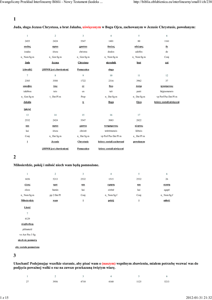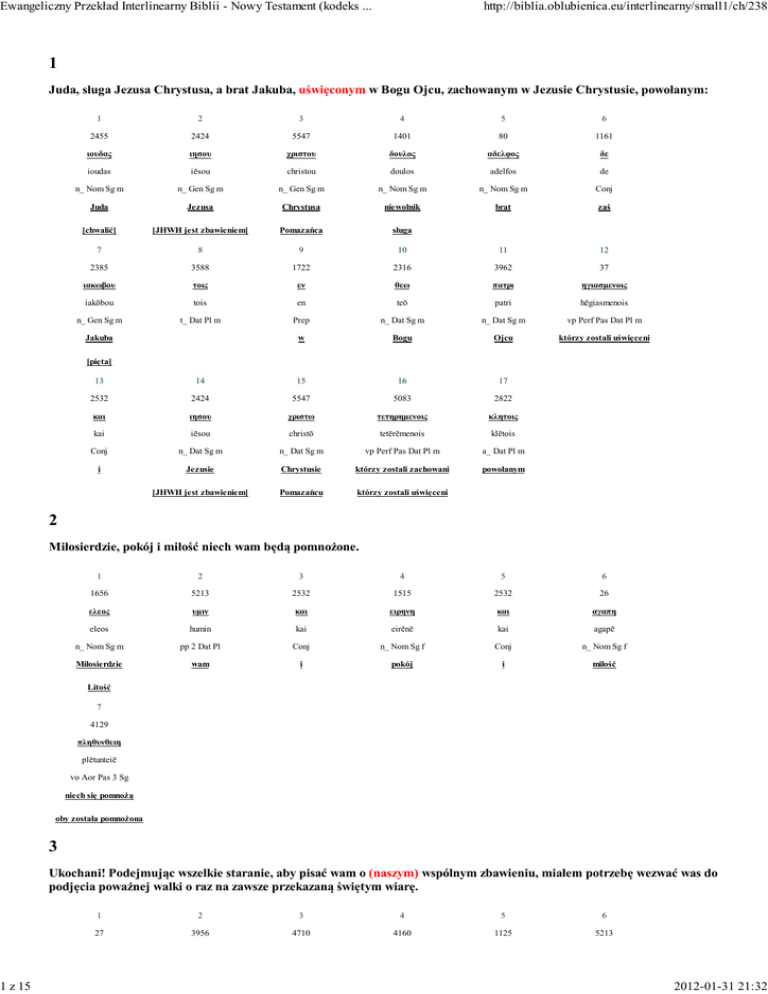 Ewangeliczny Przekład Interlinearny Biblii - Nowy Testament (kodeks ... 1 z 15 http://biblia.oblubienica.eu/interlinearny/small1/ch/238 1 Juda, sługa Jezusa Chrystusa, a brat Jakuba, uświęconym w Bogu Ojcu, zachowanym w Jezusie Chrystusie, powołanym: 1 2 3 4 5 6 2455 2424 5547 1401 80 1161 ιουδας ιησου χριστου δουλος αδελφος δε ioudas iēsou christou doulos adelfos de n_ Nom Sg m n_ Gen Sg m n_ Gen Sg m n_ Nom Sg m n_ Nom Sg m Conj Juda Jezusa Chrystusa niewolnik brat zaś [chwalić] [JHWH jest zbawieniem] Pomazańca sługa 7 8 9 10 11 12 2385 3588 1722 2316 3962 37 ιακωβου τοις εν θεω πατρι ηγιασµενοις iakōbou tois en teō patri hēgiasmenois n_ Gen Sg m t_ Dat Pl m Prep n_ Dat Sg m n_ Dat Sg m vp Perf Pas Dat Pl m w Bogu Ojcu którzy zostali uświęceni 15 16 17 Jakuba [pięta] 13 14 2532 2424 5547 5083 2822 και ιησου χριστω τετηρηµενοις κλητοις kai iēsou christō tetērēmenois klētois Conj n_ Dat Sg m n_ Dat Sg m vp Perf Pas Dat Pl m a_ Dat Pl m i Jezusie Chrystusie którzy zostali zachowani powołanym [JHWH jest zbawieniem] Pomazańcu którzy zostali uświęceni 2 Miłosierdzie, pokój i miłość niech wam będą pomnożone. 1 2 3 4 5 6 1656 5213 2532 1515 2532 26 ελεος υµιν και ειρηνη και αγαπη eleos humin kai eirēnē kai agapē n_ Nom Sg m pp 2 Dat Pl Conj n_ Nom Sg f Conj n_ Nom Sg f Miłosierdzie wam i pokój i miłość Litość 7 4129 πληθυνθειη plētunteiē vo Aor Pas 3 Sg niech się pomnożą oby została pomnożona 3 Ukochani! Podejmując wszelkie staranie, aby pisać wam o (naszym) wspólnym zbawieniu, miałem potrzebę wezwać was do podjęcia poważnej walki o raz na zawsze przekazaną świętym wiarę. 1 2 3 4 5 6 27 3956 4710 4160 1125 5213 2012-01-31 21:32 Ewangeliczny Przekład Interlinearny Biblii - Nowy Testament (kodeks ... 2 z 15 http://biblia.oblubienica.eu/interlinearny/small1/ch/238 αγαπητοι πασαν σπουδην ποιουµενος γραφειν υµιν agapētoi pasan spoudēn poioumenos grafein humin a_ Voc Pl m a_ Acc Sg f n_ Acc Sg f vp Pres Mid Nom Sg m vn Pres Act pp 2 Dat Pl Umiłowani całą staranie czyniąć pisać wam 7 8 9 10 11 12 4012 3588 2839 4991 318 2192 περι της κοινης σωτηριας αναγκην εσχον gorliwość peri tēs koinēs sōtērias anagkēn eschon Prep t_ Gen Sg f a_ Gen Sg f n_ Gen Sg f n_ Acc Sg f vi 2Aor Act 1 Sg wspólnym zbawieniu konieczność powziąłem o 13 14 15 16 17 18 1125 5213 3870 1864 3588 530 γραψαι υµιν παρακαλων επαγωνιζεσθαι τη απαξ grapsai humin parakalōn epagōnizestai tē hapaks vn Aor Act pp 2 Dat Pl vp Pres Act Nom Sg m vn Pres midD/pasD t_ Dat Sg f Adv napisać wam zachęcając (by) walczyć o raz (by) bojować o 19 20 21 22 3860 3588 40 4102 παραδοθειση τοις αγιοις πιστει paradoteisē tois hagiois pistei vp Aor Pas Dat Sg f t_ Dat Pl m a_ Dat Pl m n_ Dat Sg f świętym wiarę która została przekazana 4 Wślizgnęli się bowiem pomiędzy was pewni ludzie, na których od dawna wypisany już został ten wyrok, bezbożni, którzy łaskę naszego Boga obracają w rozwiązłość i wypierają się naszego jedynego Władcy - Boga i Pana, Jezusa Chrystusa. 1 2 3 4 5 6 3921 1063 5100 444 3588 3819 παρεισεδυσαν γαρ τινες ανθρωποι οι παλαι pareisedusan gar tines antrōpoi hoi palai vi Aor Act 3 Pl Conj px Nom Pl m n_ Nom Pl m t_ Nom Pl m Adv Wślizgneli się bowiem pewni ludzie od dawna Wkradli się 7 8 9 10 11 12 4270 1519 5124 3588 2917 765 προγεγραµµενοι εις τουτο το κριµα ασεβεις progegrammenoi eis touto to krima asebeis vp Perf Pas Nom Pl m Prep pd Acc Sg n t_ Acc Sg n n_ Acc Sg n a_ Nom Pl m którzy zostali zawczasu zapisani na ten wyrok bezbożni sąd 13 14 15 16 17 18 3588 3588 2316 2257 5485 3346 την του θεου ηµων χαριν µετατιθεντες tēn tou teou hēmōn charin metatitentes t_ Acc Sg f t_ Gen Sg m n_ Gen Sg m pp 1 Gen Pl n_ Acc Sg f vp Pres Act Nom Pl m 2012-01-31 21:32 Ewangeliczny Przekład Interlinearny Biblii - Nowy Testament (kodeks ... 3 z 15 http://biblia.oblubienica.eu/interlinearny/small1/ch/238 Boga naszego łaskę zamieniający 19 20 21 22 23 24 1519 766 2532 3588 3441 1203 εις ασελγειαν και τον µονον δεσποτην eis aselgeian kai ton monon despotēn Prep n_ Acc Sg f Conj t_ Acc Sg m a_ Acc Sg m n_ Acc Sg m na rozwiązłość a jedynego Władcę 29 30 rozpustę 25 26 27 28 2316 2532 2962 2257 2424 5547 θεον και κυριον ηµων ιησουν χριστον teon kai kurion hēmōn iēsoun christon n_ Acc Sg m Conj n_ Acc Sg m pp 1 Gen Pl n_ Acc Sg m n_ Acc Sg m Boga i Pana nasza Jezusa Chrystusa [JHWH jest zbawieniem] Pomazańca 31 720 αρνουµενοι arnoumenoi vp Pres midD/pasD Nom Pl m odrzucający 5 Chcę wam zaś przypomnieć — wam, którzy wszystko raz poznaliście — że Pan najpierw wybawił lud z ziemi egipskiej, potem [jednak] wygubił tych, którzy nie uwierzyli; 1 2 3 4 5 6 5279 1161 5209 1014 1492 5209 υποµνησαι δε υµας βουλοµαι ειδοτας υµας hupomnēsai de humas boulomai eidotas humas vn Aor Act Conj pp 2 Acc Pl vi Pres midD/pasD 1 Sg vp Perf Act Acc Pl m pp 2 Acc Pl Przypomnieć zaś wam chcę wiedzącym wam 7 8 9 10 11 12 530 5124 3754 3588 2962 2992 απαξ τουτο οτι ο κυριος λαον hapaks touto hoti ho kurios laon Adv pd Acc Sg n Conj t_ Nom Sg m n_ Nom Sg m n_ Acc Sg m raz to że Pan lud 13 14 15 16 17 18 1537 1093 125 4982 3588 1208 εκ γης αιγυπτου σωσας το δευτερον ek gēs aiguptou sōsas to deuteron Prep n_ Gen Sg f n_ Gen Sg f vp Aor Act Nom Sg m t_ Nom Sg n a_ Nom Sg n z ziemi egipskiej wybawiwszy drugi raz [lud Nilu] 2012-01-31 21:32 Ewangeliczny Przekład Interlinearny Biblii - Nowy Testament (kodeks .