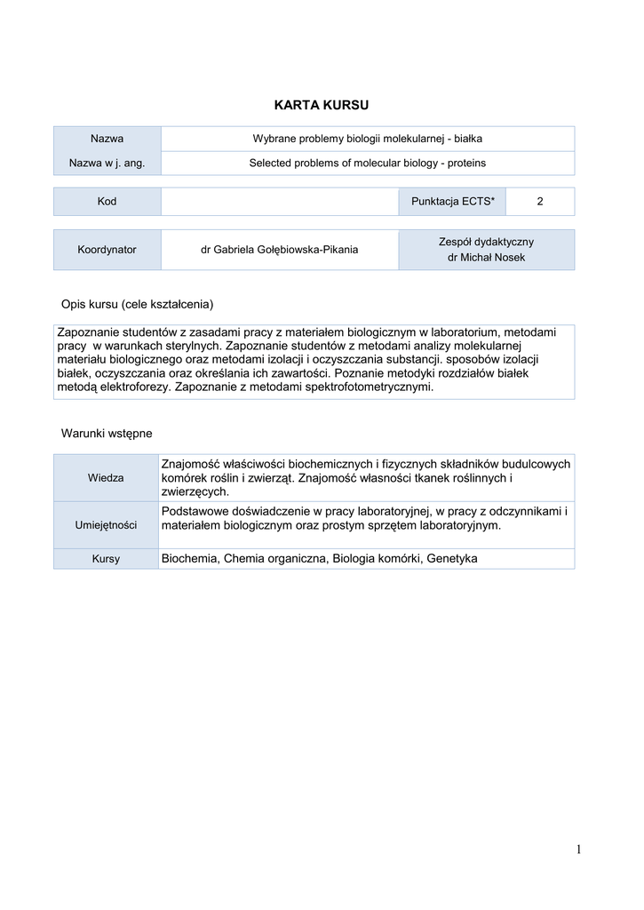KARTA KURSU Nazwa Wybrane problemy biologii molekularnej - białka Nazwa w j. ang. Selected problems of molecular biology - proteins Kod Koordynator Punktacja ECTS* dr Gabriela Gołębiowska-Pikania 2 Zespół dydaktyczny dr Michał Nosek Opis kursu (cele kształcenia) Zapoznanie studentów z zasadami pracy z materiałem biologicznym w laboratorium, metodami pracy w warunkach sterylnych. Zapoznanie studentów z metodami analizy molekularnej materiału biologicznego oraz metodami izolacji i oczyszczania substancji. sposobów izolacji białek, oczyszczania oraz określania ich zawartości. Poznanie metodyki rozdziałów białek metodą elektroforezy. Zapoznanie z metodami spektrofotometrycznymi. Warunki wstępne Wiedza Umiejętności Kursy Znajomość właściwości biochemicznych i fizycznych składników budulcowych komórek roślin i zwierząt. Znajomość własności tkanek roślinnych i zwierzęcych. Podstawowe doświadczenie w pracy laboratoryjnej, w pracy z odczynnikami i materiałem biologicznym oraz prostym sprzętem laboratoryjnym. Biochemia, Chemia organiczna, Biologia komórki, Genetyka 1 Efekty kształcenia Wiedza Efekt kształcenia dla kursu Odniesienie do efektów kierunkowych W01 Wymienia metody izolacji i oczyszczania substancji. K_W11 W02 Opisuje rodzaje, zasady i zastosowanie rozdziału elektroforetycznego. K_W11 W03 Określa rodzaje, zastosowanie i zasady rozdziałów chromatograficznych. K_W11 W04 Opisuje zasadę i zastosowanie metody hybrydyzacji Western-Blot. K_W11 W05 Potrafi opisać zasadę i zastosowanie metody SELDI-TOF i MALDI-TOF. K_W11 W06 Omawia selektywne znakowanie substancji w żywych komórkach. K_W11 W07 Zna zastosowanie białka GFP. K_W11 W08 Opisuje zasadę testu ELISA oraz metody mikromacierzy. K_W11 W09 Opisuje metody uzyskania trójwymiarowych obrazów molekuł. K_W15 W10 Przedstawia ogólne zasady bezpiecznej pracy w laboratorium oraz pracy w warunkach sterylnych. K_W11 Efekt kształcenia dla kursu U01 Poprawnie posługuje się drobnym sprzętem laboratoryjnym i aparaturą pomiarową. Umiejętności Odniesienie do efektów kierunkowych K_U01 U02 Przygotowuje odczynniki do pracy z materiałem biologicznym. K_U01; K_U04 U03 Przeprowadza izolacje i oczyszczanie białek różnymi metodami. K_U01; K_U04 U04 Wykonuje spektrofotometryczne oznaczenie zawartości białka. K_U04 U05 Przeprowadza rozdział białek metodą elektroforezy wraz z barwieniem i utrwaleniem. K_U04 U06 Dokumentuje i analizuje uzyskane foregramy. K_U05 U07 Szacuje właściwości białek na podstawie ich sekwencji aminokwasowej w bazach danych. K_U06 U08 Wykonuje spektrofotometryczny pomiar aktywności katalazy. K_U04 2 Odniesienie do efektów kierunkowych Efekt kształcenia dla kursu Kompetencje społeczne K01 Wykorzystuje udostępniony sprzęt laboratoryjny zgodnie z zaleceniami. K_K03 K02 Stosuje się do obowiązujących zasad BHP. K_K07 K03 Sprawnie realizuje powierzone zadania poprzez działanie samodzielne lub pracę w grupach. K_K05 Organizacja Forma zajęć Ćwiczenia w grupach Wykład (W) A Liczba godzin 5 K L S P E 15 Opis metod prowadzenia zajęć Wykłady obejmują podstawowe informacje na temat metod analizy molekularnej, metod izolacji i oczyszczania materiału stosowanych w biologii eksperymentalnej. Zasada i zastosowanie metody hybrydyzacji Western-Blott. Zasady i zastosowanie metody SELDI-TOF i MALDI-TOF. Selektywne znakowanie substancji w żywych komórkach. Zastosowanie białka GFP. Zasada i zastosowanie testu ELISA i metody mikromacierzy. Metody uzyskania trójwymiarowych obrazów biomolekuł. Elektroforeza - rodzaje, zasady rozdziału i zastosowanie. Chromatografia - rodzaje, zasady rozdziału i zastosowanie. Ćwiczenia mają na celu zapoznanie studenta z zasadami pracy z materiałem biologicznym, zasadami bezpiecznej pracy w laboratorium, pracy w warunkach sterylnych. Ponadto zapoznanie z prostymi metodami izolacji substancji z materiału roślinnego oraz technikami analitycznymi ze szczególnym uwzględnieniem spektrofotometrii oraz rozdziału elektroforetycznego (spektrofotometryczne oznaczenie ilości białka, rozdział metodą elektroforezy 1D SDS-PAGE wraz barwieniem, utrwalaniem i analizą wyników). 3 X W01 W02 W03 W04 W05 W06 W07 W08 W09 W10 U01 U02 U03 U04 U05 U06 U07 U08 K01 K02 K03 X X X X X X X X X X X X Kryteria oceny X X X X X X X X X Inne Egzamin pisemny Egzamin ustny Praca pisemna (esej) Referat Udział w dyskusji Projekt grupowy Projekt indywidualny Praca laboratoryjna Zajęcia terenowe Ćwiczenia w szkole Gry dydaktyczne E – learning Formy sprawdzania efektów kształcenia X X X X X X X X X X Ocena końcowa obejmuje oceny z ćwiczeń i z egzaminu (ćwiczenia 50% i egzamin 50%) Uwagi Treści merytoryczne (wykaz tematów) 1. 2. 3. 4. 5. 6. 7. 8. Podział metod analizy molekularnej materiału biologicznego. Metody izolacji i oczyszczania substancji. Elektroforeza - rodzaje, zasady rozdziału i zastosowanie. Wizualizacja i analiza rozdzielonych substancji metodą SDS PAGE i elektroforezy natywnej. Chromatografia - rodzaje, zasady rozdziału i zastosowanie. Zasada i zastosowanie metody hybrydyzacji Western-Blot. Zasady i zastosowanie metody SELDI-TOF i MALDI-TOF. Selektywne znakowanie substancji w żywych komórkach. 4 9. Zastosowanie białka GFP. 10. Zasada i zastosowanie testu ELISA i metody mikromacierzy. 11. Metody uzyskania trójwymiarowych obrazów biomolekuł. Wykaz literatury podstawowej Amersham Biosciences: Proteomics. Principles and methods, Handbook, 2004 Bio-Rad: A Methods and Product Manual, 2009 Kozik A., Rąpała-Kozik M., Guevara-Lora I.: Analiza instrumentalna w biochemii. Wybrane problemy i metody instrumentalnej biochemii analitycznej. Seria Wydawnicza Instytutu Biologii Molekularnej Uniwersytetu Jagiellońskiego, Kraków 2001 Kęcki Z.: Podstawy spektroskopii molekularnej, PWN, Warszawa 1998 Walkowiak B.: Techniki chromatografii cieczowej. Przykłady zastosowań. Amersham Pharmacia Biotech. MORPOL, Lublin 2000 Proteomika. Red. A