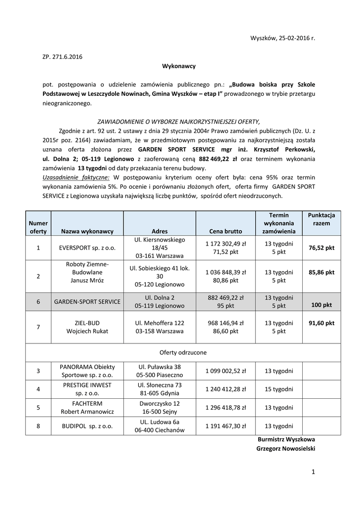Wyszków, 25-02-2016 r. ZP. 271.6.2016 Wykonawcy pot. postępowania o udzielenie zamówienia publicznego pn.: „Budowa boiska przy Szkole Podstawowej w Leszczydole Nowinach, Gmina Wyszków – etap I” prowadzonego w trybie przetargu nieograniczonego. ZAWIADOMIENIE O WYBORZE NAJKORZYSTNIEJSZEJ OFERTY, Zgodnie z art. 92 ust. 2 ustawy z dnia 29 stycznia 2004r Prawo zamówień publicznych (Dz. U. z 2015r poz. 2164) zawiadamiam, że w przedmiotowym postępowaniu za najkorzystniejszą została uznana oferta złożona przez GARDEN SPORT SERVICE mgr inż. Krzysztof Perkowski, ul. Dolna 2; 05-119 Legionowo z zaoferowaną ceną 882 469,22 zł oraz terminem wykonania zamówienia 13 tygodni od daty przekazania terenu budowy. Uzasadnienie faktyczne: W postępowaniu kryterium oceny ofert była: cena 95% oraz termin wykonania zamówienia 5%. Po ocenie i porównaniu złożonych ofert, oferta firmy GARDEN SPORT SERVICE z Legionowa uzyskała największą liczbę punktów, spośród ofert nieodrzuconych. Numer oferty Nazwa wykonawcy 1 EVERSPORT sp. z o.o. 2 Roboty ZiemneBudowlane Janusz Mróz Cena brutto Termin wykonania zamówienia 1 172 302,49 zł 71,52 pkt 13 tygodni 5 pkt Ul. Sobieskiego 41 lok. 30 05-120 Legionowo 1 036 848,39 zł 80,86 pkt 13 tygodni 5 pkt Adres Ul. Kiersnowskiego 18/45 03-161 Warszawa 6 GARDEN-SPORT SERVICE Ul. Dolna 2 05-119 Legionowo 882 469,22 zł 95 pkt 13 tygodni 5 pkt 7 ZIEL-BUD Wojciech Rukat Ul. Mehoffera 122 03-158 Warszawa 968 146,94 zł 86,60 pkt 13 tygodni 5 pkt Punktacja razem 76,52 pkt 85,86 pkt 100 pkt 91,60 pkt Oferty odrzucone 3 PANORAMA Obiekty Sportowe sp. z o.o. Ul. Puławska 38 05-500 Piaseczno 1 099 002,52 zł 13 tygodni 4 PRESTIGE INWEST sp. z o.o. Ul. Słoneczna 73 81-605 Gdynia 1 240 412,28 zł 15 tygodni 5 FACHTERM Robert Armanowicz Dworczysko 12 16-500 Sejny 1 296 418,78 zł 13 tygodni 8 BUDIPOL sp. z o.o. UL. Ludowa 6a 06-400 Ciechanów 1 191 467,30 zł 13 tygodni Burmistrz Wyszkowa Grzegorz Nowosielski 1
