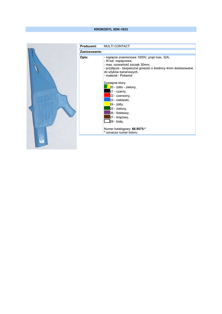 KROKODYL XDK-1033 Producent: MULTI CONTACT Zastosowanie: Opis: - napięcie znamionowe 1000V, prąd max. 32A, - III kat. napięciowa, - max. rozwartość szczęk 30mm, - przyłącze - bezpieczne gniazdo o średnicy 4mm dostosowane do wtyków bananowych, - materiał - Poliamid Dostepne klory: 20 - Ŝółto - zielony, 21 - czarny, 22 - czerwony, 23 - niebieski, 24 - Ŝółty, 25 - zielony, 26 - fioletowy, 27 - brązowy, 29 - biały, Numer katalogowy: 66.9575-* * oznacza numer koloru