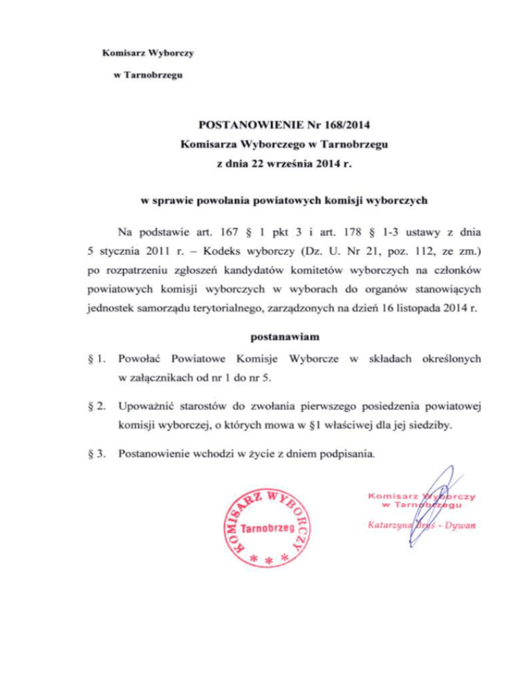 Załącznik 1 do Postanowienia Nr 168/2014 Komisarza Wyborczego w Tarnobrzegu z dnia 22 września 2014 r. Powiatowa Komisja Wyborcza w Kolbuszowej skład komisji: 1. Robert Stącel zgłoszenia dokonał: Prezes Sądu Okręgowego 2. Bogusława Anna Bryk, zam. Niwiska zgłoszenia dokonał: KW Prawo i Sprawiedliwość 3. Danuta Gacek, zam. Ostrowy Tuszowskie zgłoszenia dokonał: KW Stowarzyszenia Ostrowy 4. Anna Małgorzata Gunia, zam. Widełka zgłoszenia dokonał: KWW Forum Samorządowe 5. Agata Magdalena Kowalska, zam. Raniżów zgłoszenia dokonał: KW Polska Razem Jarosława Gowina 6. Tadeusz Franciszek Micek, zam. Kolbuszowa zgłoszenia dokonał: KWW Wspólna Inicjatywa 7. Marek Puk, zam. Majdan Królewski zgłoszenia dokonał: KWW Samorządność i Praworządność 8. Zbigniew Andrzej Woźniak, zam. Kolbuszowa zgłoszenia dokonał: KKW SLD Lewica Razem 9. Ewa Zawada-Spaczyńska, zam. Mazury zgłoszenia dokonał: KW Prawica Załącznik 2 do Postanowienia Nr 168/2014 Komisarza Wyborczego w Tarnobrzegu z dnia 22 września 2014 r. Powiatowa Komisja Wyborcza w Mielcu skład komisji: 1. Lucyna Fiołek zgłoszenia dokonał: Prezes Sądu Okręgowego 2. Marcin Daniel Cieśla, zam. Biały Bór zgłoszenia dokonał: KW PSG w Mielcu 3. Michał Dominik Dolina, zam. Mielec zgłoszenia dokonał: KWW Ruch Narodowy 4. Lidia Dorota Dubiel, zam. Mielec zgłoszenia dokonał: KW RAZEM DLA ZIEMI MIELECKIEJ 5. Natalia Małgorzata Dydo, zam. Mielec zgłoszenia dokonał: KWW "Nasz Głos w Samorządzie" 6. Paweł Rzeszuciński, zam. Mielec zgłoszenia dokonał: KWW Nowy Mielec Nowy Powiat 7. Zdzisław Władysław Stachura, zam. Mielec zgłoszenia dokonał: KKW SLD Lewica Razem 8. Tadeusz Tomaszewski, zam. Mielec zgłoszenia dokonał: KW Prawo i Sprawiedliwość 9. Wanda Ewa Trela, zam. Mielec zgłoszenia dokonał: KW Polska Razem Jarosława Gowina Załącznik 3 do Postanowienia Nr 168/2014 Komisarza Wyborczego w Tarnobrzegu z dnia 22 września 2014 r. Powiatowa Komisja Wyborcza w Nisku skład komisji: 1. Paweł Mazurkiewicz zgłoszenia dokonał: Prezes Sądu Okręgowego 2. Lucyna Bajek, zam. Nisko zgłoszenia dokonał: KWW Porozumienie Samorządowo - Gospodarcze 3. Anna Agnieszka Dudzik, zam. Nisko zgłoszenia dokonał: KWW Razem 4. Marta Kutyła, zam. Nisko zgłoszenia dokonał: KW Platforma Obywatelska RP 5. Marta Pogorzelec, zam. Nisko zgłoszenia dokonał: KWW „Ponad Podziałami” 6. Anna Marta Stelmach, zam. Nisko zgłoszenia dokonał: KW Prawo i Sprawiedliwość 7. Stanisław Stróż, zam. Nisko zgłoszenia dokonał: KWW Niżański Blok Wyborczy 8. Bartosz Dariusz Sztaba, zam. Rudnik nad Sanem zgłoszenia dokonał: KW Nowa Prawica — Janusza Korwin-Mikke 9. Izabela Maria Żuraw, zam. Nisko zgłoszenia dokonał: KWW Porozumienie Prawicy w Nisku Załącznik 4 do Postanowienia Nr 168/2014 Komisarza Wyborczego w Tarnobrzegu z dnia 22 września 2014 r. Powiatowa Komisja Wyborcza w Stalowej Woli skład komisji: 1. Joanna Szewczyk zgłoszenia dokonał: Prezes Sądu Okręgowego 2. Anna Magdalena Bajdas, zam. Jastkowice zgłoszenia dokonał: KWW Niezależne Porozumienie Samorządowe 3. Dominika Wiktoria Karbarz, zam. Stalowa Wola zgłoszenia dokonał: KWW Forum Mieszkańców Powiatu 4. Karolina Paulina Łoin, zam. Pysznica zgłoszenia dokonał: KW Nowa Prawica — Janusza Korwin-Mikke 5. Andrzej Piotr Przybycień, zam. Stalowa Wola zgłoszenia dokonał: KKW SLD Lewica Razem 6. Michał Andrzej Rutkowski, zam. Stalowa Wola zgłoszenia dokonał: KWW Lokalni Razem 7. Zofia Trajer, zam. Stalowa Wola zgłoszenia dokonał: KW Prawo i Sprawiedliwość 8. Dorota Barbara Warchoł, zam. Stalowa Wola zgłoszenia dokonał: KW Polska Razem Jarosława Gowina Załącznik 5 do Postanowienia Nr 168/2014 Komisarza Wyborczego w Tarnobrzegu z dnia 22 września 2014 r. Powiatowa Komisja Wyborcza w Tarnobrzegu skład komisji: 1. Karolina Barańska-Fundament zgłoszenia dokonał: Prezes Sądu Okręgowego 2. Monika Bernat-Rębisz, zam. Wydrza zgłoszenia dokonał: KWW Porozumienie Prawicy 3. Lidia Teresa Burdzy, zam. Zabrnie zgłoszenia dokonał: KW Nowa Prawica — Janusza Korwin-Mikke 4. Zbigniew Adam Marek, zam. Dąbrowica zgłoszenia dokonał: Komitet Wyborczy PSL 5. Krzysztof Władysław Michałów, zam. Nowa Dęba zgłoszenia dokonał: KKW SLD Lewica Razem 6. Mirosława Olbrycht-Grębowiec, zam. Nowa Dęba zgłoszenia dokonał: KWW Forum Powiatu Tarnobrzeskiego 7. Andrzej Stanisław Rękas, zam. Sokolniki zgłoszenia dokonał: KW Platforma Obywatelska RP 8. Dawid Wojciech Rusin, zam. Skopanie zgłoszenia dokonał: KW Polska Razem Jarosława Gowina