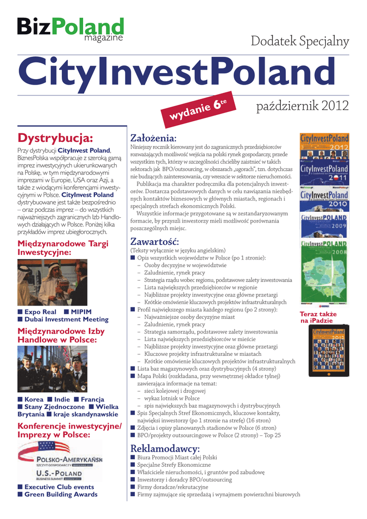 Dodatek Specjalny CityInvestPoland te nie 6 a d y w Dystrybucja: Przy dystrybucji CityInvest Poland, BiznesPolska współpracuje z szeroką gamą imprez inwestycyjnych ukierunkowanych na Polskę, w tym międzynarodowymi imprezami w Europie, USA oraz Azji, a także z wiodącymi konferencjami inwestycyjnymi w Polsce. CityInvest Poland dystrybuowane jest także bezpośrednio – oraz podczas imprez – do wszystkich najważniejszych zagranicznych Izb Handlowych działających w Polsce. Poniżej kilka przykładów imprez ubiegłorocznych. Międzynarodowe Targi Inwestycyjne: ■ Expo Real ■ MIPIM ■ Dubai Investment Meeting Międzynarodowe Izby Handlowe w Polsce: ■ Korea ■ Indie ■ Francja ■ Stany Zjednoczone ■ Wielka Brytania ■ kraje skandynawskie Konferencje inwestycyjne/ Imprezy w Polsce: październik 2012 Założenia: Niniejszy rocznik kierowany jest do zagranicznych przedsiębiorców rozważających możliwość wejścia na polski rynek gospodarczy, przede wszystkim tych, którzy w szczególności chcieliby zaistnieć w takich sektorach jak BPO/outsourcing, w obszarach „ugorach”, tzn. dotychczas nie budzących zainteresowania, czy wreszcie w sektorze nieruchomości. Publikacja ma charakter podręcznika dla potencjalnych inwestorów. Dostarcza podstawowych danych w celu nawiązania niezbędnych kontaktów biznesowych w głównych miastach, regionach i specjalnych strefach ekonomicznych Polski. Wszystkie informacje przygotowane są w zestandaryzowanym formacie, by przyszli inwestorzy mieli możliwość porównania poszczególnych miejsc. Zawartość: (Teksty wyłącznie w języku angielskim) ■ Opis wszystkich województw w Polsce (po 1 stronie): – Osoby decyzyjne w województwie – Zaludnienie, rynek pracy – Strategia rządu wobec regionu, podstawowe zalety inwestowania – Lista największych przedsiębiorców w regionie – Najbliższe projekty inwestycyjne oraz główne przetargi – Krótkie omówienie kluczowych projektów infrastrukturalnych ■ Profil największego miasta każdego regionu (po 2 strony): – Najważniejsze osoby decyzyjne miast – Zaludnienie, rynek pracy – Strategia samorządu, podstawowe zalety inwestowania – Lista największych przedsiębiorców w mieście – Najbliższe projekty inwestycyjne oraz główne przetargi – Kluczowe projekty infrastrukturalne w miastach – Krótkie omówienie kluczowych projektów infrastrukturalnych ■ Lista baz magazynowych oraz dystrybucyjnych (4 strony) ■ Mapa Polski (rozkładana, przy wewnętrznej okładce tylnej) zawierająca informacje na temat: – sieci kolejowej i drogowej – wykaz lotnisk w Polsce – spis największych baz magazynowych i dystrybucyjnych ■ Spis Specjalnych Stref Ekonomicznych, kluczowe kontakty, najwięksi inwestorzy (po 1 stronie na strefę) (16 stron) ■ Zdjęcia i opisy planowanych stadionów w Polsce (6 stron) ■ BPO/projekty outsourcingowe w Polsce (2 strony) – Top 25 Reklamodawcy: ■ Executive Club events ■ Green Building Awards ■ ■ ■ ■ ■ ■ Biura Promocji Miast całej Polski Specjalne Strefy Ekonomiczne Właściciele nieruchomości, i gruntów pod zabudowę Inwestorzy i doradcy BPO/outsourcing Firmy doradcze/rekrutacyjne Firmy zajmujące się sprzedażą i wynajmem powierzchni biurowych Kontakt: BiznesPolska Media sp. z o.o. ul. Długa 44/50, bud. D, lok 704, 00-241 Warszawa tel.: 022 831 7062 Thom Barnhardt tel.: 022 831 7062; komórka: (0-508) 143 963 [email protected] Magdalena Adamczyk tel.: 022 831 7062; [email protected] Wiktor Gliński tel.: 022 831 7062; [email protected] BiznesPolska Media jest wydawcą: portali internetowych: Przewodników Biznesowych: ■ Firmy świadczące usługi finansowe,leasingowe (samochody, urządzenia przemysłowe, sprzęt biurowy np. kserokopiarki, wyposażenie telekomunikacyjne itp.) banki, firmy świadczące usługi rachunkowe, podatkowe, doradztwo prawne, konsultingowe, ubezpieczenia gospodarcze, firmy komputerowe (sprzęt i oprogramowanie), Telekomy, Internet Grupa docelowa: ■ Zagraniczni inwestorzy rozważający możliwość przeniesienia outsoucingu lub budowy fabryk do Polski ■ Inwestorzy z branży komercyjnych nieruchomości szukający działek budowlanych lub innych nieruchomości lub firm wystawionych na sprzedaż przez władze miast na terenie całej Polski ■ Międzynarodowe korporacje rozważające inwestowanie FDI – z Azji, Indii, Ameryki Południowej oraz Europy Wschodniej globalne Dystrybucja: Nakład – 8 000 egzemplarzy 4 000 – Dystrybucja podczas międzynarodowych targów inwestycji i Nieruchomości, włącznie z ExpoReal w Monachium w październiku 2012, MIPIM, MAPIC 1 000 – wraz z egzemplarzami subskrybcyjnymi miesięczników BizPoland Magazine. 1 000 – konferencje biznesowe w Warszawie (IV kwartał 2012 – 2013). 2 000 – Dystrybucja w polskich miastach, w biurach, jak również poprzez Międzynarodowe Stowarzyszenie Izb Handlowych (ICC) oraz PAIIZ. Internetowa dystrybucja On-Line w postaci darmowych plików PDF realizowana poprzez nasze portale internetowe. (PDF w językach: niemieckim, japońskim, koreańskim bądź hiszpańskim mogą zostać przygotowane za indywidualnie ustaloną opłatą): BizPoland.pl – język angielski BiznesPolska.pl – język polski Układ graficzny oraz szczegóły techniczne: Objętość: 80-96 stron (pełny kolor); format po obcięciu A4; Okładka błyszcząca; Pełny kolor. Ceny reklam*: Sponsor Główny: 19,500 zł (obejmuje: Okładkę tylną; 1 pełną stronę wewnątrz; logo, na okładce przedniej oraz na marginesach wszystkich stron redakcyjnych) Rozkładówka: 16,500 PLN Pełna strona wewnętrzna: 12,500 PLN. Wewnętrzna okładka przednia: 16,500 PLN Pół strony: 7,500 PLN * Ceny nie obejmują podatku VAT Terminy: Rezerwacja reklam: 15 września 2012 Dostarczenie materiałów: 25 września 2012 W dystrybucji od: 1 października 2012 miesięcznika: Rozmiary reklam: Dane techniczne: Rozkładówka: 420 mm x 297 mm (+ 5 mm spadu) Pełna 