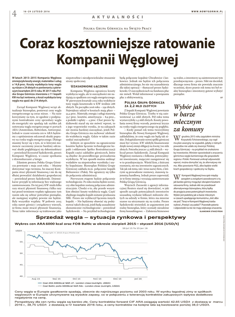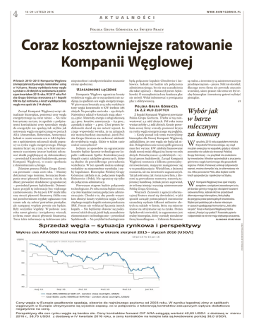 4 W W W.NOW YGORNIK.PL 16 –29 L U T E G O 2016 A K T U A L N O Ś C I Polska Grupa Górnicza na Święto Pracy Coraz kosztowniejsze ratowanie Kompanii Węglowej Zarząd Kompanii Węglowej wciąż aktualizuje biznesplan, ponieważ ceny węgla energetycznego są coraz niższe. – Na razie korzystamy na tym, że zgodnie z podpisanymi kontraktami ceny sprzedaży węgla do energetyki nie spadają tak szybko jak notowania węgla energetycznego w portach ARA (Amsterdam, Rotterdam, Antwerpia). Jednak w czasie wzrostu cen w ARA będziemy z opóźnieniem odczuwali skutki poprawy na rynku węgla energetycznego. Dlatego musimy liczyć się z tym, że w którymś momencie zaczniemy jeszcze bardziej odczuwać skutki pogłębiającej się dekoniunktury – powiedział Krzysztof Sędzikowski, prezes Kompanii Węglowej, w czasie spotkania z dziennikarzami 4 lutego. Zdaniem prezesa Polska Grupa Górnicza powstanie 1 maja 2016 roku. – Musimy dotrzymać tego terminu, bo inaczej Kompania straci płynność finansową i nie da się dłużej prowadzić działalności gospodarczej – powiedział prezes Sędzikowski. Dziennikarze przyjęli tę informację bez większego zainteresowania. Do tej pory KW miała kilka razy stracić płynność finansową i kilka razy tuż przed terminem wypłaty ogłaszano: tym razem uda się zebrać potrzebne pieniądze, ale następnej wypłaty pewnie nie będzie. Były wszystkie wypłaty. W połowie 2015 roku nawet górnicy i związkowcy wierzyli, że firma może stracić płynność finansową. Teraz takie informacje są traktowane jako niepotrzebne i nieodpowiedzialne straszenie strony społecznej. U zasadnione łączenie Kompania Węglowa ogranicza koszty wydobycia węgla, ale te oszczędności nie nadążają za spadkiem cen węgla energetycznego. W pierwszym kwartale 2015 roku wydobycie tony węgla kosztowało w KW średnio 288 złotych. Na początku 2016 roku – 259 złotych. Największy udział w kosztach mają płace – 53,4 proc. Materiały, energia i usługi stanowią 33,7 proc. kosztów, amortyzacja – 8,9 proc., a podatki i opłaty – 4 proc. Choć prezes Sędzikowski starał się nie mówić wprost, to z jego wypowiedzi wynika, że na zakupach nie można bardziej oszczędzać, jeżeli Polska Grupa Górnicza ma zachować zdolność do wydobycia węgla. Gdzie w takim razie szukać oszczędności? Jednym ze sposobów na ograniczenie kosztów będzie łączenie technologiczne kopalń i oddawanie Spółce Restrukturyzacji Kopalń części zakładów górniczych, które są zbędne do prawidłowego prowadzenia wydobycia. W ten sposób można uniknąć wydatków na niepotrzebne wyrobiska i szyby kopalniane. Biznesplan Polskiej Grupy Górniczej zakłada m.in. połączenie kopalń Bielszowice i Pokój. Nie ograniczy się tylko do połączenia administracji. Pierwszym etapem będzie połączenie technologiczne. Po roku można będzie ocenić, czy obie kopalnie zostaną połączone administracyjnie. Chodzi o to, aby przede wszystkim obniżyć koszty wydobycia węgla. Część zbędnego majątku kopalń zostanie przekazana SRK. Prezes nie wykluczył łączenia innych kopalń. – Nie będziemy obawiać się podejmować takich decyzji, jeżeli będą uzasadnione ekonomicznie i technologicznie – powiedział Sędzikowski. – Na przykład technologicznie będą połączone kopalnie Chwałowice i Jankowice. Jednak nie będzie ich połączenia administracyjnego, bo nie ma uzasadnienia dla takiej operacji – tłumaczył prezes Sędzikowski. O oszczędnościach na funduszu płac nie mówił. Wolał informować o powiązaniu płac z efektywnością. P olska G rupa G órnicza za 2,2 mld złotych Z kopalń Kompanii Węglowej powstanie Polska Grupa Górnicza. Trzeba w nią zainwestować 2,2 mld złotych. Pół roku temu wystarczyłoby 1,5 mld złotych. Koszty powołania nowej firmy wzrosły, ponieważ kryzys na rynku węgla energetycznego się pogłębia. – Kiedy ponad rok temu tworzyliśmy biznesplan dla Nowej Kompanii Węglowej, zakładaliśmy, że ceny węgla nie będą tak niskie. Dokapitalizowanie nowej spółki górniczej musi być wyższe. KW zdobyła finansowanie dzięki nowej emisji obligacji na kwotę 700 mln złotych. Potrzeba jeszcze 1,5 mld złotych – wyliczał prezes Sędzikowski. Zarząd Kompanii Węglowej rozmawia z kilkoma potencjalnymi inwestorami, mającymi zaangażować się w to przedsięwzięcie. Wśród firm, z którymi rozmawia, nie ma inwestorów zagranicznych. Tak jak rok temu, tak i teraz nazwy firm, z którymi są prowadzone rozmowy, stanowią tajemnicę handlową. Jednak prezes zapewniał, że te firmy istnieją i wyrażają zainteresowanie Polską Grupą Górniczą. Wojciech Żurawski z agencji informacyjnej Reuters starał się dowiedzieć, w jaki sposób zarządy potencjalnych inwestorów uzasadnią wydanie kilkuset milionów złotych na udziały w firmie, która ma mizerne szanse na utrzymanie się na rynku. Prezes Sędzikowski stwierdził, że argumentem jest realny biznesplan, który oceniały niezależne firmy konsultingowe. – Założenia biznesowe są realne, a inwestorzy są zainteresowani tym przedsięwzięciem – prezes. Nikt nie dociekał, dlaczego nowa firma nie powstała znacznie wcześniej, skoro prawie rok temu też był realny biznesplan i inwestorzy gotowi wyłożyć pieniądze. ST Wybór jak w barze mlecznym za komuny W grudniu 2015 roku zapytałem ministra Krzysztofa Tchórzewskiego, czy rząd ma plan awaryjny na wypadek, gdyby z różnych powodów nie udało się stworzyć Polskiej Grupy Górniczej – na przykład nie znaleziono by inwestorów. Minister opowiedział o znaczeniu górnictwa węgla kamiennego dla gospodarki regionu i Polski. Ponieważ uniknął odpowiedzi wprost, można domyślać się, że alternatywy nie ma. Albo powstanie PGG, albo będzie wielki krach gospodarczy i społeczny na Śląsku. W Kompanii Węglowej trwa spór między zarządem a związkami zawodowymi o to, jak bardzo górnicy mogą być obci