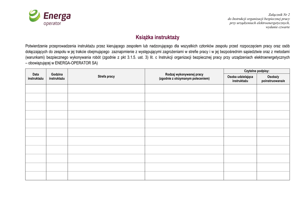 Załącznik Nr 2 do Instrukcji organizacji bezpiecznej pracy przy urządzeniach elektroenergetycznych, wydanie czwarte Książka instruktaży Potwierdzenie przeprowadzenia instruktażu przez kierującego zespołem lub nadzorującego dla wszystkich członków zespołu przed rozpoczęciem pracy oraz osób dołączających do zespołu w jej trakcie obejmującego zaznajomienie z występującymi zagrożeniami w strefie pracy i w jej bezpośrednim sąsiedztwie oraz z metodami (warunkami) bezpiecznego wykonywania robót (zgodnie z pkt 3.1.5. ust. 3) lit. c Instrukcji organizacji bezpiecznej pracy przy urządzeniach elektroenergetycznych – obowiązującej w ENERGA-OPERATOR SA) Data instruktażu Godzina instruktażu Strefa pracy Rodzaj wykonywanej pracy (zgodnie z otrzymanym poleceniem) Czytelne podpisy: Osoba udzielająca instruktażu Osoba/y poinstruowana/e