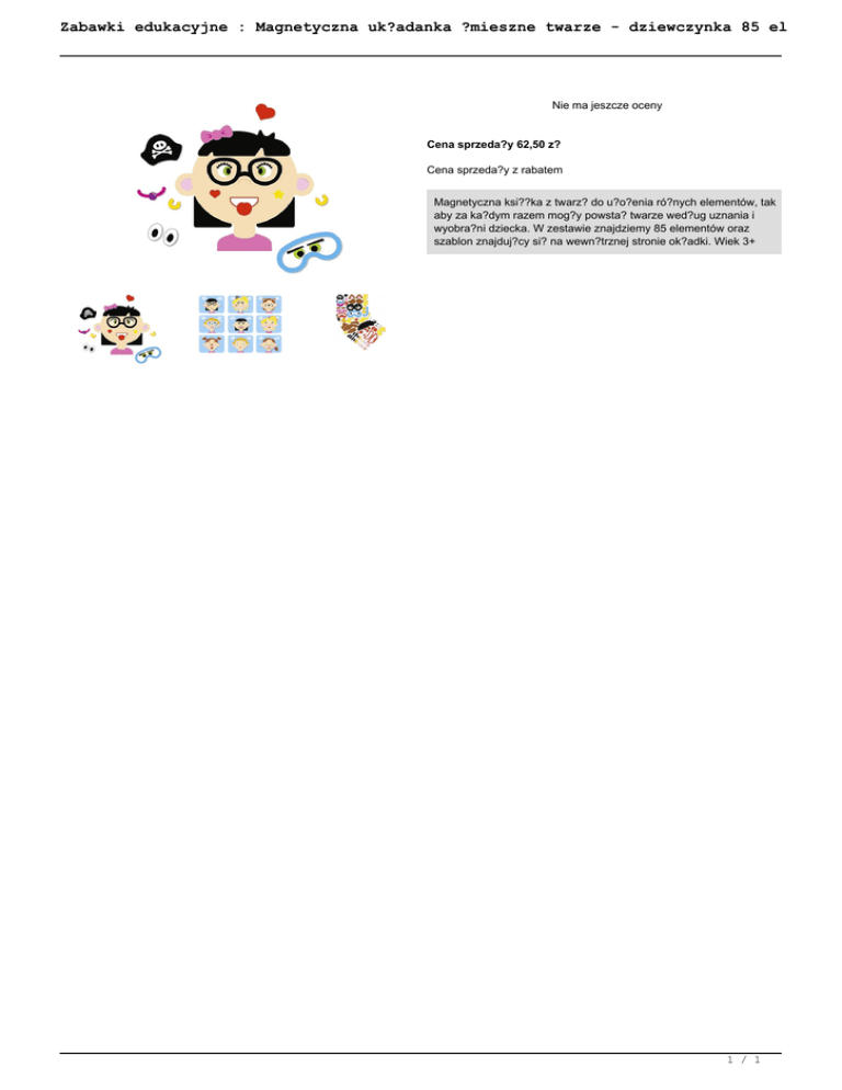 Zabawki edukacyjne : Magnetyczna uk?adanka ?mieszne twarze - dziewczynka 85 el Nie ma jeszcze oceny Cena sprzeda?y 62,50 z? Cena sprzeda?y z rabatem Magnetyczna ksi??ka z twarz? do u?o?enia ró?nych elementów, tak aby za ka?dym razem mog?y powsta? twarze wed?ug uznania i wyobra?ni dziecka. W zestawie znajdziemy 85 elementów oraz szablon znajduj?cy si? na wewn?trznej stronie ok?adki. Wiek 3+ 1 / 1 Powered by TCPDF (www.tcpdf.org)