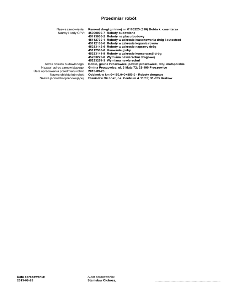 Przedmiar robót Nazwa zamówienia: Nazwy i kody CPV: Adres obiektu budowlanego: Nazwa i adres zamawiającego: Data opracowania przedmiaru robót: Nazwa obiektu lub robót: Nazwa jednostki opracowującej: Data opracowania: 2013-09-25 Remont drogi gminnej nr K160225 (310) Bobin k. cmentarza 45000000-7 Roboty budowlane 45113000-2 Roboty na placu budowy 45112730-1 Roboty w zakresie kształtowania dróg i autostrad 45112100-6 Roboty w zakresie kopania rowów 45233142-6 Roboty w zakresie naprawy dróg 45112500-0 Usuwanie gleby 45233141-9 Roboty w zakresie konserwacji dróg 45233223-8 Wymiana nawierzchni drogowej 45233251-3 Wymiana nawierzchni Bobin, gmina Proszowice, powiat proszowicki, woj. małopolskie Gmina Proszowice, ul. 3 Maja 72; 32-100 Proszowice 2013-09-25 Odcinek w km 0+150,0÷0+850,0 - Roboty drogowe Stanisław Cichosz, os. Centrum A 11/35; 31-925 Kraków Autor opracowania: Stanisław Cichosz, .................................................................................... Remont drogi gminnej nr K160225 (310) Bobin - przedmiar robót ZUZIA11 (C) Datacomp 1994-2013 (lic. 0004DACB) strona nr: 2 Spis działów przedmiaru robót Nr 1 1.1 1.2 1.3 1.4 1.5 1.6 1.7 2 2.1 2.2 2.3 2.4 2.5 2.6 2.7 2.8 3 3.1 3.2 3.3 3.4 3.5 3.6 3.7 4 4.1 Nazwa działu robót Kody CPV: 45113000-2 Roboty na placu budowy 45112000-5 Roboty w zakresie usuwania gleby 45113000-2 Roboty na placu budowy 45112730-1 Roboty w zakresie kształtowania dróg i autostrad Roboty przygotowawcze. Kody CPV: 45113000-2 Roboty na placu budowy Opracowanie tymczasowejorganizacji ruchu na czas wykonania remontu, wraz z ustawieniem i demontażem oznakowania. Kody CPV: 45113000-2 Roboty na placu budowy Roboty pomiarowe przy liniowych robotach ziemnych, trasa dróg w terenie równinnym Kody CPV: 45112730-1 Roboty w zakresie kształtowania dróg i autostrad Mechaniczne ścinanie drzew z karczowaniem pni, średnice drzew 26-35˙cm Kody CPV: 45112730-1 Roboty w zakresie kształtowania dróg i autostrad Mechaniczne karczowanie, zagajniki średnie (od 31-60 % powierzchni) Kody CPV: 45112730-1 Roboty w zakresie kształtowania dróg i autostrad Wywożenie dłużyc, karpiny i gałęzi, transport dłużyc na odległość do 2˙km Kody CPV: 45112730-1 Roboty w zakresie kształtowania dróg i autostrad Wywożenie dłużyc, karpiny i gałęzi, dodatek do kolumny 01, za każdy 1˙km odległości transportu Kody CPV: 45113000-2 Roboty na placu budowy Usunięcie i spalenie pozostałości po karczowaniu, drągowina, karcze, gałęzie i resztki z drzew (bez względu na średnicę) Kody CPV: 45112000-5 Roboty w zakresie usuwania gleby 45233000-9 Roboty w zakresie konstruowania, fundamentowania oraz wykonywania nawierzchni autostrad, dróg 45112100-6 Roboty w zakresie kopania rowów 45233142-6 Roboty w zakresie naprawy dróg Roboty rozbiórkowe Kody CPV: 45112100-6 Roboty w zakresie kopania rowów Rozebranie przepustów rurowych, rury betonowe Fi˙60˙cm Kody CPV: 45233142-6 Roboty w zakresie naprawy dróg Rozebranie nawierzchni z mieszanek mineralno-bitumicznych, mechanicznie, grubość nawierzchni 3˙cm Kody CPV: 45233142-6 Roboty w zakresie naprawy dróg Rozebranie nawierzchni z mieszanek mineralno-bitumicznych, mechanicznie, dodatek za każdy dalszy 1˙cm Kody CPV: 45233142-6 Roboty w zakresie naprawy dróg Rozebranie podbudowy, z kruszywa kamiennego mechanicznie, grubość podbudowy 15˙cm Kody CPV: 45233142-6 Roboty w zakresie naprawy dróg Rozebranie przepustów rurowych, ścianki czołowe i ławy betonowe Kody CPV: 45112100-6 Roboty w zakresie kopania rowów Wywiezienie gruzu z terenu rozbiórki przy mechanicznym załadowaniu i wyładowaniu, załadowanie koparko-ładowarką samochodów samowyładowczych, przy obsłudze 3 samochodów na zmianę Kody CPV: 45112100-6 Roboty w zakresie kopania rowów Wywiezienie gruzu z terenu rozbiórki przy mechanicznym załadowaniu i wyładowaniu, transport samochodem samowyładowczym na odległość 1 km Kody CPV: 45112100-6 Roboty w zakresie kopania rowów Wywiezienie gruzu z terenu rozbiórki przy mechanicznym załadowaniu i wyładowaniu, nakłądy uzupełniające na każdy dalszy rozpoczęty 1˙km ponad 1˙km transportu Kody CPV: 45112000-5 Roboty w zakresie usuwania gleby 45112100-6 Roboty w zakresie kopania rowów 45112500-0 Usuwanie gleby Roboty ziemne Kody CPV: 45112100-6 Roboty w zakresie kopania rowów Roboty ziemne wykonywane koparkami podsiębiernymi, z transportem urobku samochodami samowyładowczymi na odległość do 1˙km, koparka 0,40 m3, kategoria gruntu III-IV Kody CPV: 45112100-6 Roboty w zakresie kopania rowów Nakłady uzupełniające do tablic za każdy dalszy rozpoczęty 1 km odległości transportu ponad 1 km samochodami samowyładowczymi, drogi o nawierzchni utwardzonej, kategoria gruntu I-IV, samochód 5-10˙t Kody CPV: 45112100-6 Roboty w zakresie kopania rowów Naprawy dróg gruntowych oraz plantowanie poboczy, plantowanie poboczy wykonywane mechanicznie, grubość ścinania 20˙cm Kody CPV: 45112100-6 Roboty w zakresie kopania rowów Naprawy dróg gruntowych oraz plantowanie poboczy, plantowanie poboczy wykonywane mechanicznie, grubość ścinania 10˙cm Kody CPV: 45112500-0 Usuwanie gleby Ścinanie poboczy mechanicznie, grubości do 10˙cm, dodatek za każde dalsze rozpoczęte 0,5˙km transportu ponad 1˙km Kody CPV: 45112100-6 Roboty w zakresie kopania rowów Oczyszczanie rowów i przepustów z namułu, rowy, z wyprofilowaniem dna i skarp, grubość namułu 10˙cm, wyprofilowanie umocnionego dna rowu. Kody CPV: 45112100-6 Roboty w zakresie kopania rowów Oczyszczanie rowów i przepustów z namułu, przepust Fi 0,8˙m, grubość namułu do 50% jego średnicy Kody CPV: 45233000-9 Roboty w zakresie konstruowania, fundamentowania oraz wykonywania nawierzchni autostrad, dróg 45233142-6 Roboty w zakresie naprawy dróg 45233141-9 Roboty w zakresie konserwacji dróg 45233223-8 Wymiana nawierzchni drogowej Nawierzchnia Kody CPV: 45233142-6 Roboty w zakresie naprawy dróg Mechaniczne cię